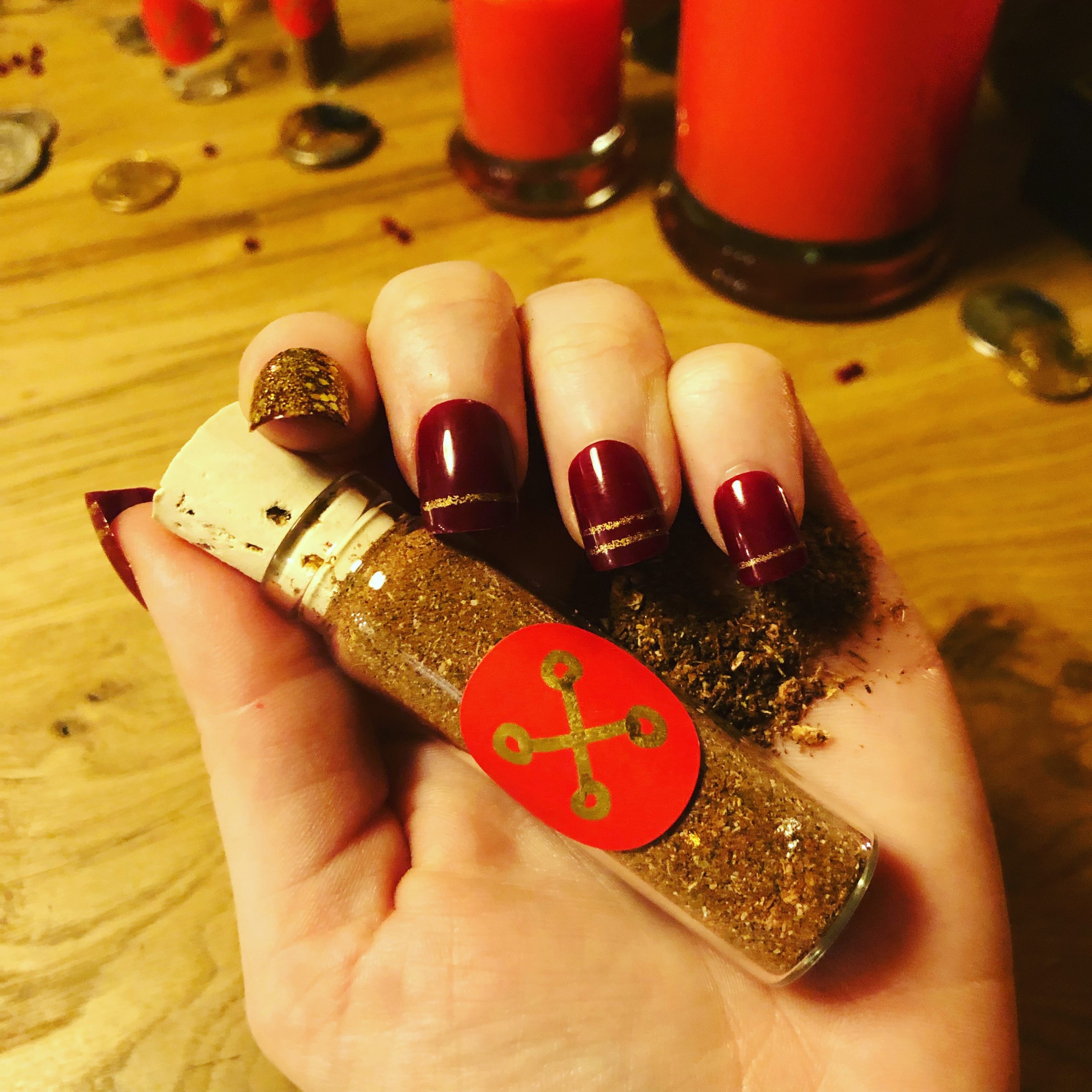 Milk thistle seeds and plant matter, ruby, bull horn, genuine gold, silver, and copper leaf, alongside other herbs allied to the principles of strength, income generation, material command, and personal Sovereignty, frankincense and myrrh resin, dragon’s blood, essential oils. Ritually combined during an Aldebaran election heavily supported by Jupiter in Sagittarius in the Greater Benefic’s hour, and later ground after a lunar cycle of incubation, also on Jupiter’s day and hour.