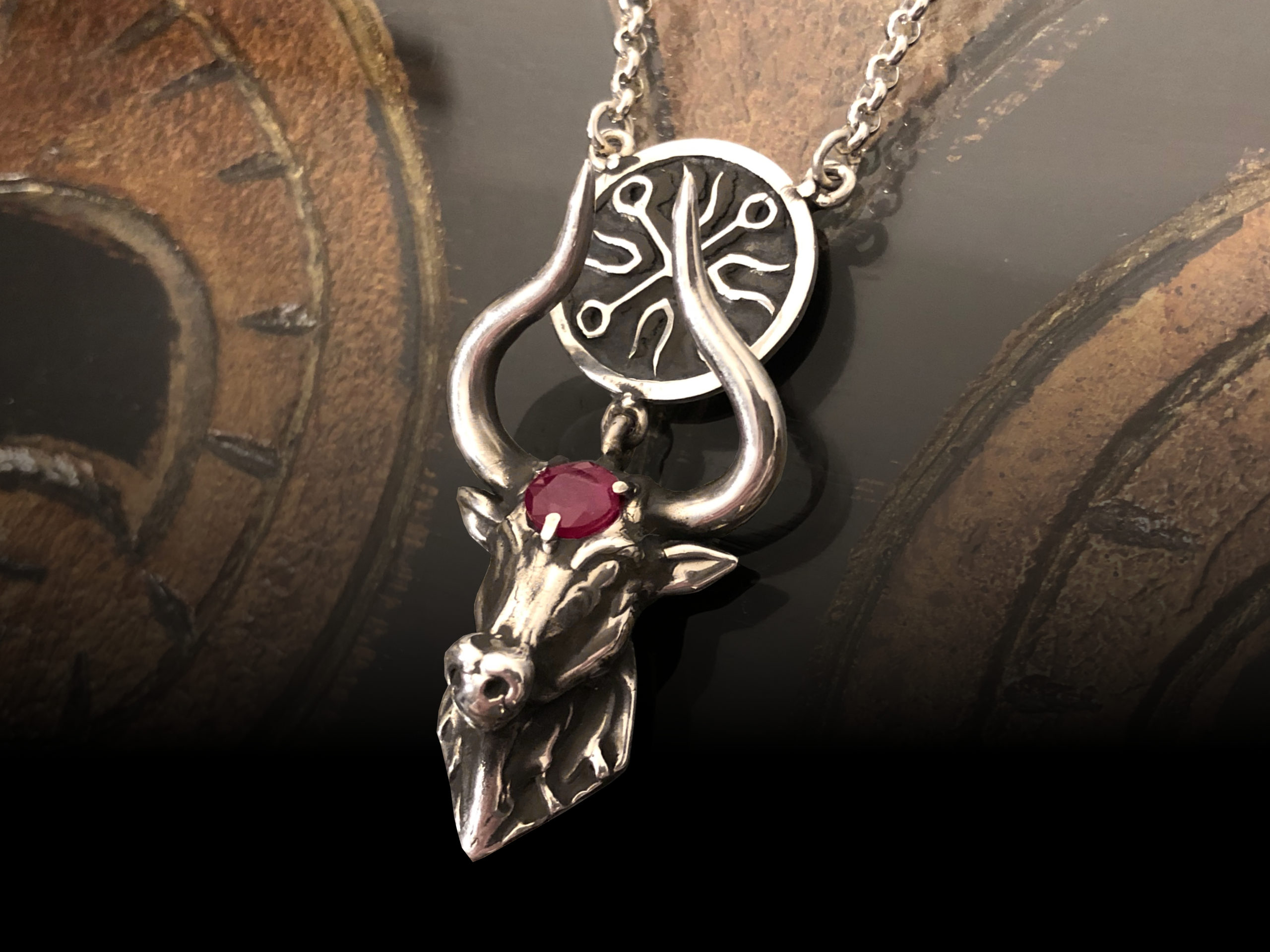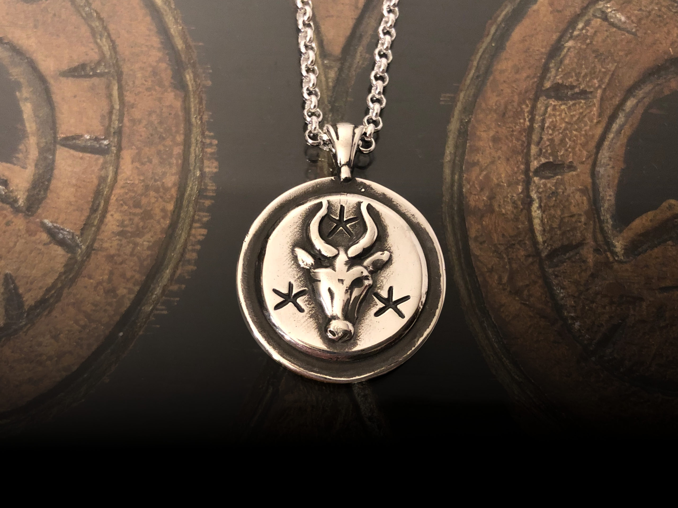 A thick pendant cast of molten silver and a small portion of gold, bearing the image of a celestial bull. The reverse holds an electrum disk (80/20 alloy of gold and silver) engraved with the symbol of the fixed star, set over an interior made to house sympathetic materia: crushed ruby, frankincense, and the [thorns, silk, and seed] of milky thistle harvested on a previous Aldebaran election.