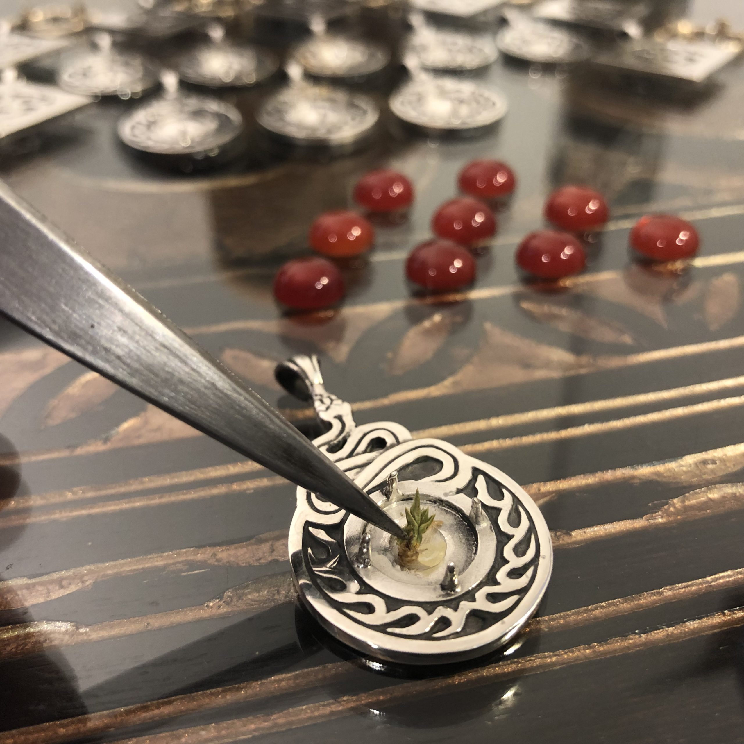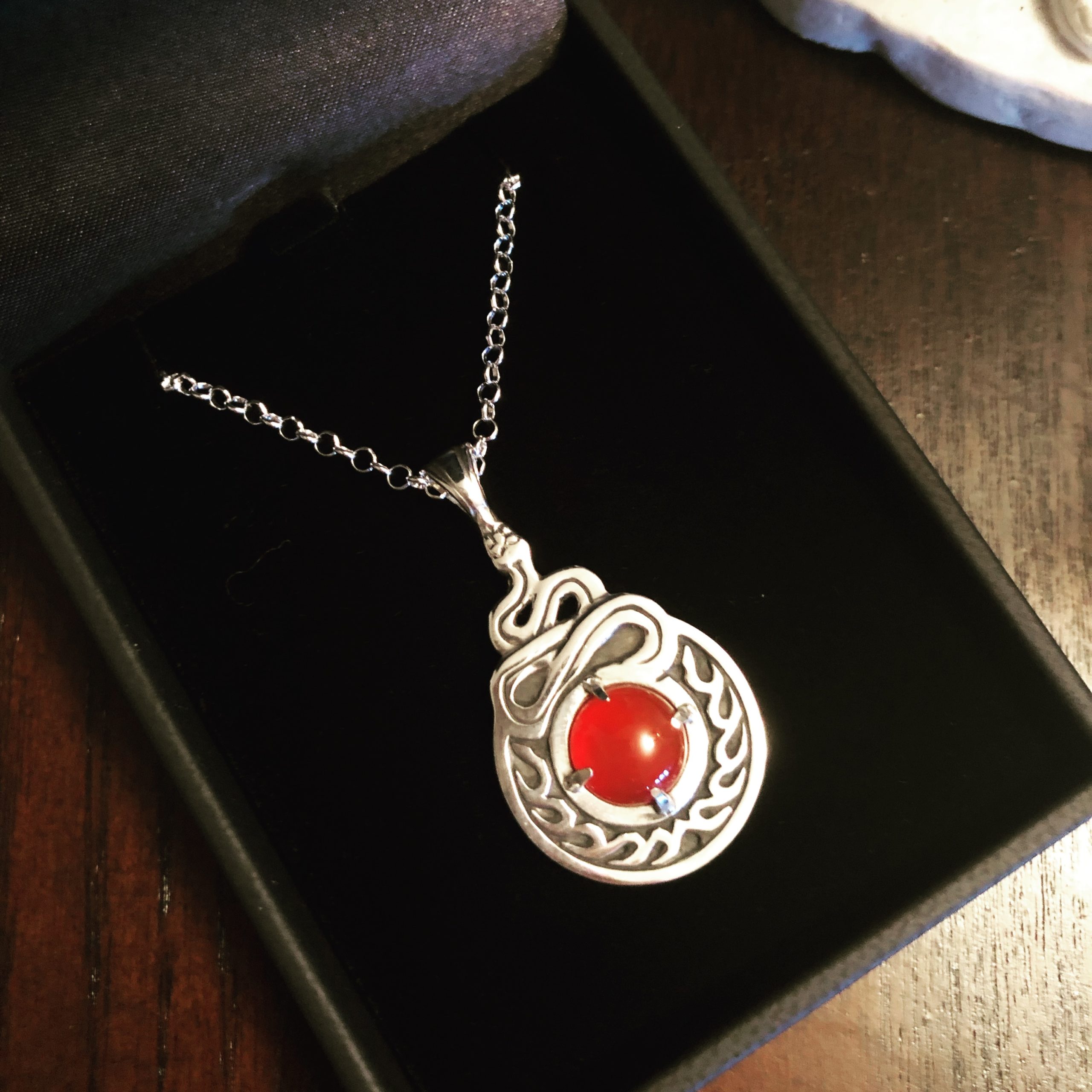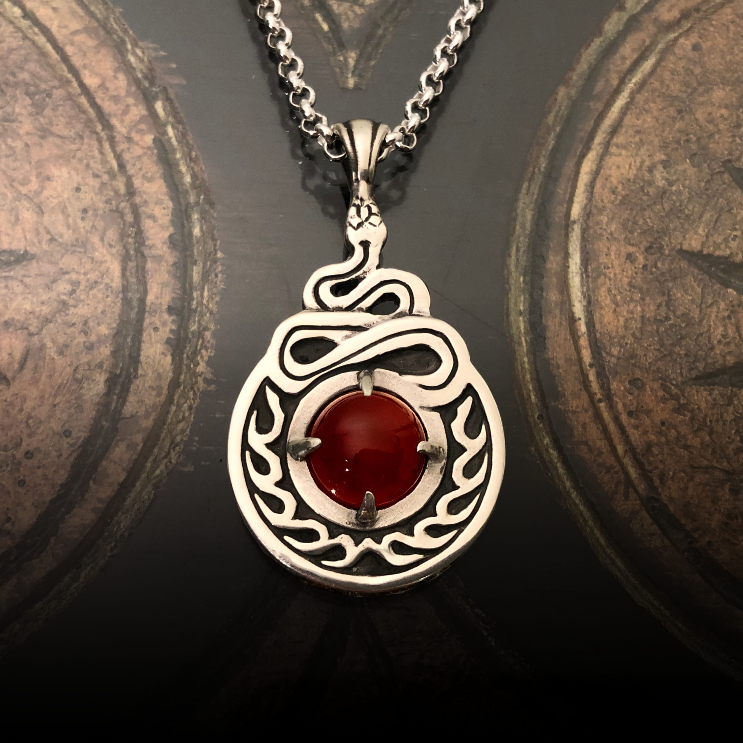 Available in your choice of standard electrum, 4ct carnelian, herbs and viper’s tongue inlaid for $729 (8 being offered to the public), or ornate electrum with gold accenting, 20ct carnelian, snake backing design, herbs and viper’s tongue inlaid into the bezel for $1,029 (7 being offered to the public).