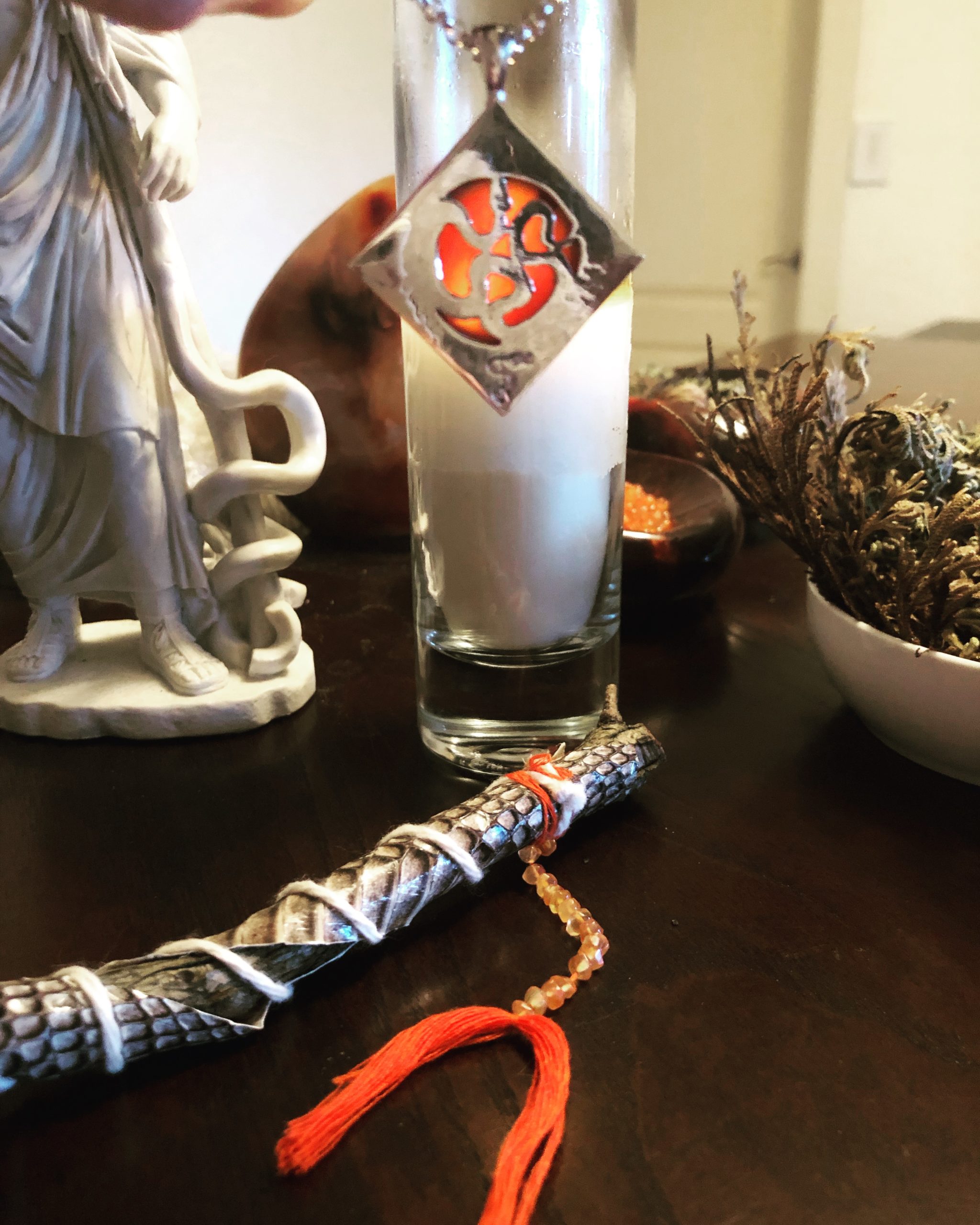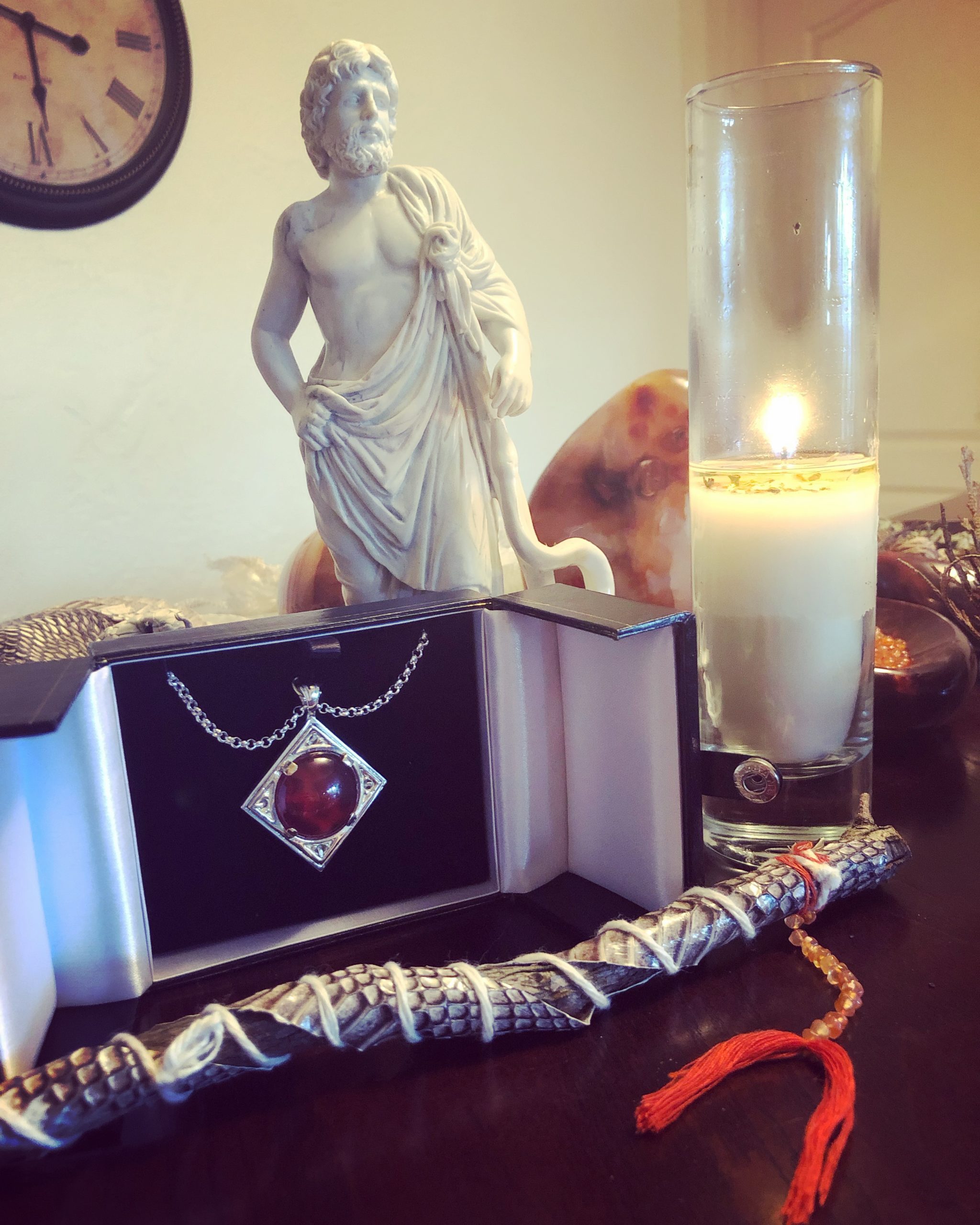 Each talisman includes a 20” sterling silver chain, and a beautiful keepsake box bearing a wax seal of the Asclepius rod. It includes a bottle of Asclepius II anointing oil, recommended times for feeding and empowering your talisman, and a prayer to Asclepius.