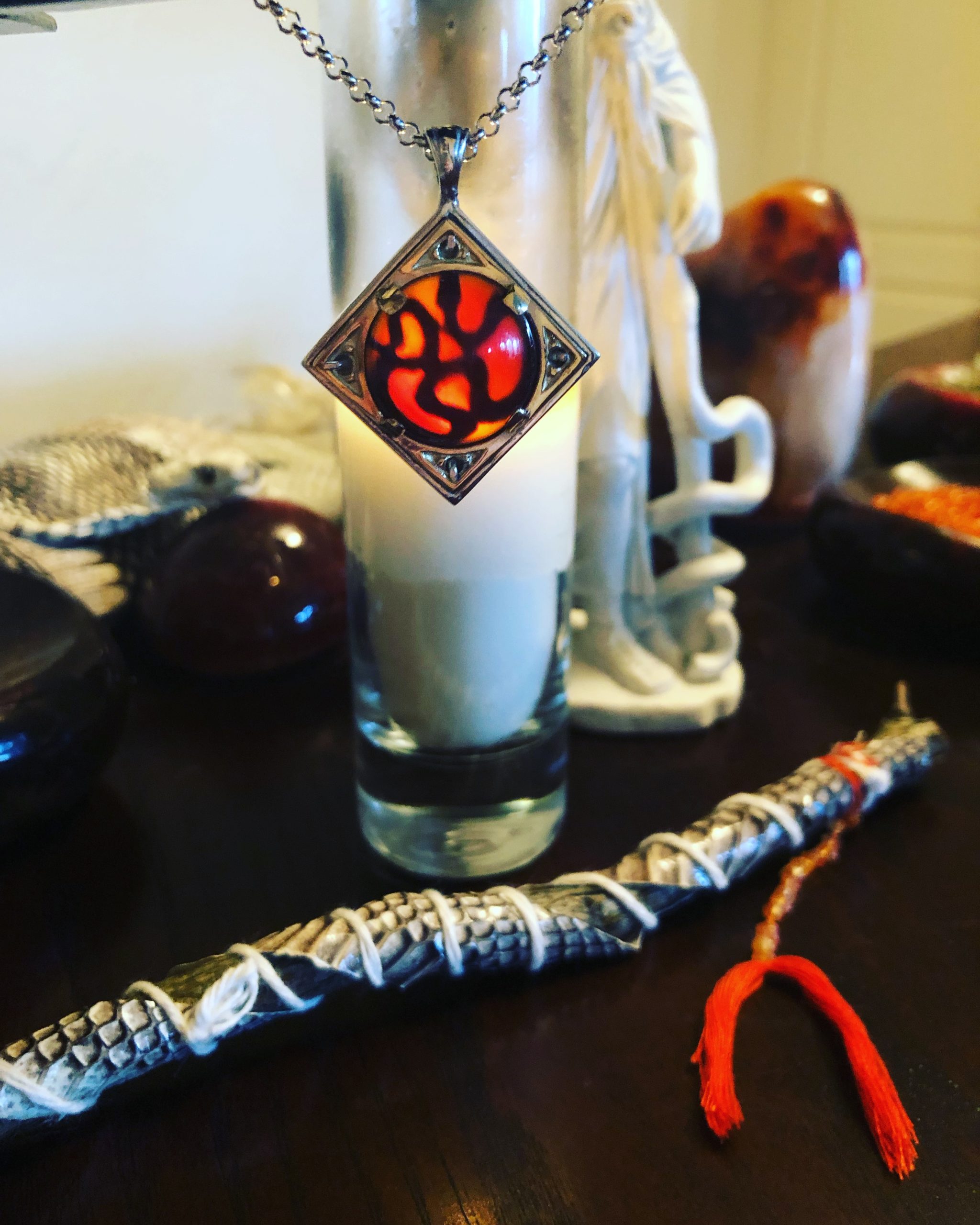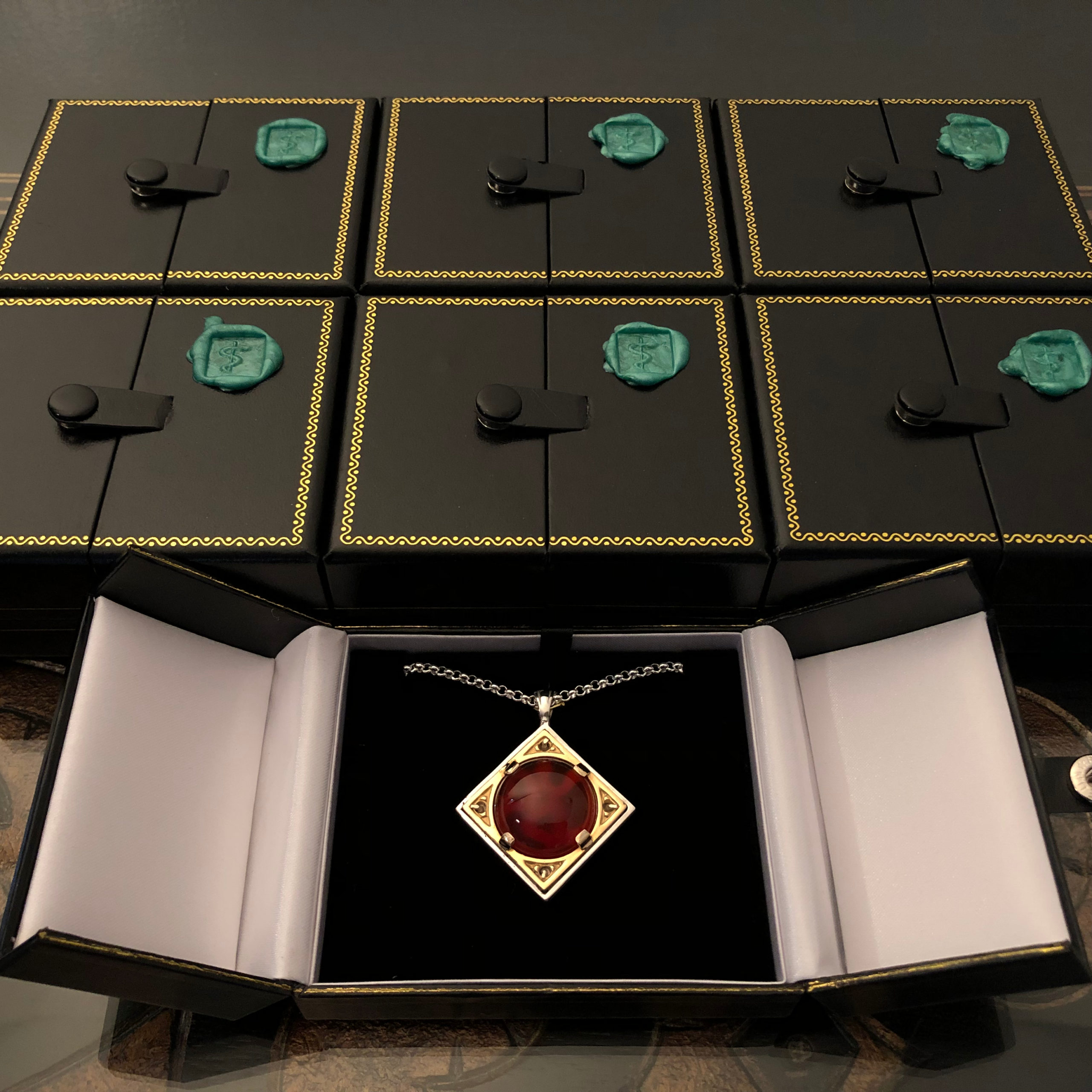 Cast in electrum, an alloy of gold and silver, featuring high grade carnelian set over viper’s tongue, cedar, frankincense, and sage. The casting of the talismans was supplemented by suffumigation using Incense of Asclepius form the first edition of the series.