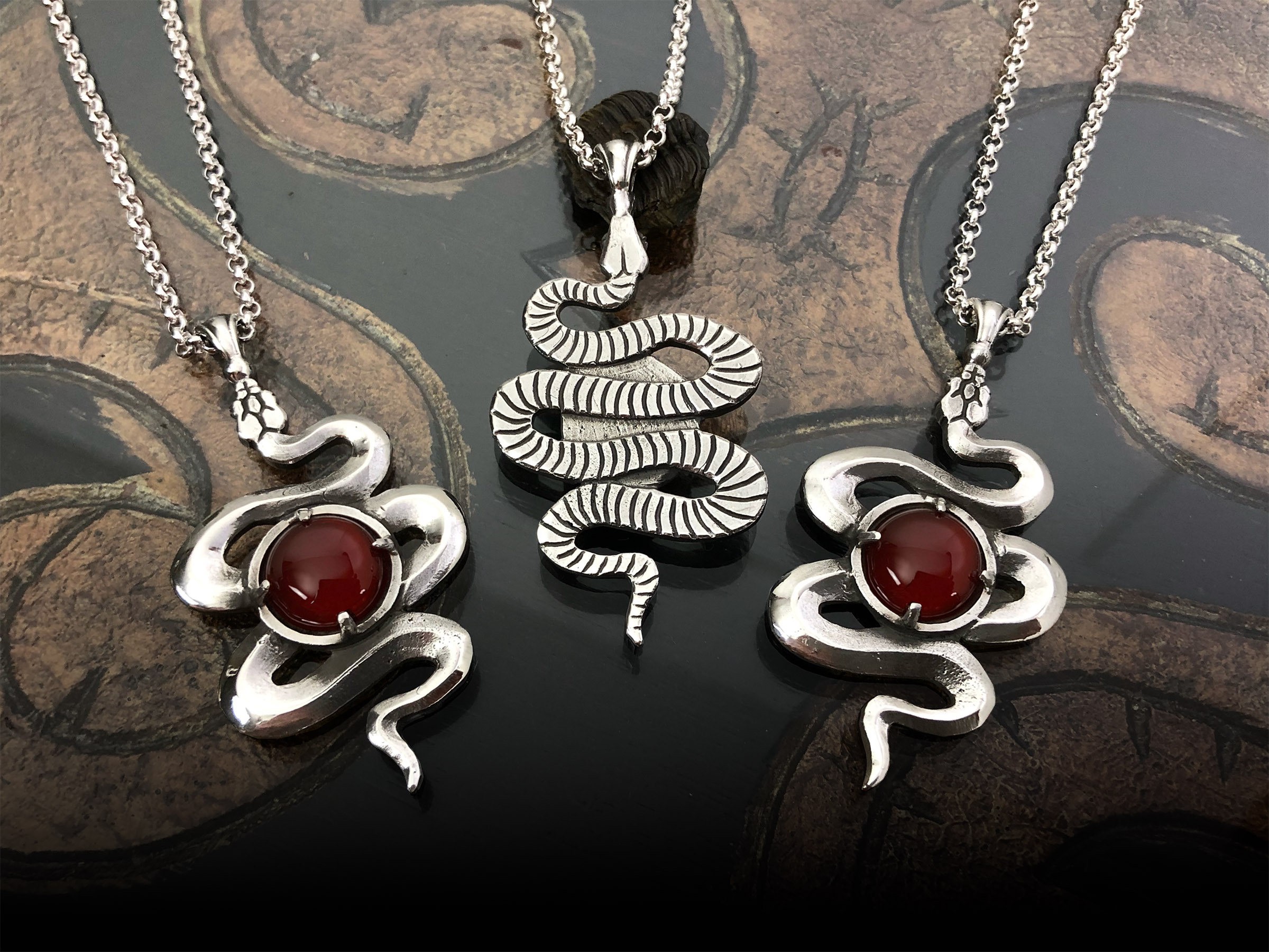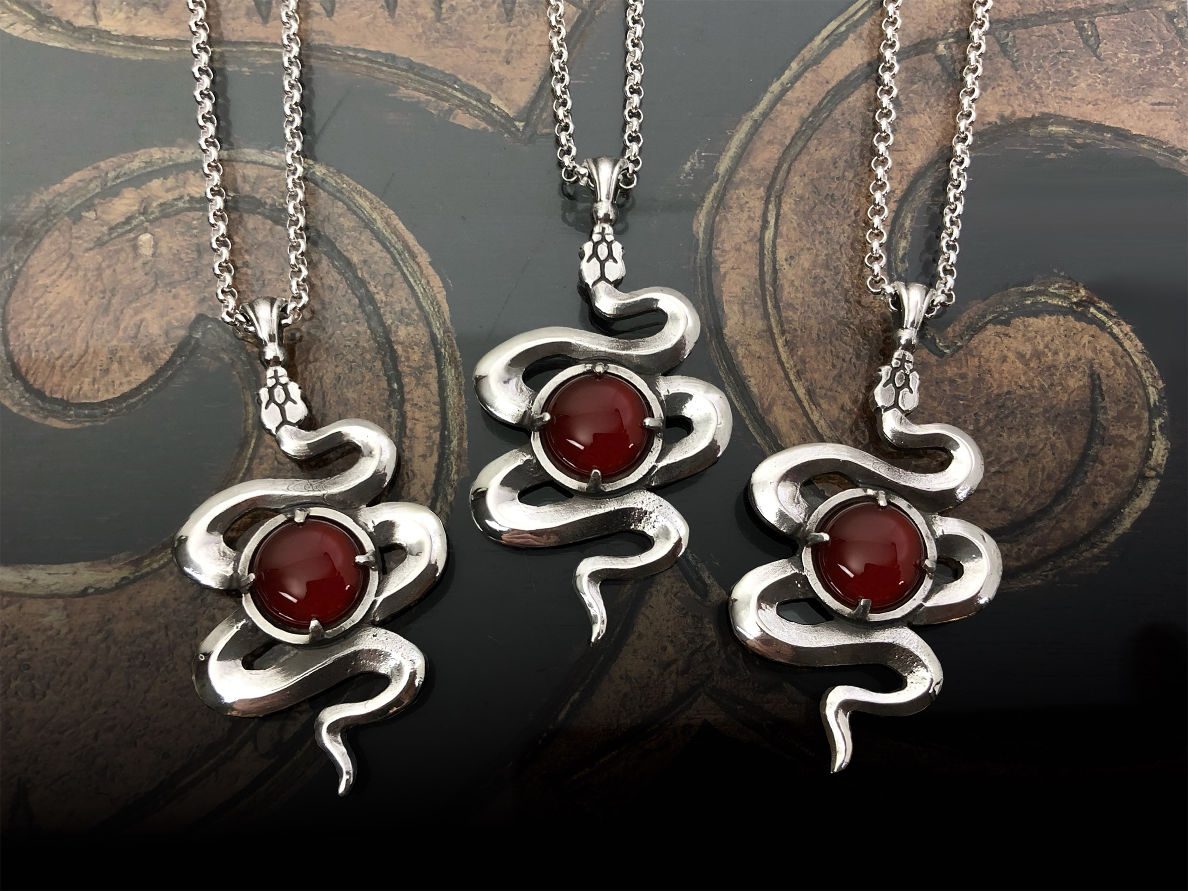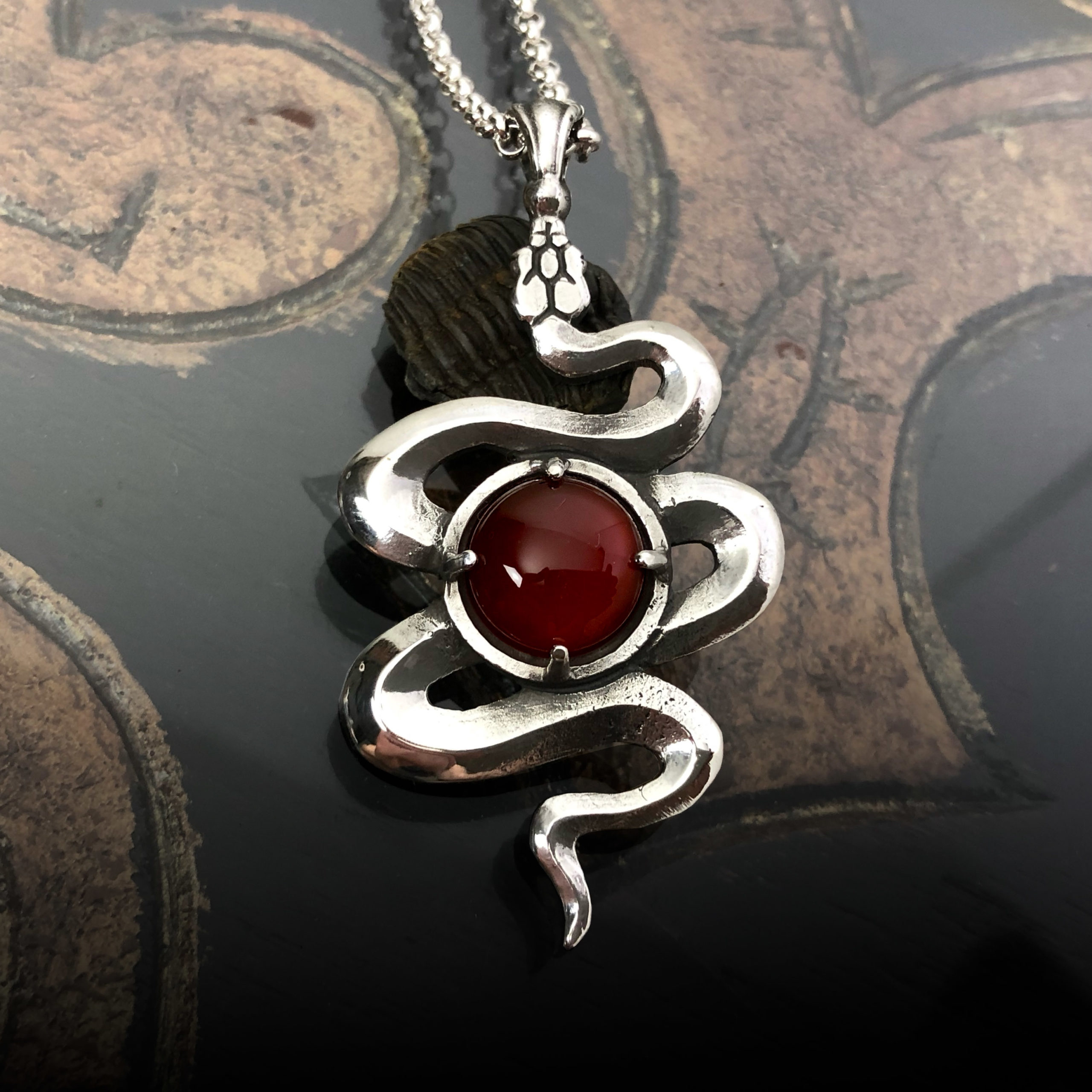An image of the asklepian serpent, or messenger serpent of Asclepius (who in myth placed a healing herb into the mouth of a dead snake, resurrecting it; giving Asclepius/Polyidus the knowledge to restore life to the prince Glaucus). Modeled in three dimensions, the underbelly of the pendant features the serpent’s ventral scales. The center of the pendant features a 5 carat carnelian cabochon set over calcined salts of Japanese Knotweed root.