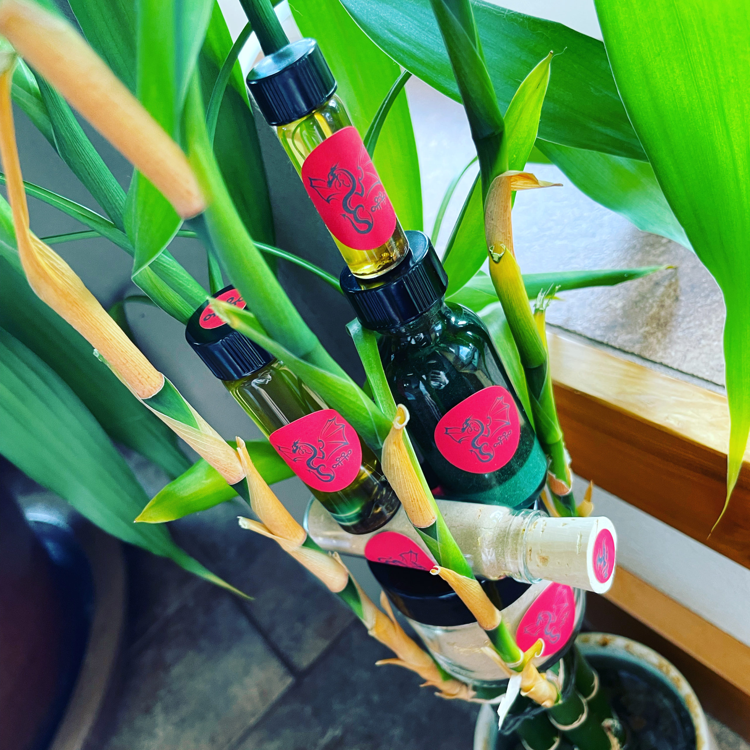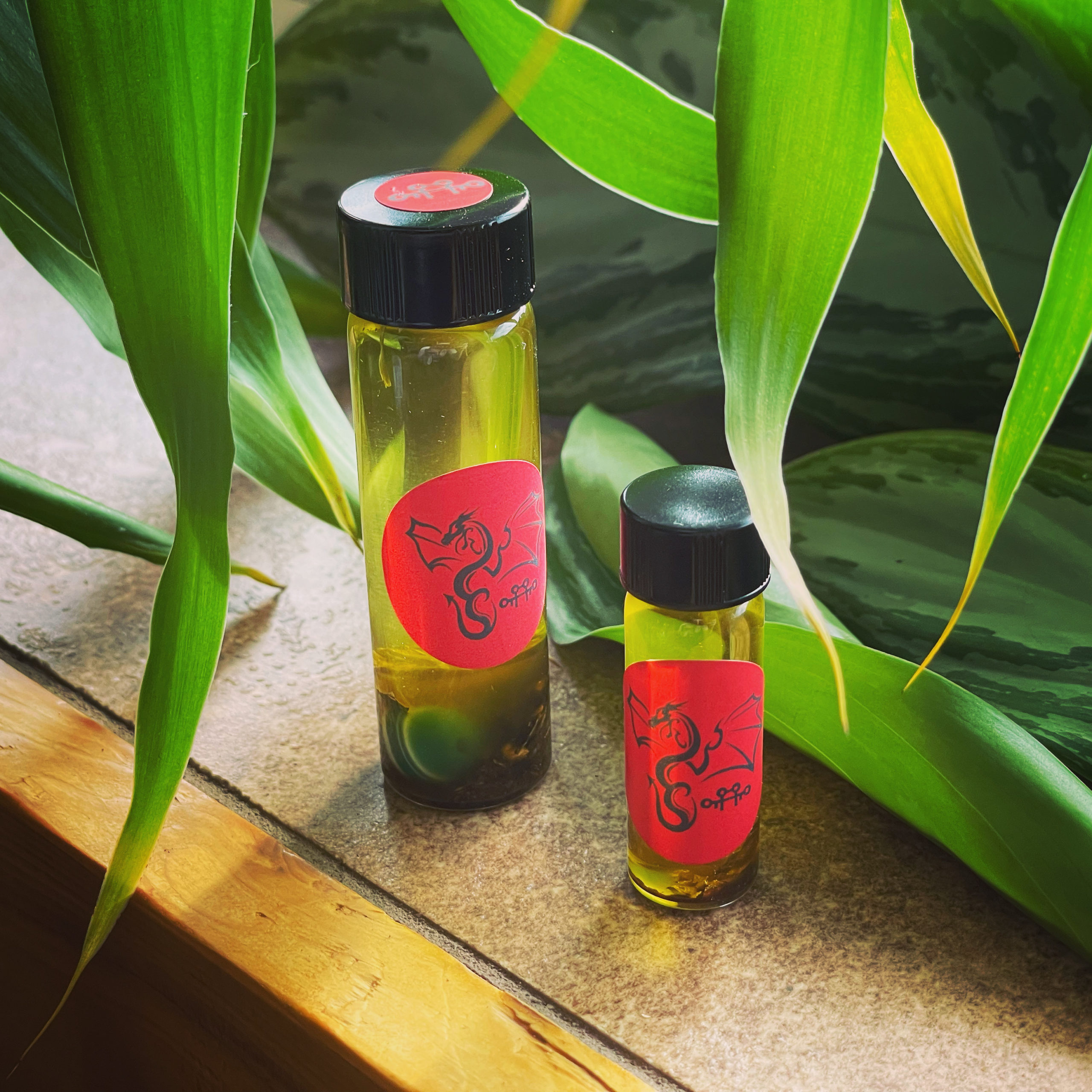 Standard recipe, with the addition of Traditional Chinese Medicine (TCM)-grade Ge Jie (medicinal Gecko) and Peacock feather. Ritually harvested bamboo (hour of Jupiter), watercress, birthwort, red and white ginseng root, master root, turmeric, dragon’s blood, 24k gold, saffron, and golden copal.
