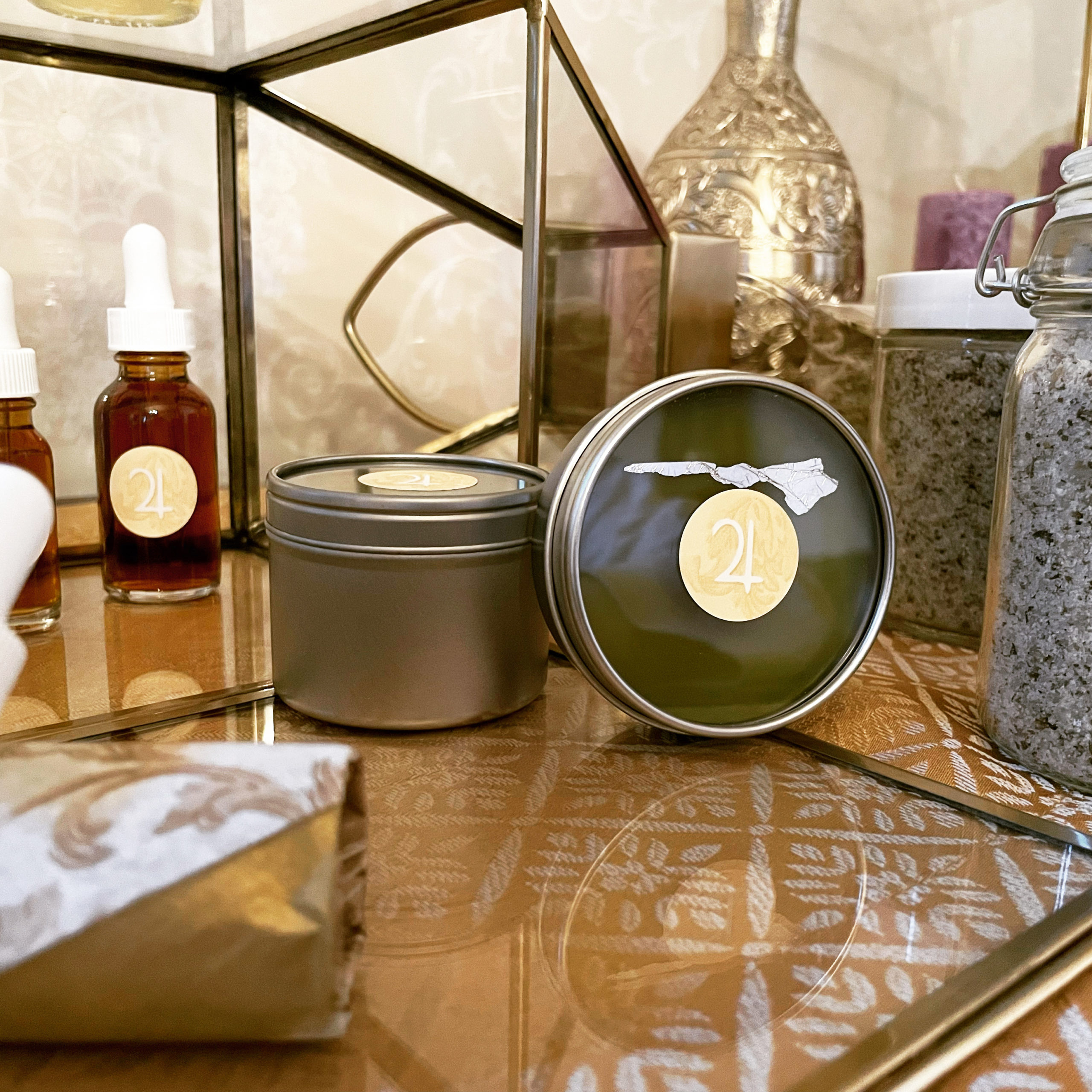 Crowned with white gold and lemon gold, offered in a 2 oz tin, or if the Client prefers, a 4 oz bulk pot.