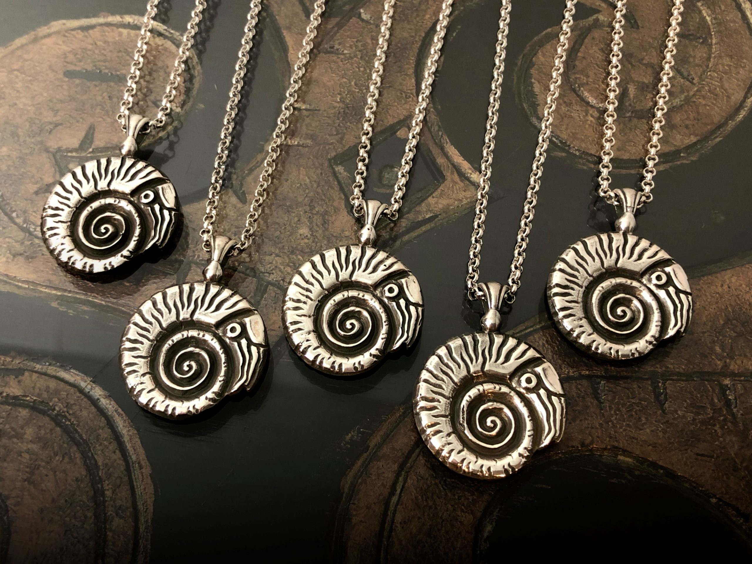 An image for Jupiter in Pisces of an ancient ammonoidea (the fossils of which we call ammonite) who’s chabered shell spirals outward in a Fibonacci sequence. The ‘golden ratio’ composition of the shell shares a pleasant symmetry with the significations of Jupiter in Pisces; namely in balanced and equilibrated growth, and as a supportive and buoyant structure which provides protection and orientation. The back of the pendant is marked with the character of Jupiter as written in Arabic manuscripts of the Ghayat Al-Hakim [aka Picatrix in latin translations].