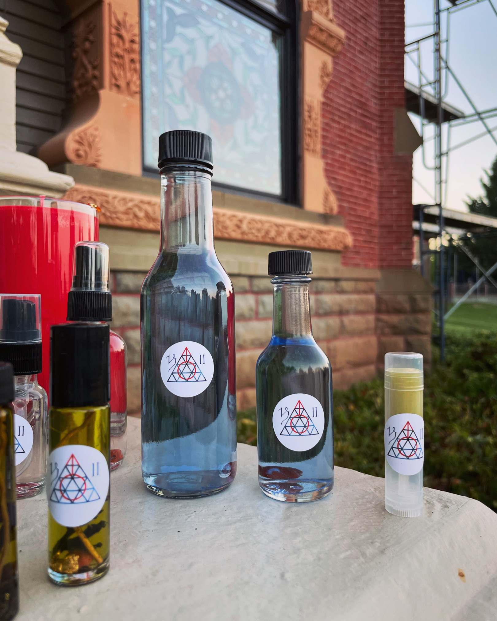 Organic cane alcohol and distilled, consecrated herbal mixture from Capricorn II (including classical associations of red chalcedony and colophonum), paired with colloidal gold and essential oils of palo santo, nutmeg, pine, and vetiver.