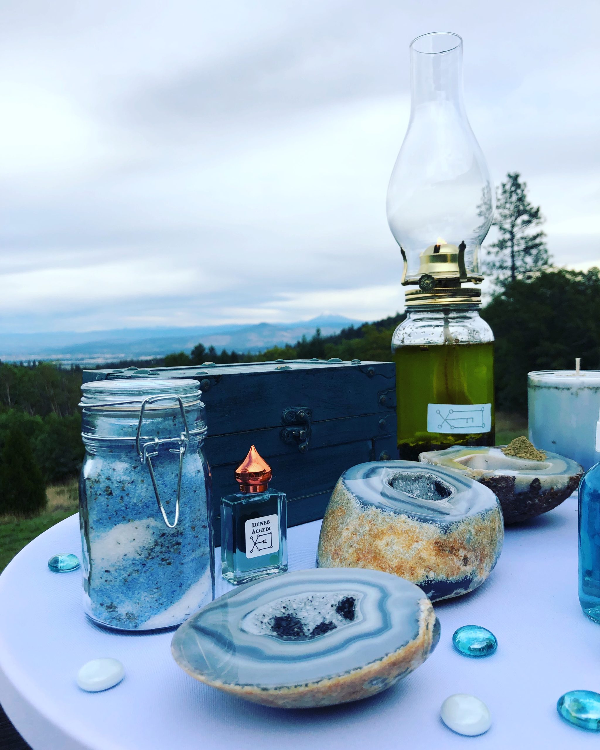 Consecrated Deneb Algedi herbal mix was created to a talismanic standard, suffumigated with Dead Sea salt, silver leaf, and blue-green algae for natural coloration and its skin nourishing properties. Essential oils of frankincense, marjoram, and blue tansy, mixed to take on the appearance of blue chalcedony and storm clouds over the frothy sea.