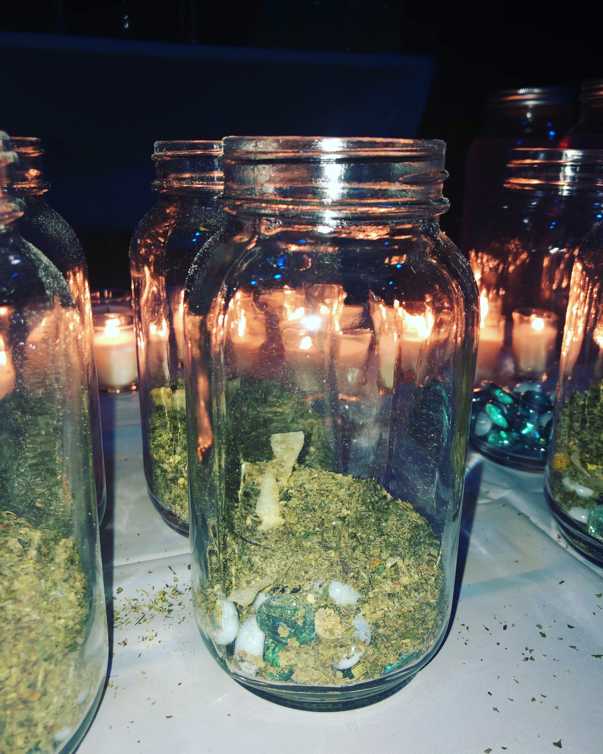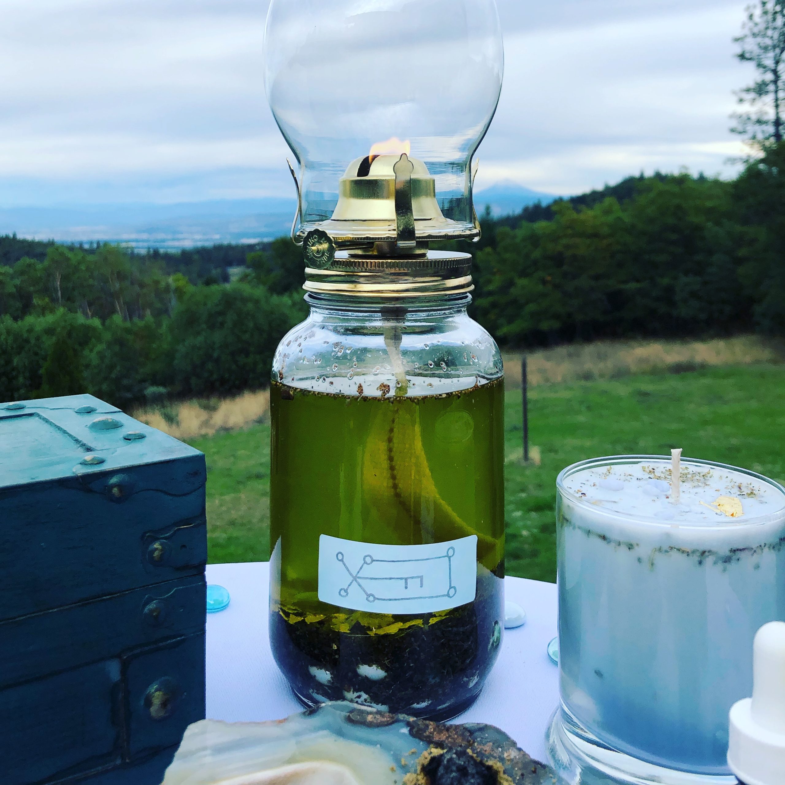 Inspired by a workshop given by Professor Charles Porterfield on conjure lamps in the Hoodoo tradition at the Viridis Genii Symposium 2019, glass vessels were suffumigated and filled with consecrated Deneb Algedi herbal mix before being filled with odorless and clean burning paraffin lamp oil during the height of the election.