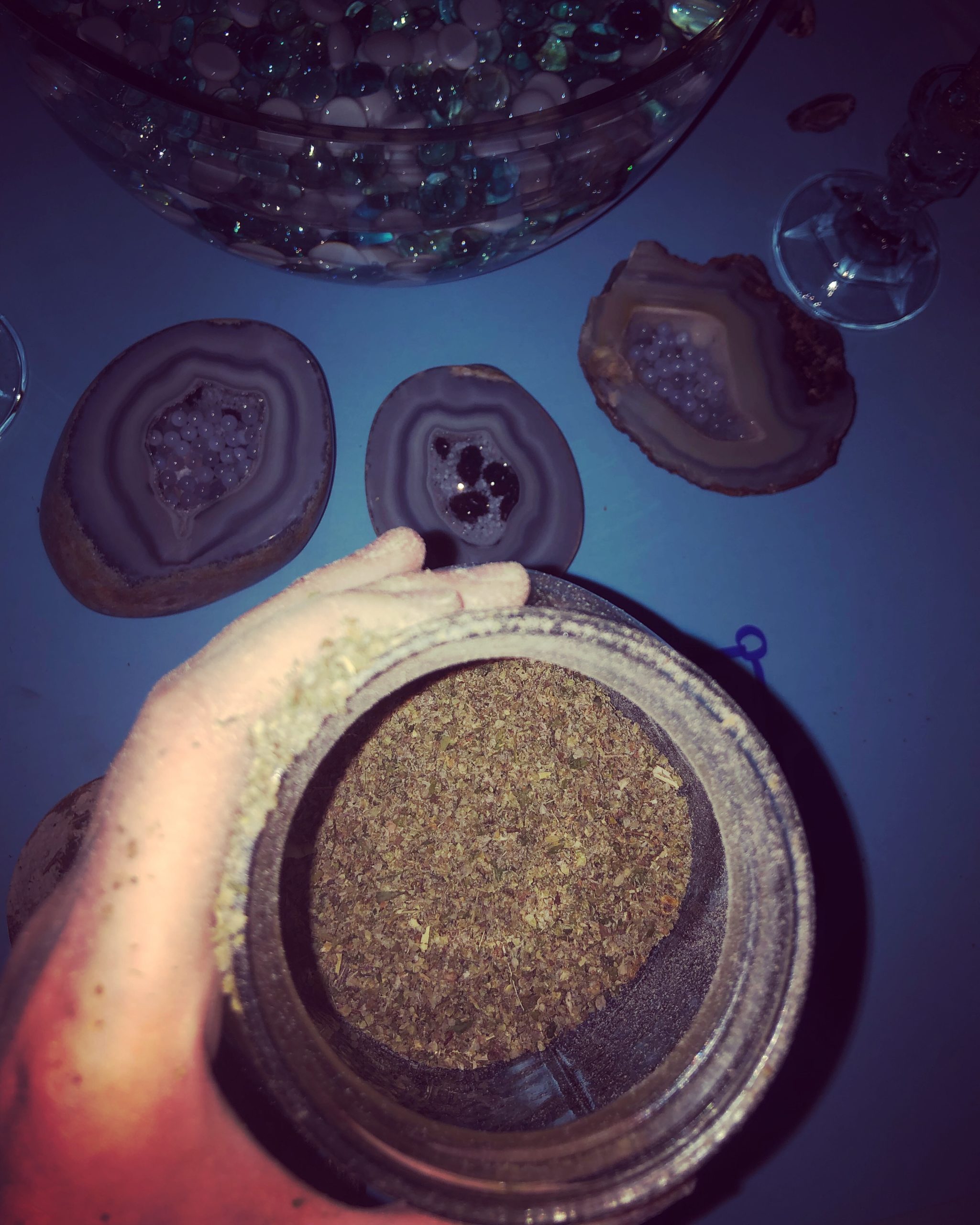 A blend of organic almond oil ritually imbued to talismanic standard on the Full Moon conjunct the fixed star Deneb Algedi, 2019. Marjoram, mugwort, cat nip, and blue chalcedony, with other insulating, grounding, and protective ingredients such as Solomon’s seal, holy basil, mustard seed, silver leaf, and frankincense.