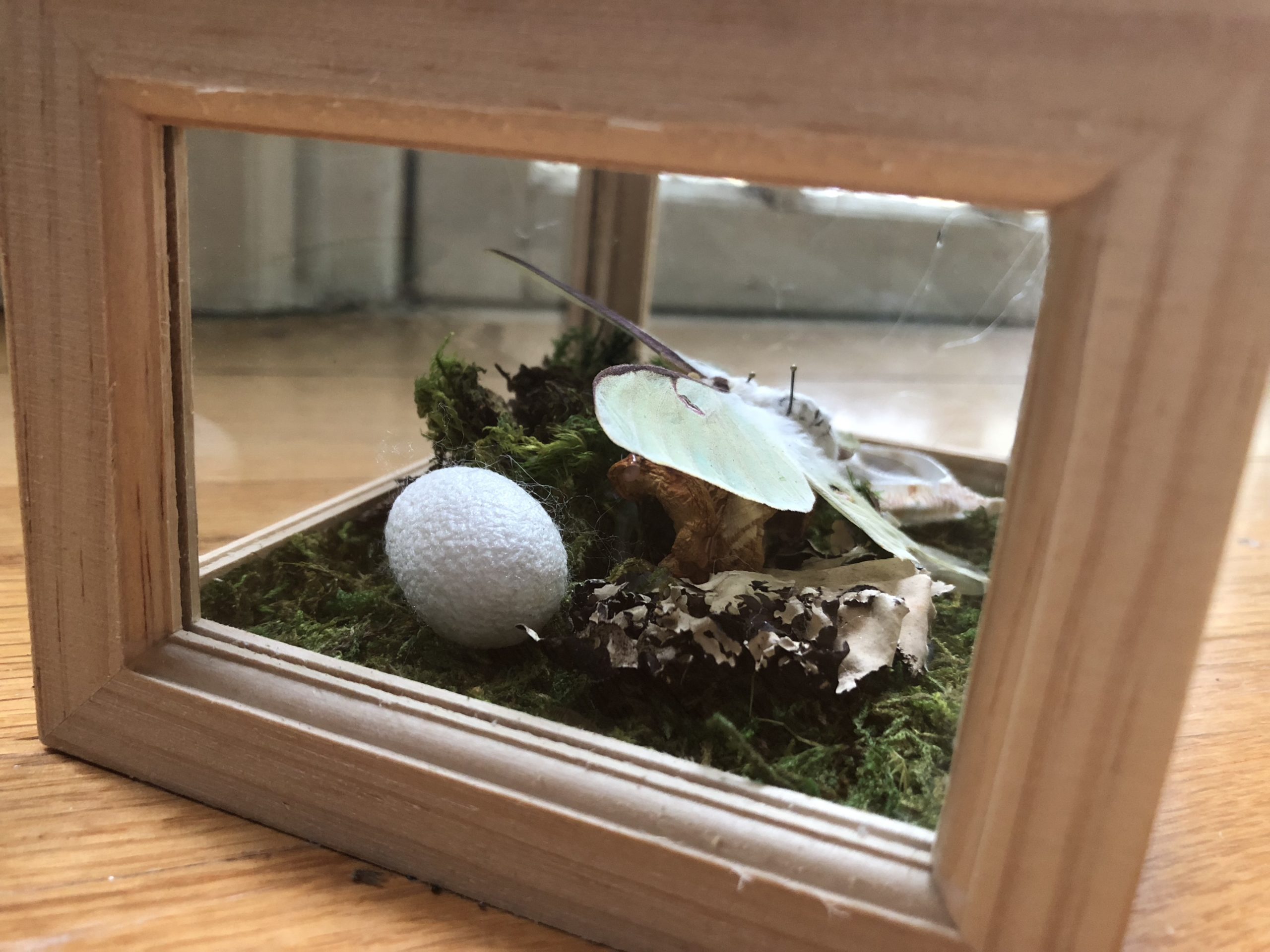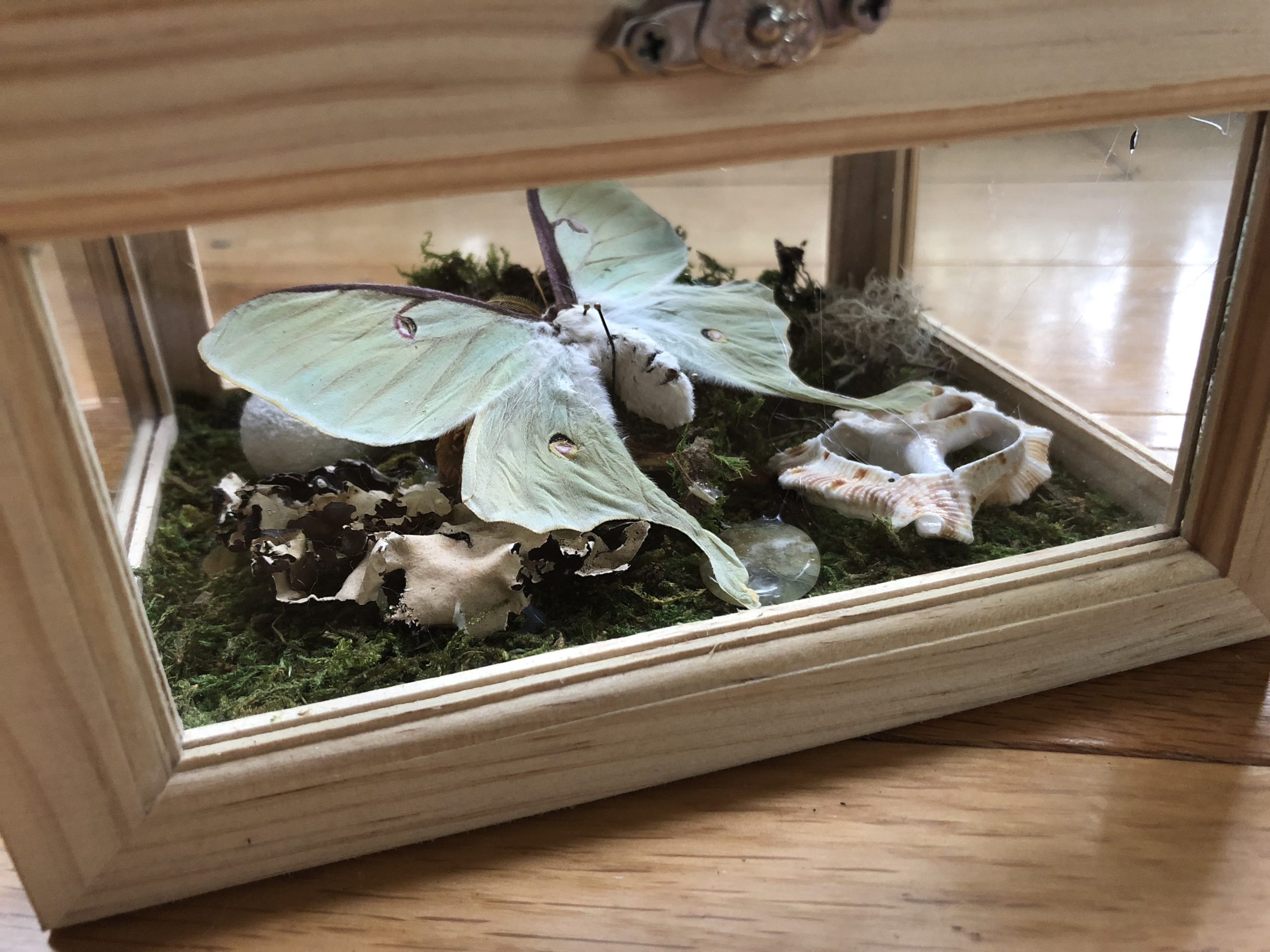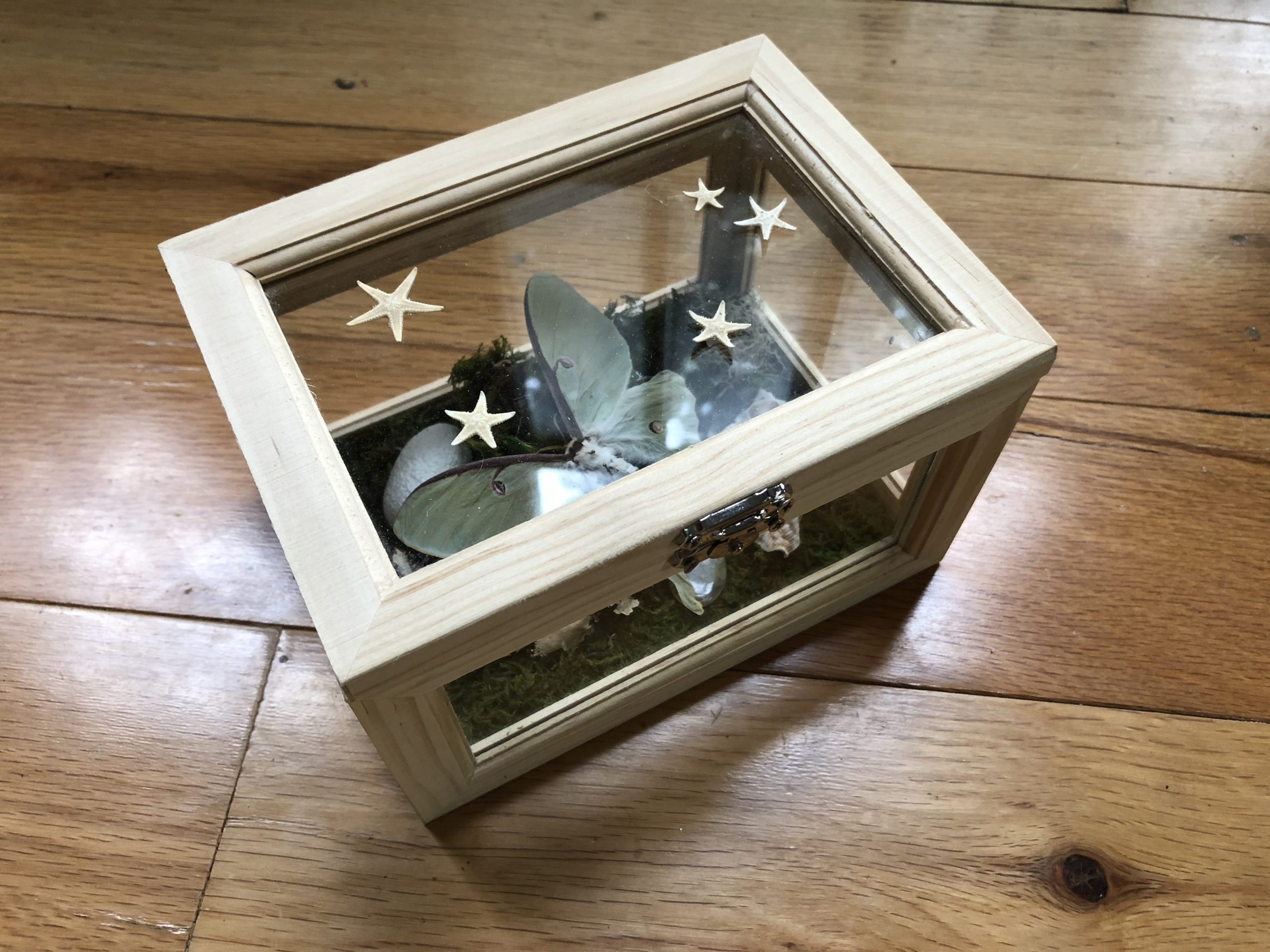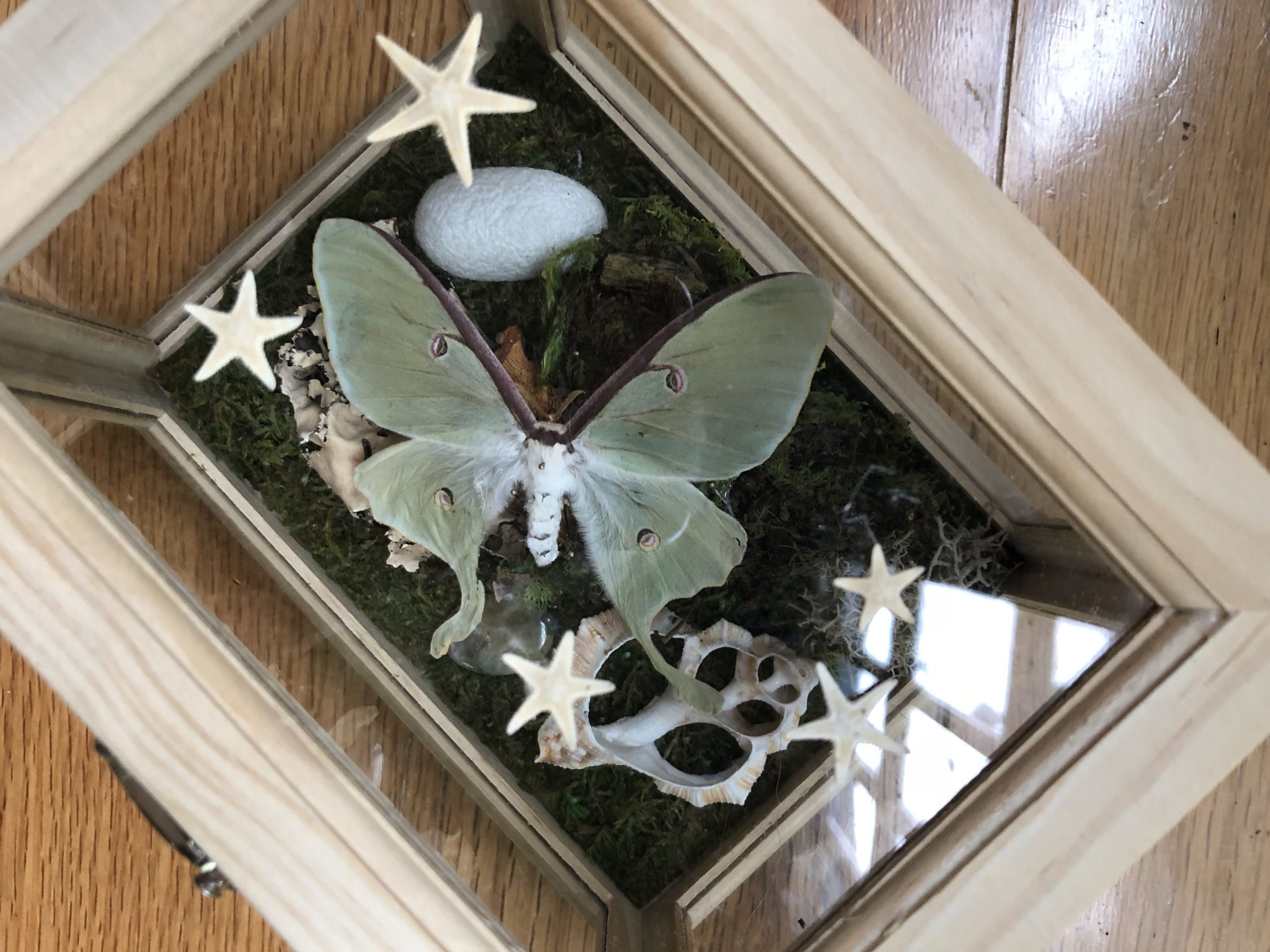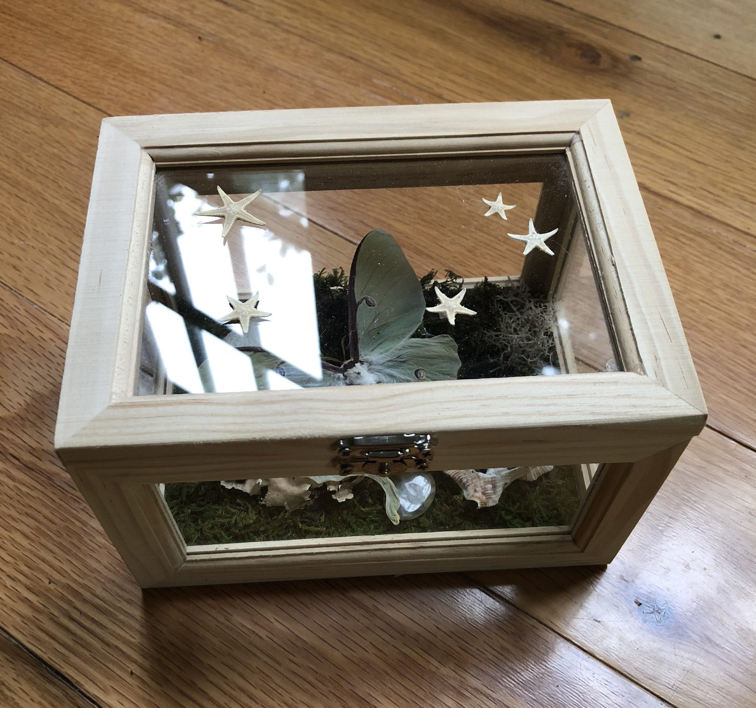 Real moss covers the floor of these beautiful reliquaries, which contain a Lunesta moth as the primary centerpiece, assisting in spirit and astral flight. A whole silk cocoon, the worm still within, represents dream incubation. Includes sympathetic herbs, mushrooms, shells, saltwater pearls, and a phrenite crystal. Starfish decorate the top glass panel, as a representation of the stars above, but also the oceans below, facilitating liminality via inversion.