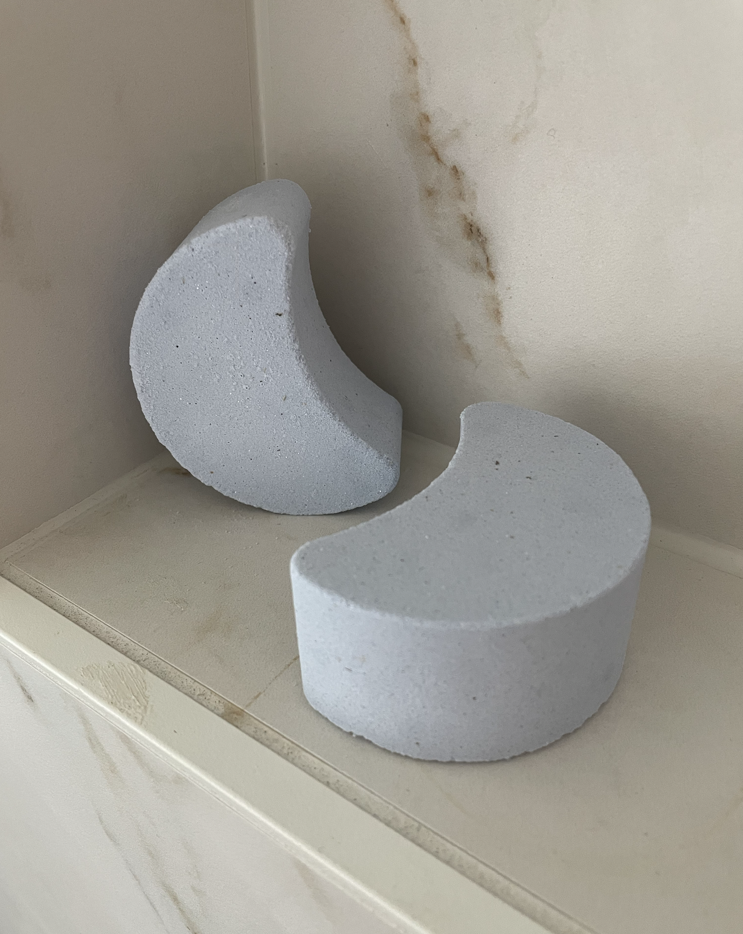 Exalted Luna Anointing Oil + Hydrosol are used to create these ultra long-lasting, luxurious Bath Bombs, in shimmering periwinkle blue and a crescent moon shape.