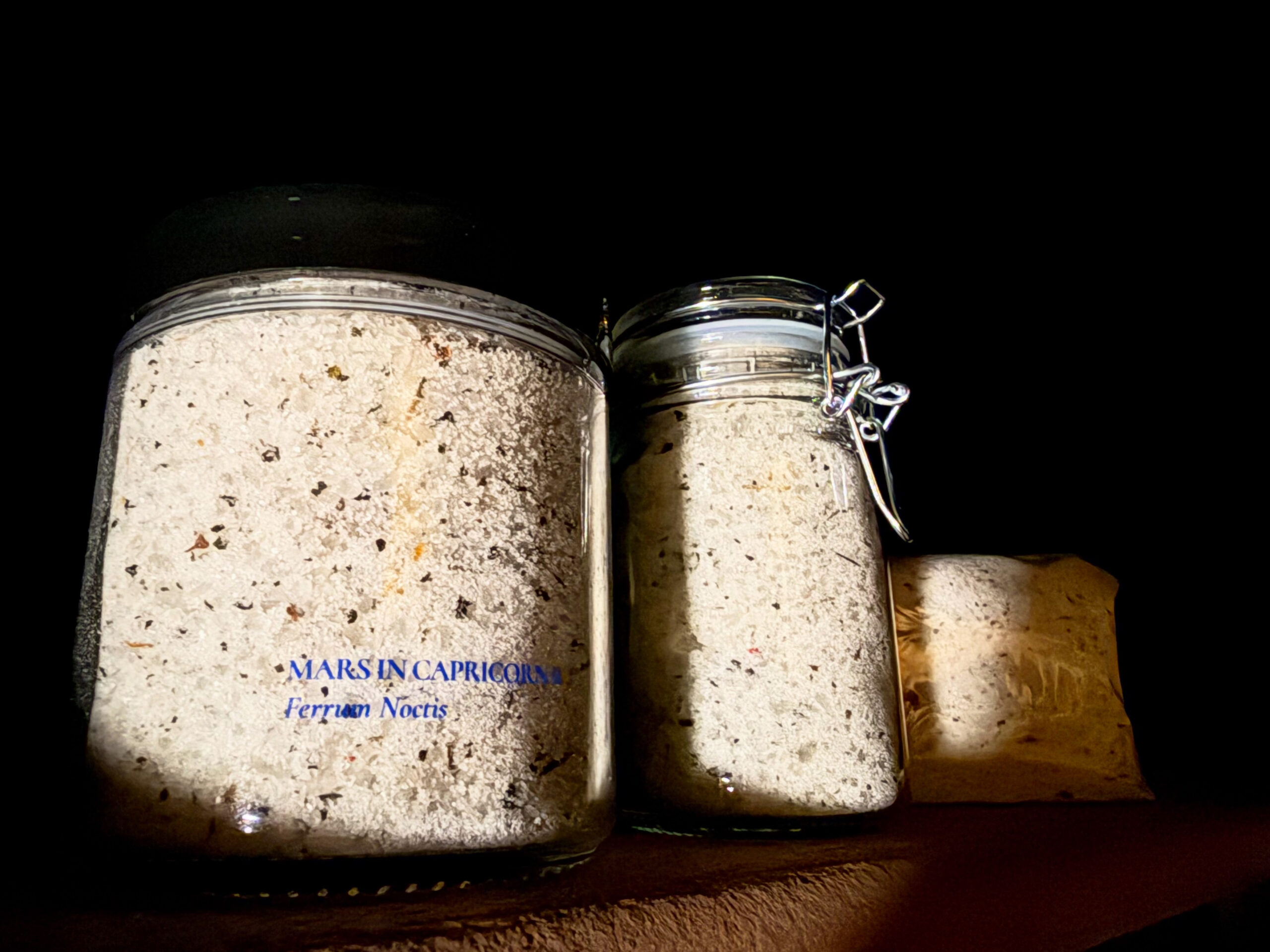 Dead Sea salts with consecrated Ferrum Noctis herbal matter and Anointing Oil, scented with tulsi, nutmeg, myrrh, vetiver, clove, tobacco, and galangal.