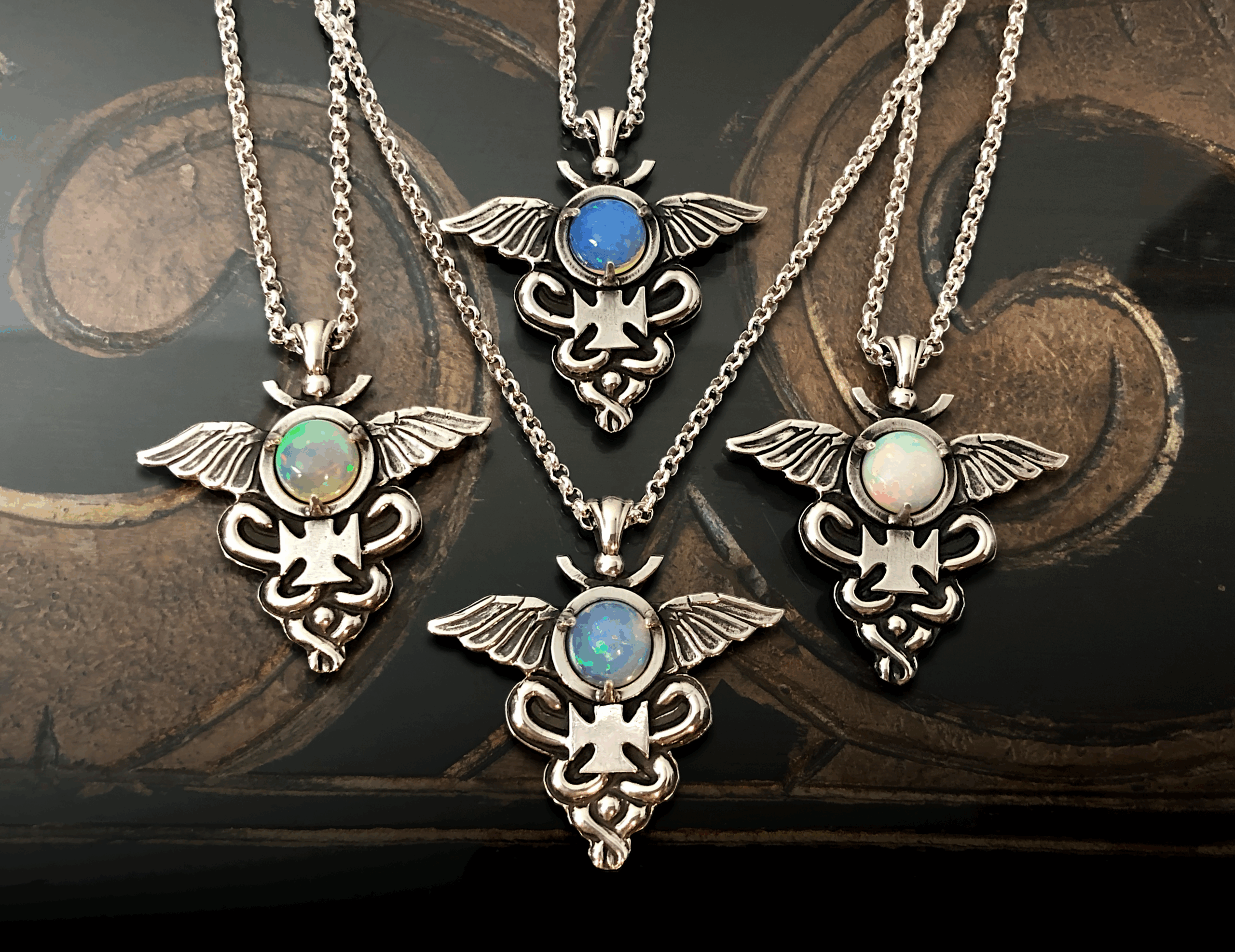 An image of a stylized caduceus, the staff of Hermes modeled in high relief. Above the dual serpents is the planetary glyph of Mercury, flanked by wings. In the center of the planetary glyph is a bezel set 2.5 carat welo opal.