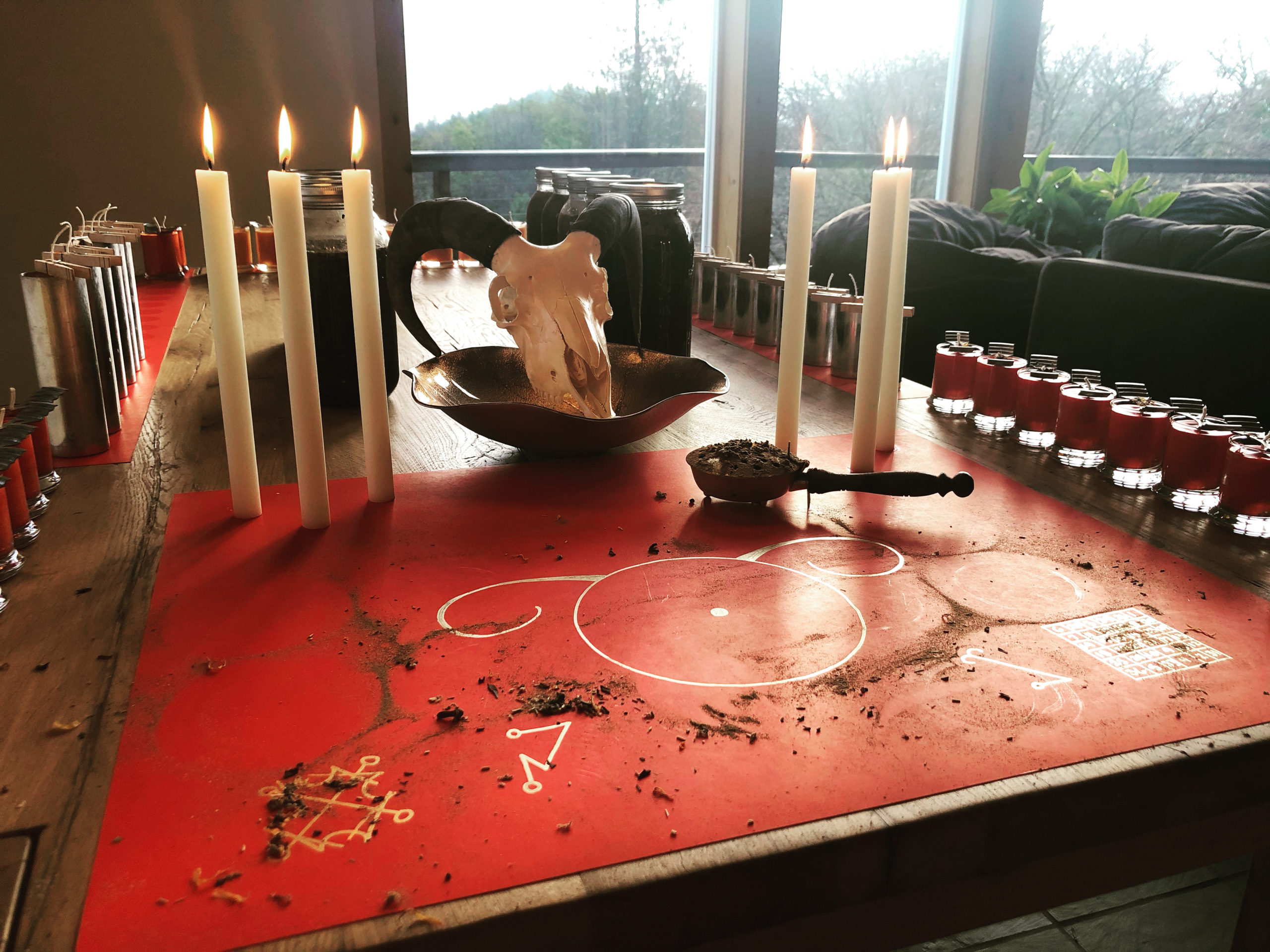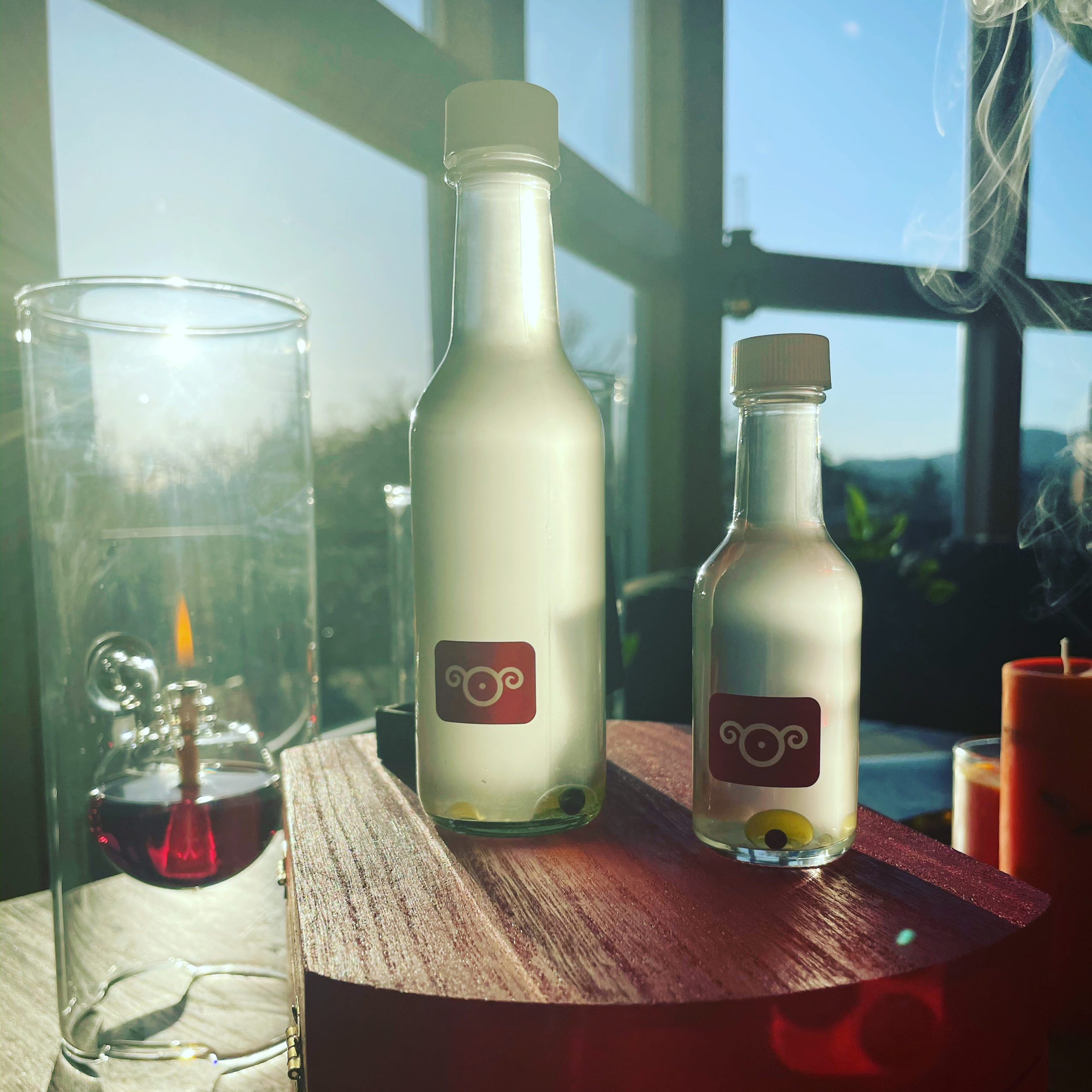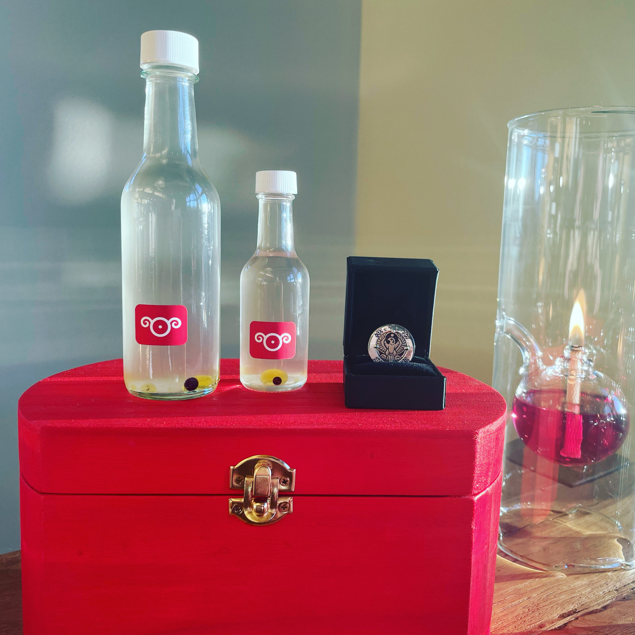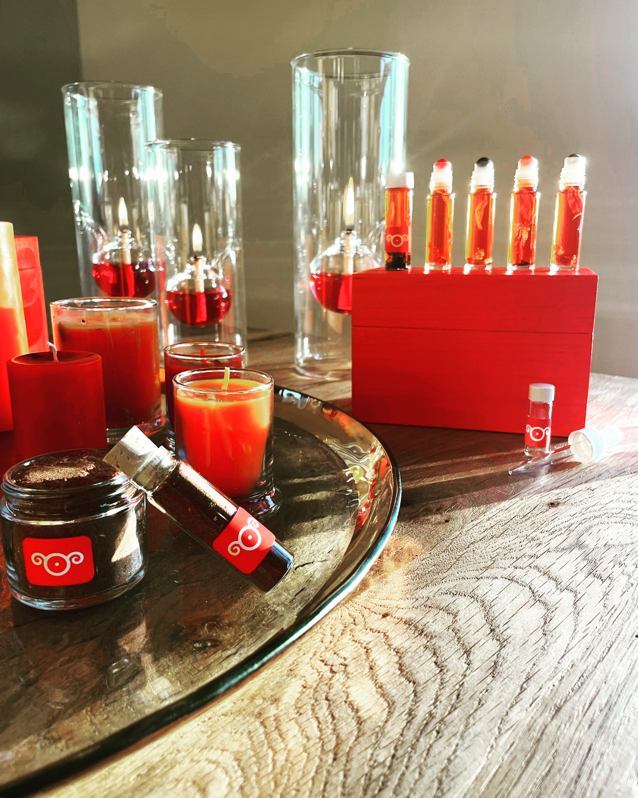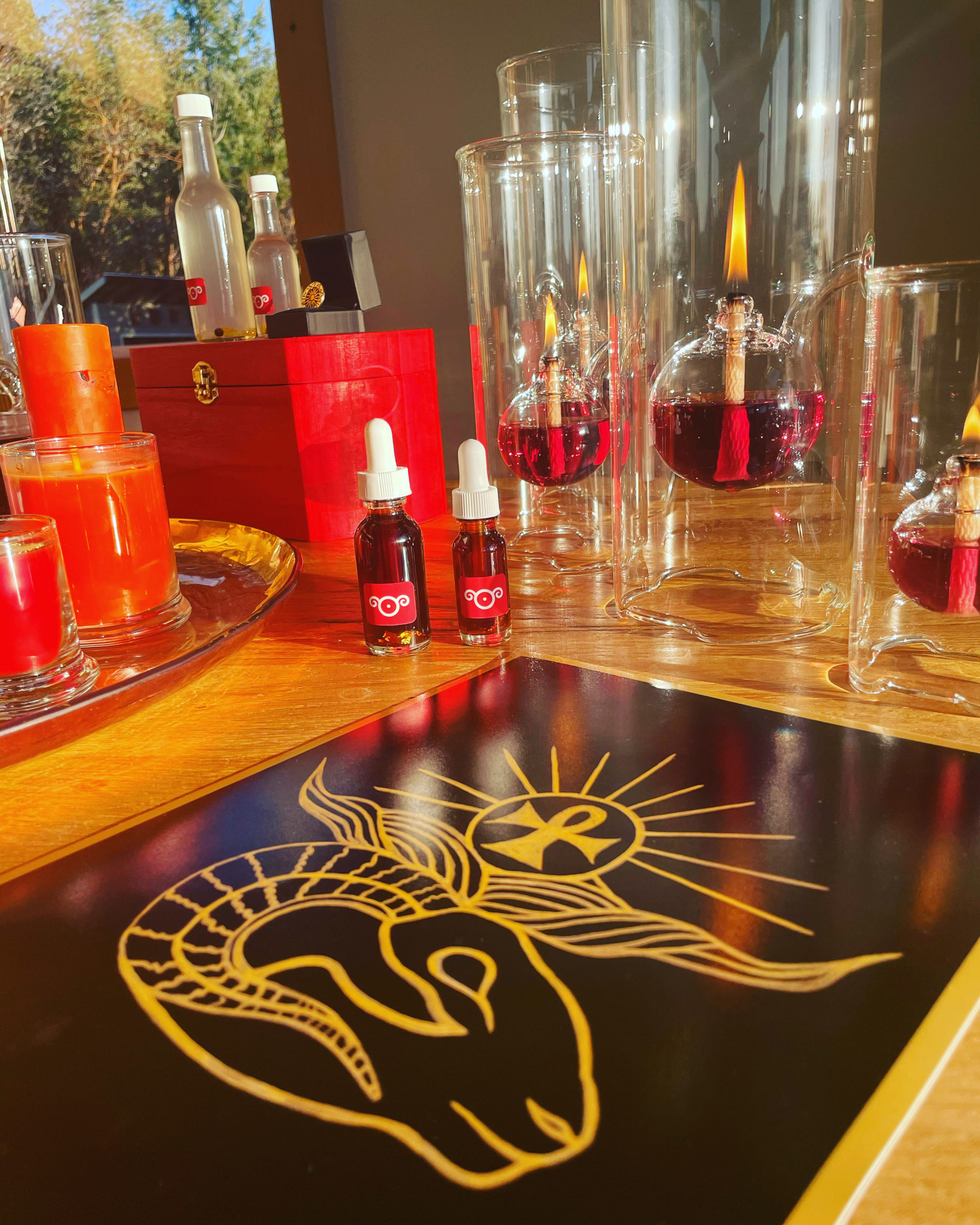Along with the box, each set includes one of every item from the Exalted Sol series in small or large form (where there are size variations). Only 3 of the large box sets include Tony Mack’s Exalted Sol talismans. Small altar boxes come with 2 oz red candles in glass jars, and large include the 8 oz glass jar candles in orange.