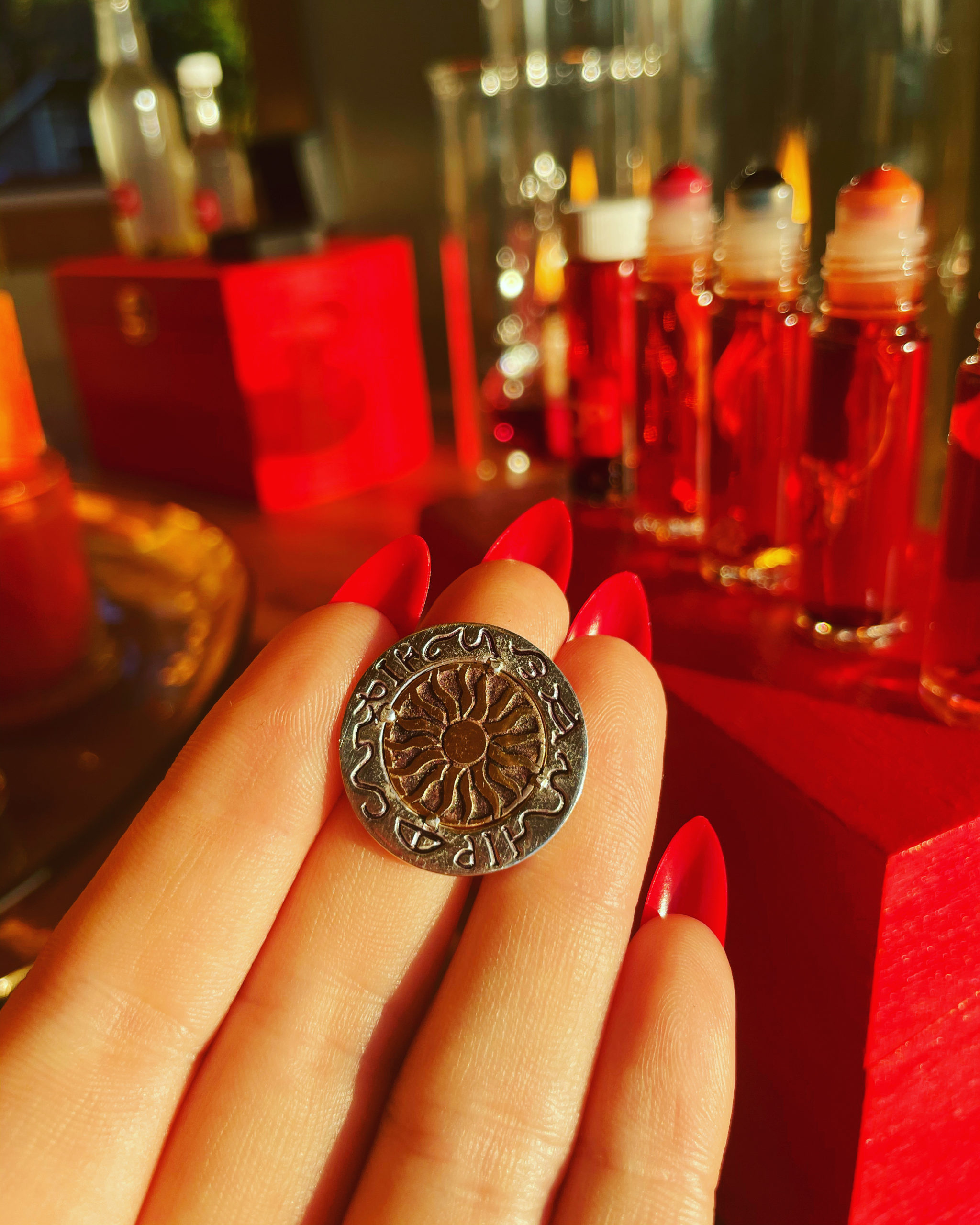 • Oil of Exalted Sol (1/2 oz standard, or 10 ml roller: red jade, tiger’s eye, gold plate)