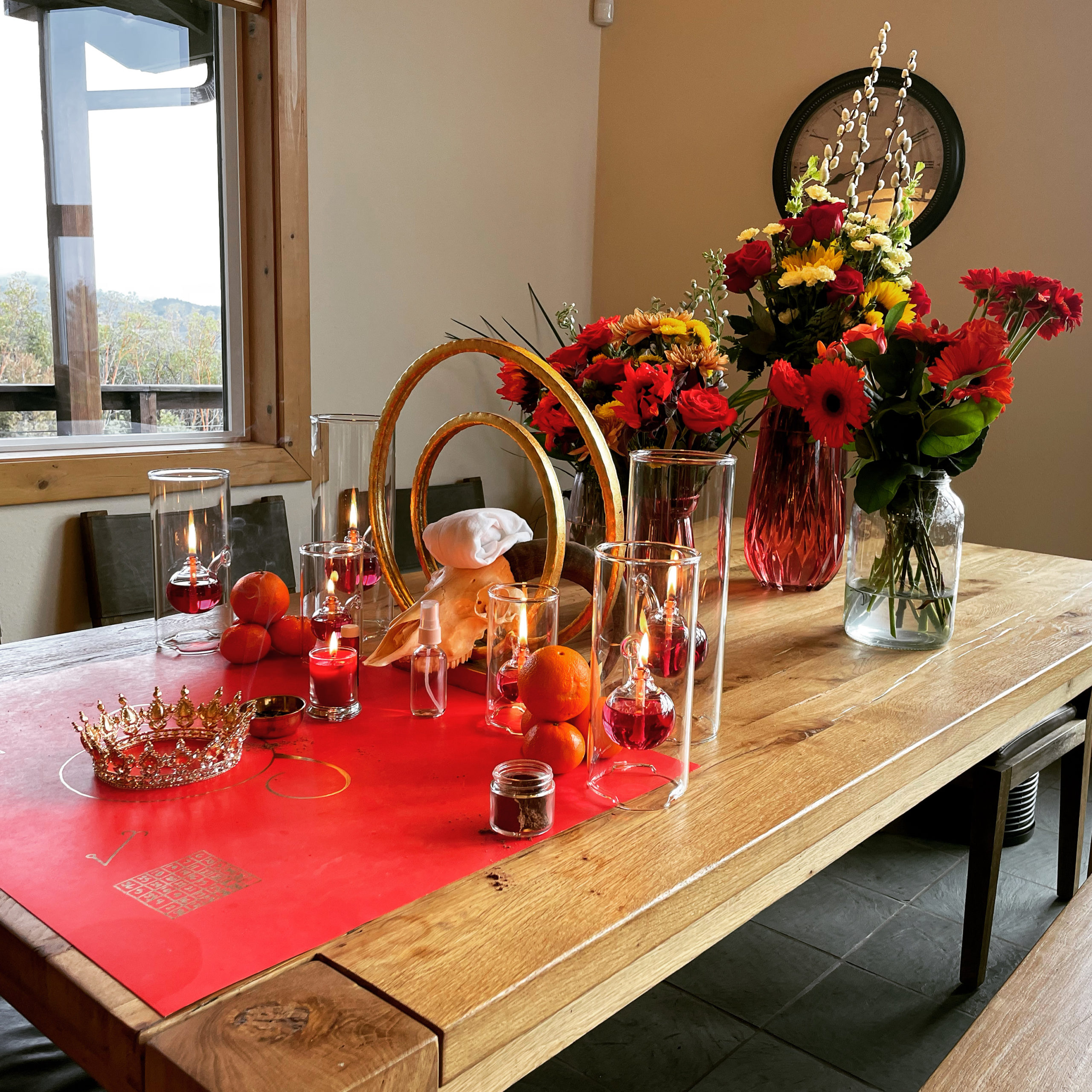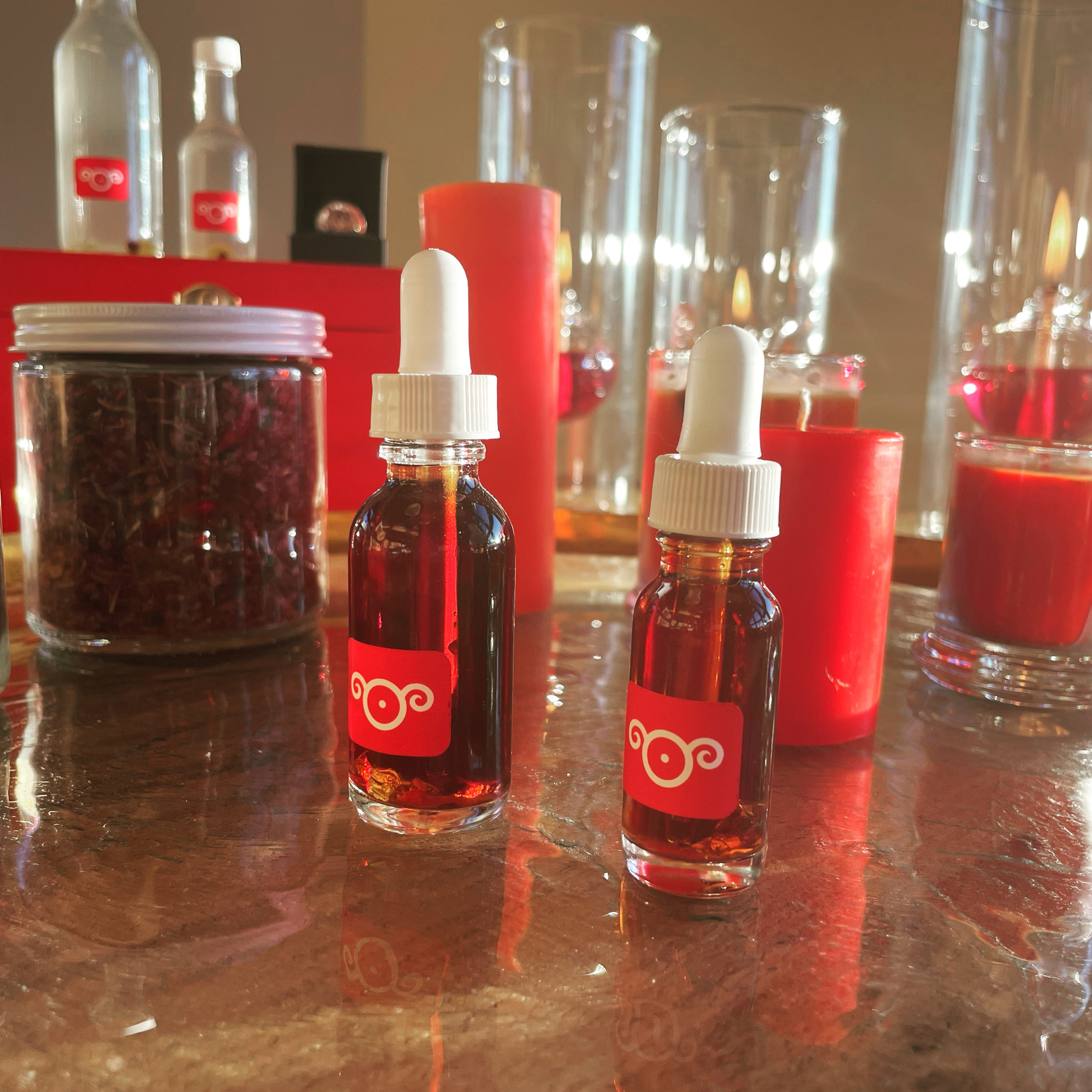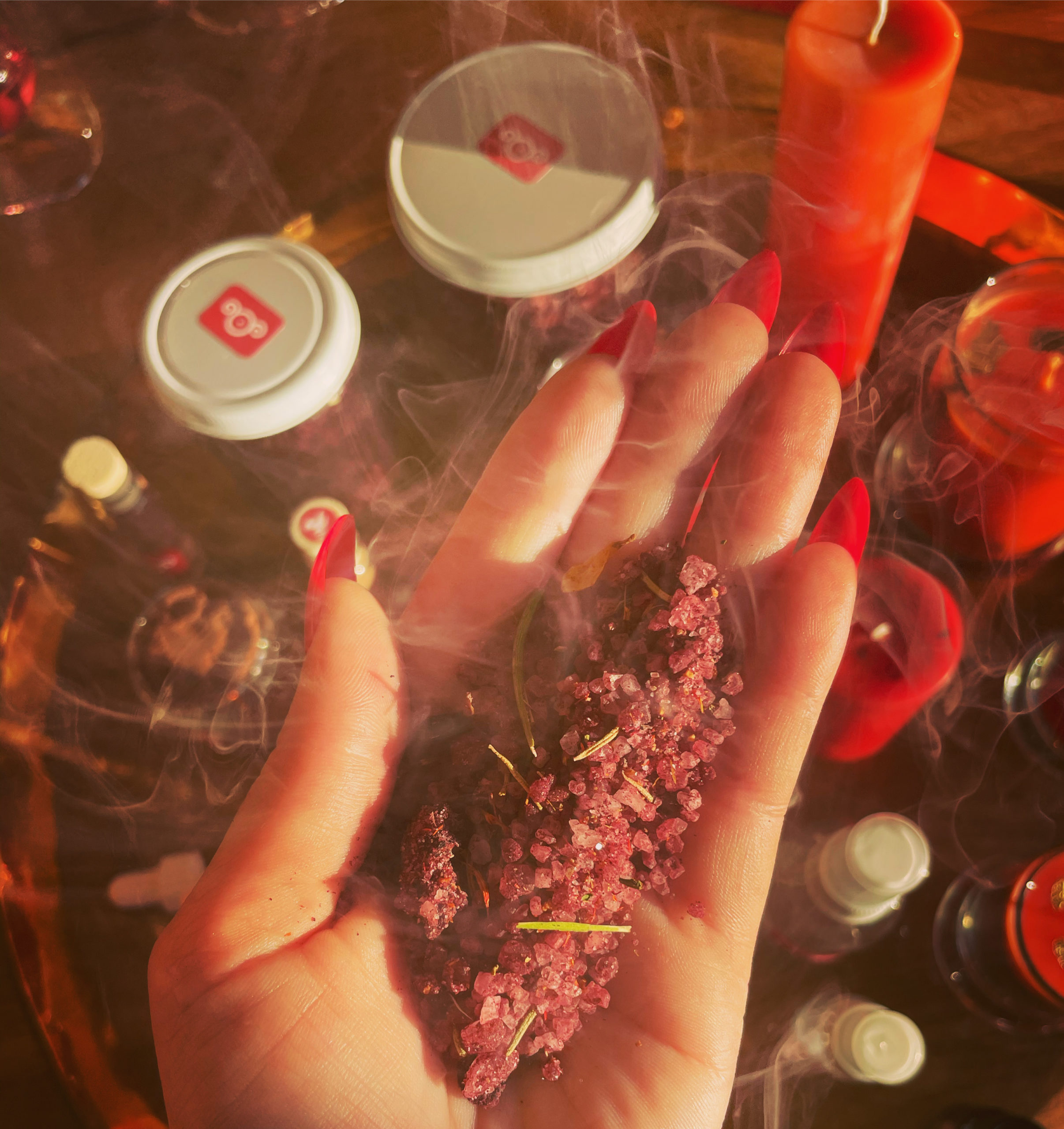 Exalted Sol herbal mix, alongside organic rue, rosemary, hibiscus powder, and flowers offered on the altar of Kolonía’s creation, copious essential oils of a Solar nature, and 24k gold, combined with Dead Sea salt fumigated during our series election.
