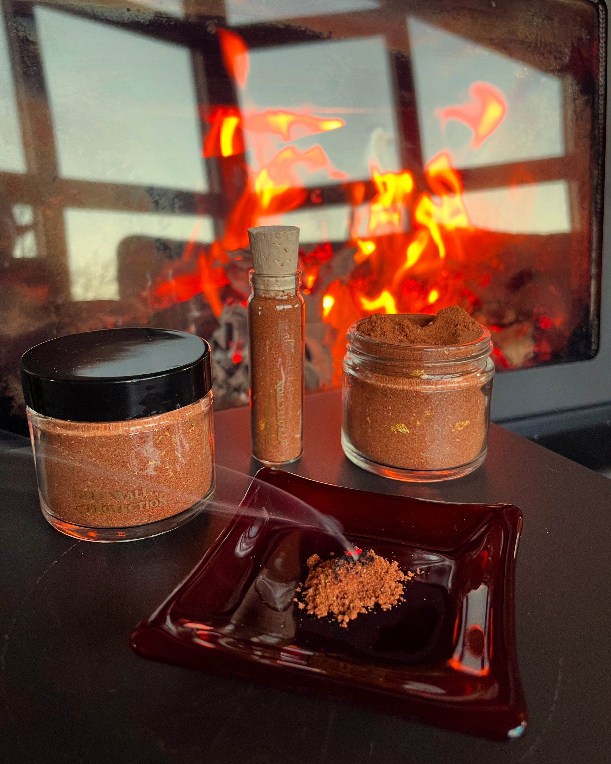 Note that Sphere + Sundry’s Incense Powders are designed to be burned *without* charcoal, on beds of premium ash in a firesafe dish or plate. Pour ash, then pat or use a tool to create a relatively smooth surface. Pour the desired amount of Incense Powder into the palm of your non-dominant hand, and use the other to assemble a thin peaked mound, line, or sigil, pinch by pinch. These can be quite thin if desired. The neater and more ridged your shape is, the better it will burn! Light the top of the ridge to ignite.