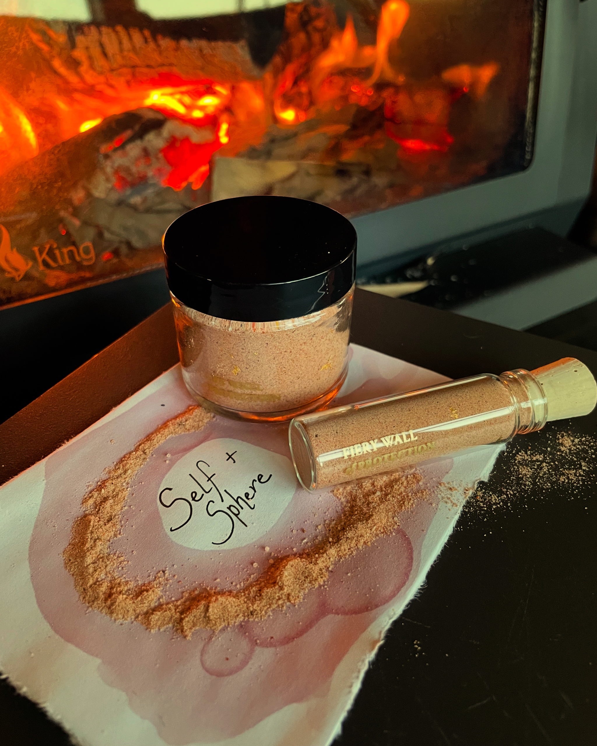 Dead Sea salts stained a light rust by the addition of consecrated Fiery Wall powder, 24k gold, and essential oils of nutmeg, clove, champaca, cinnamon, and cassia.