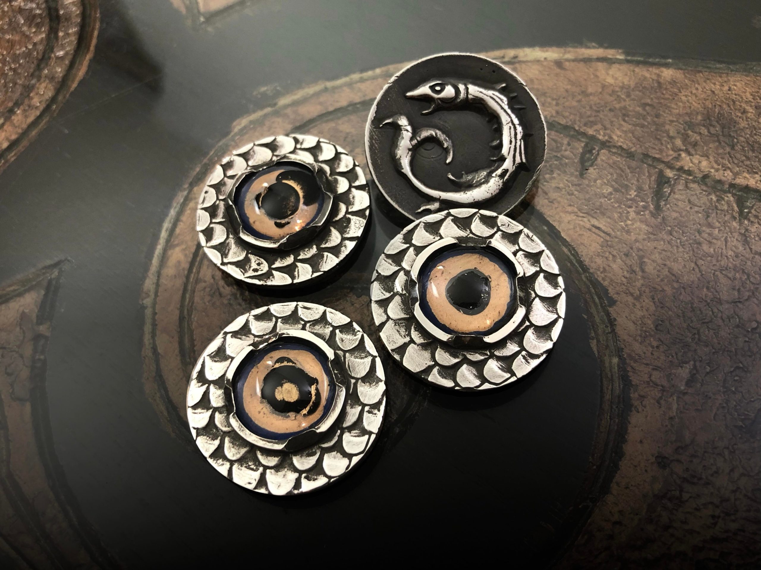 The eye of the “Southern Fish” surrounded by a motif of scales. Yarrow flower, blue lotus, kelp, and gold were placed inside the ‘iris’ and set-over with a magnifying lens of quartz crystal.