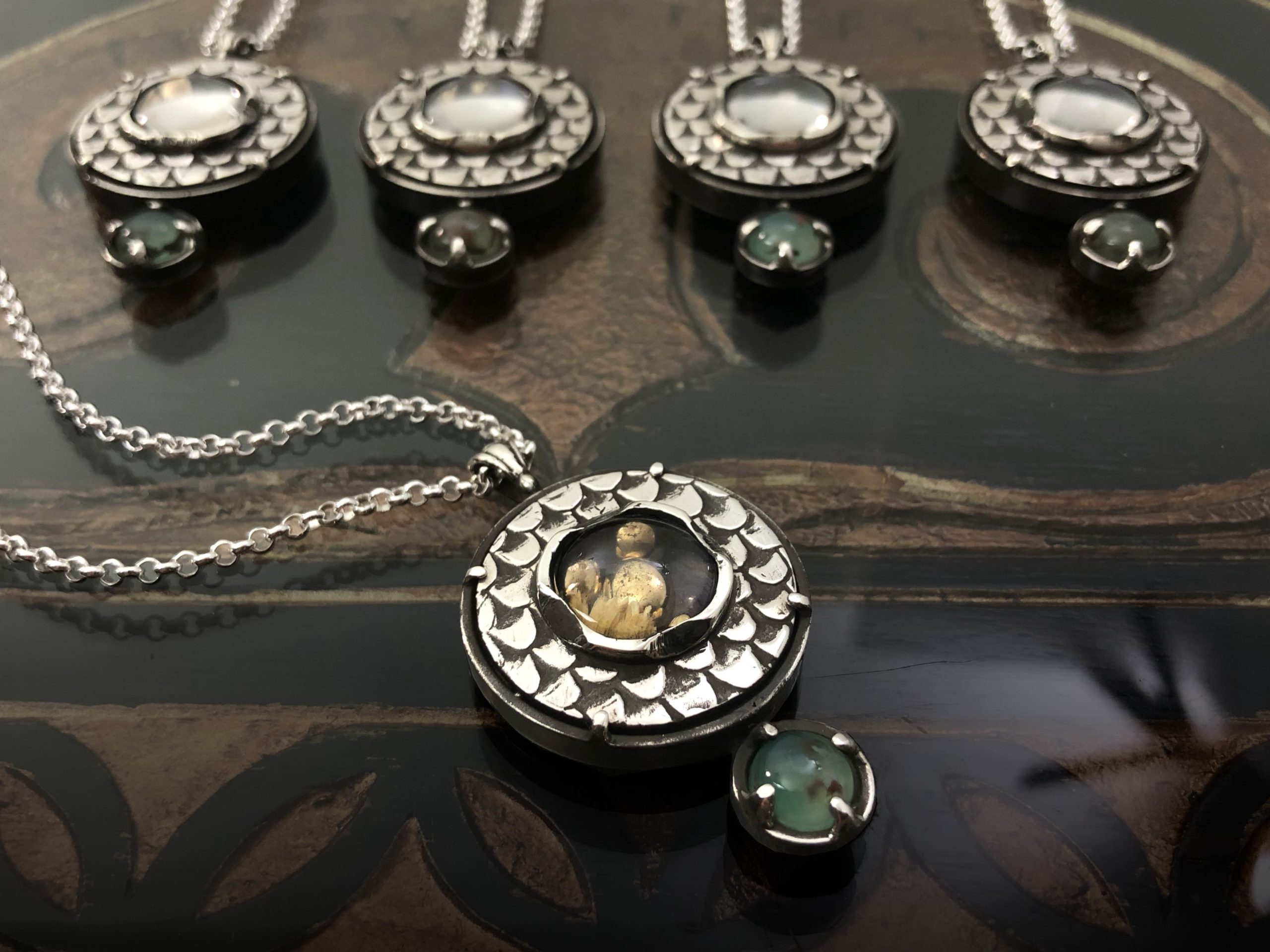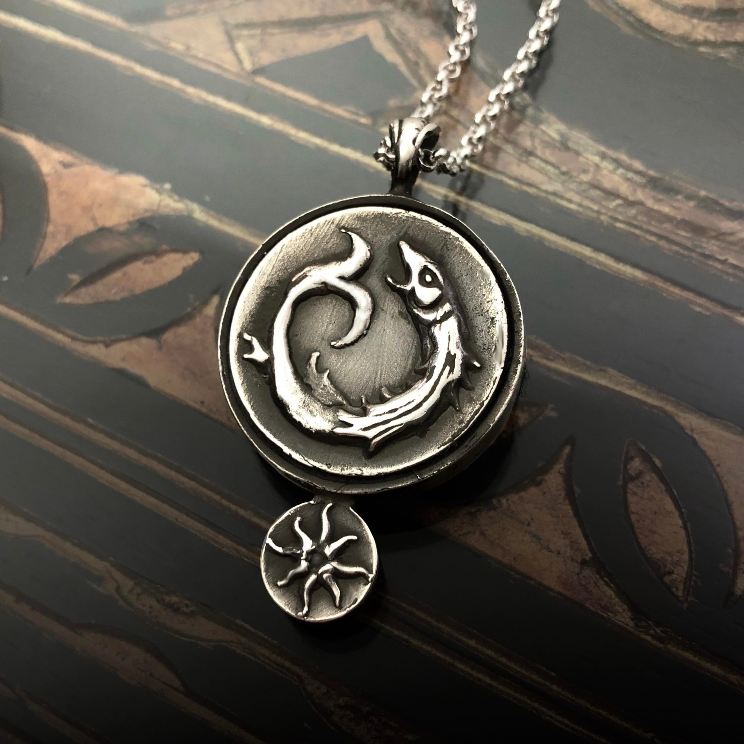 Each talisman arrives in a keepsake jewelry box bearing a wax seal depicting the constellation of the Southern Fish. Pendants and include a 20″ silver chain.