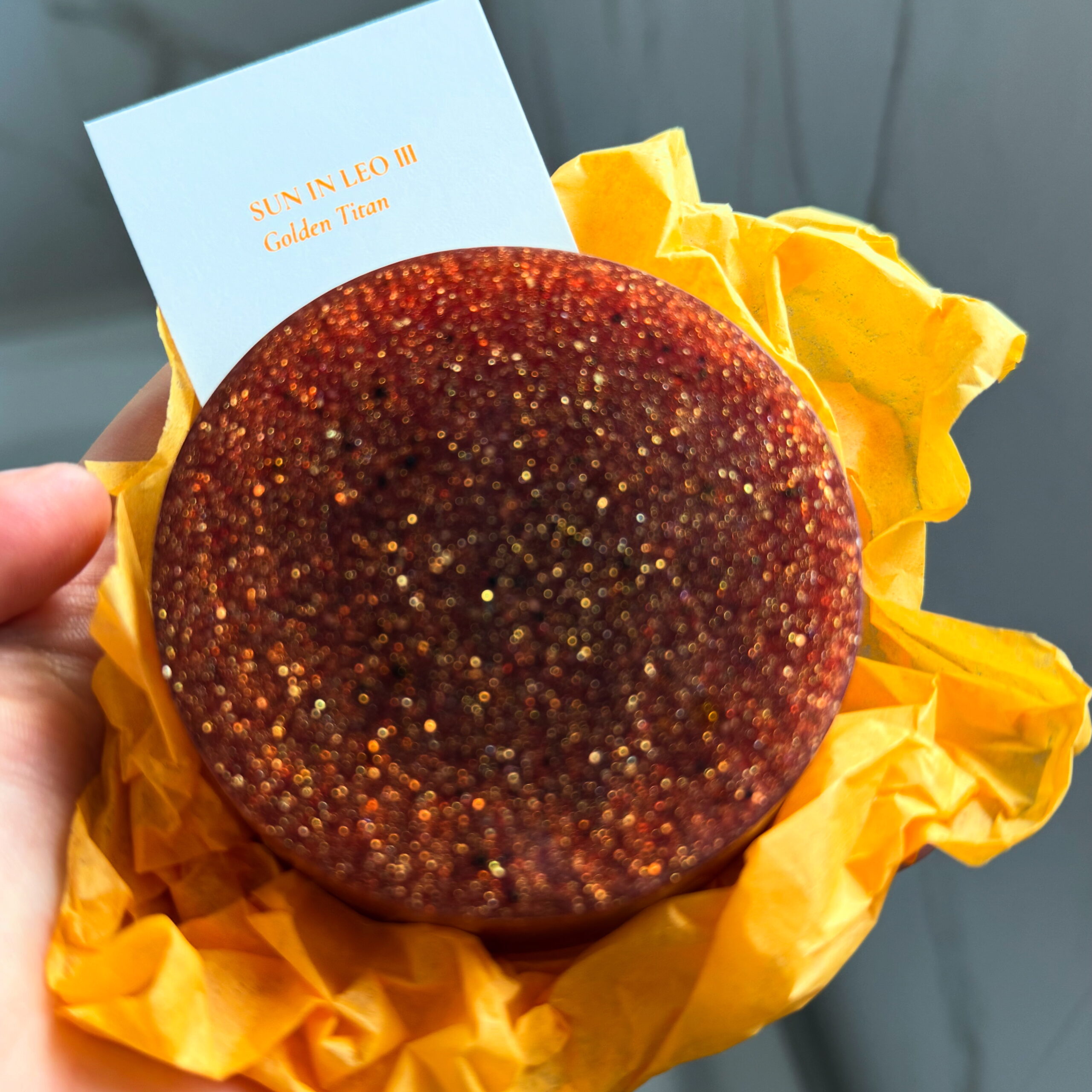 Honey and glycerin-based soaps, infused with consecrated Golden Titan herbal matter, biodegradable glitter, and essential oils of frankincense and blood orange.