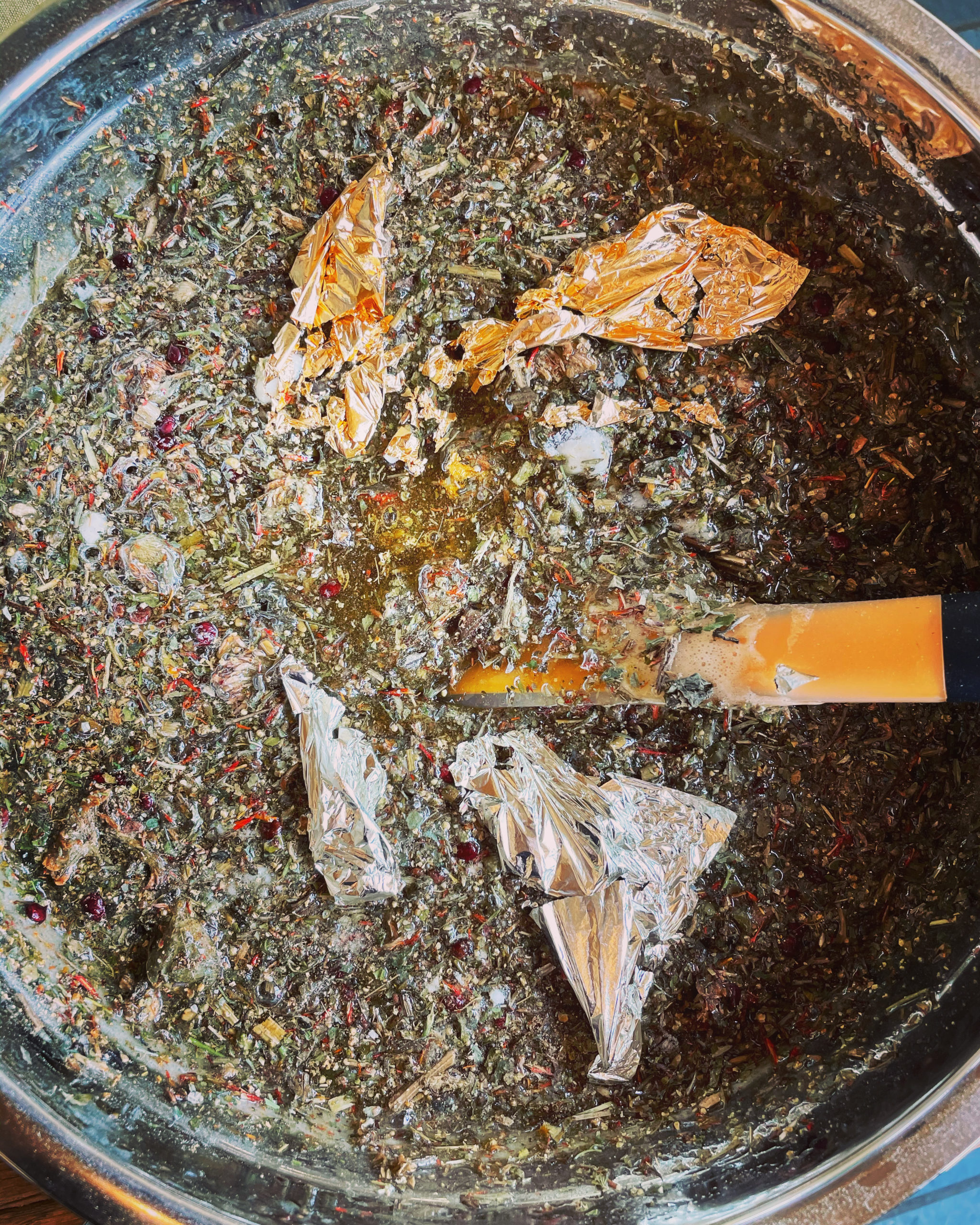 Consecrated Quicksilver Tongue herbal matter immersed in raw, organic honey during Sphere + Sundry’s election window, alongside precious metal alloys of silver + gold (white gold), copper + gold (red gold), opaline, fluorite, and blue opal.