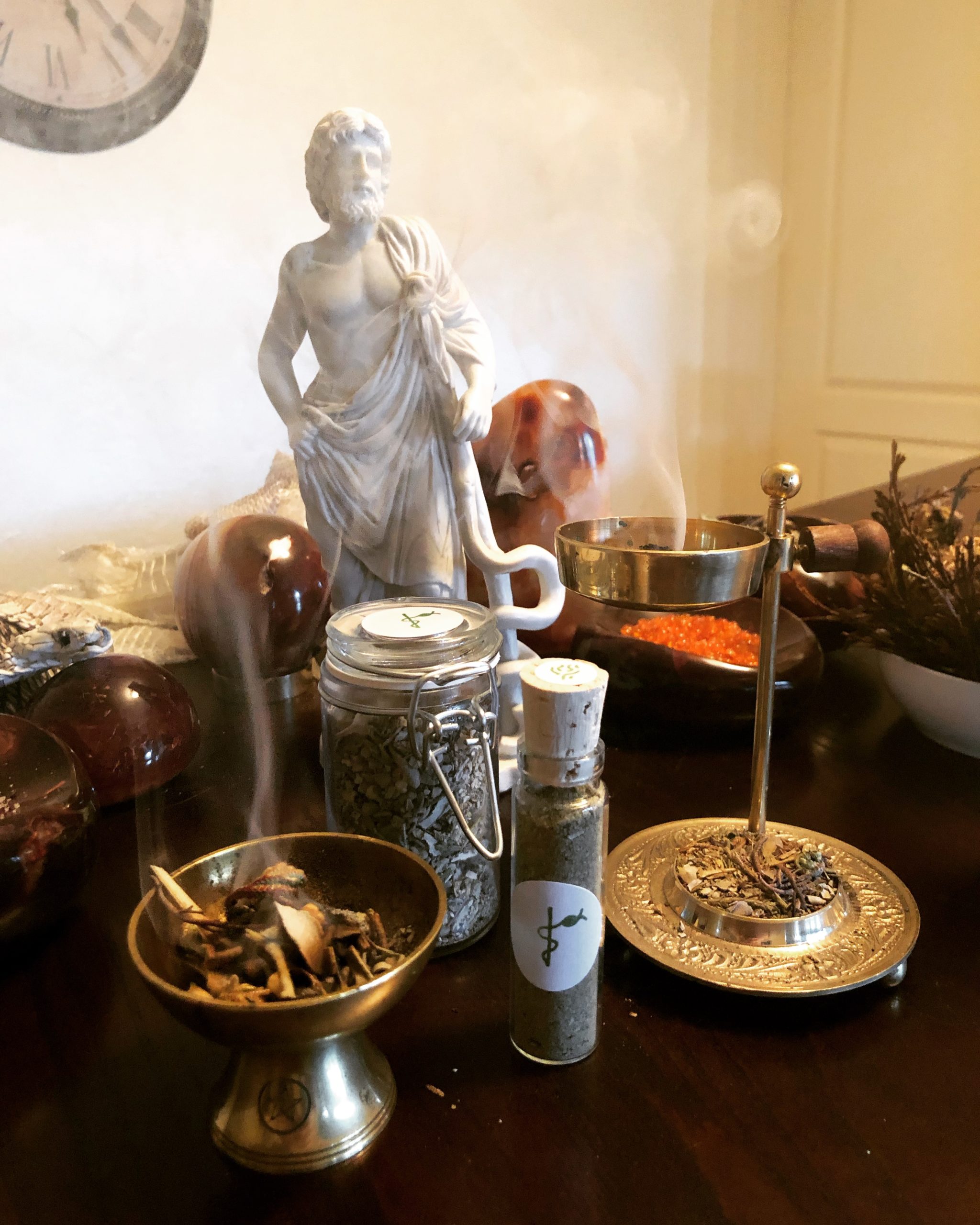 This incense is comprised of cypress, sage, and incense cedar, harvested during the days and hours of Jupiter and Sol before being prayed over in the words of Thessalos, given to him in dream by Asclepius (as detailed in the series description). These were combined with ethically sourced, wildcrafted white sage, rose of jericho, frankincense resin, and 24k gold leaf, before invoking the Divine Physician’s blessing as the fixed star Ras Alhague began rising.