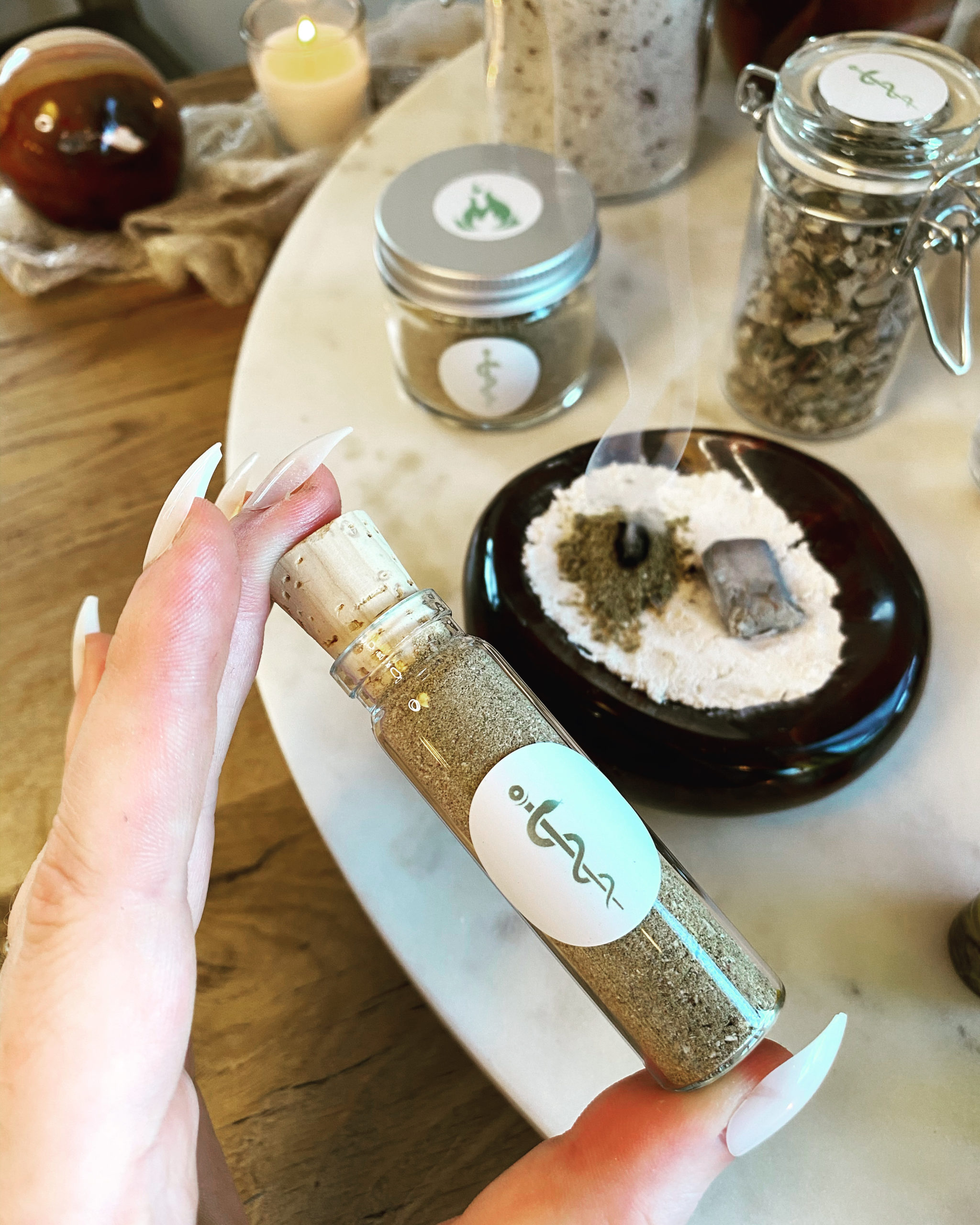 Sphere + Sundry’s classic Asclepius incense formula, ritually created on an election featuring the Moon conjunct the Divine Physician’s patron star, Ras Alhague, in trinal application to the exalted Aries Sun conjunct the IC of the chart.