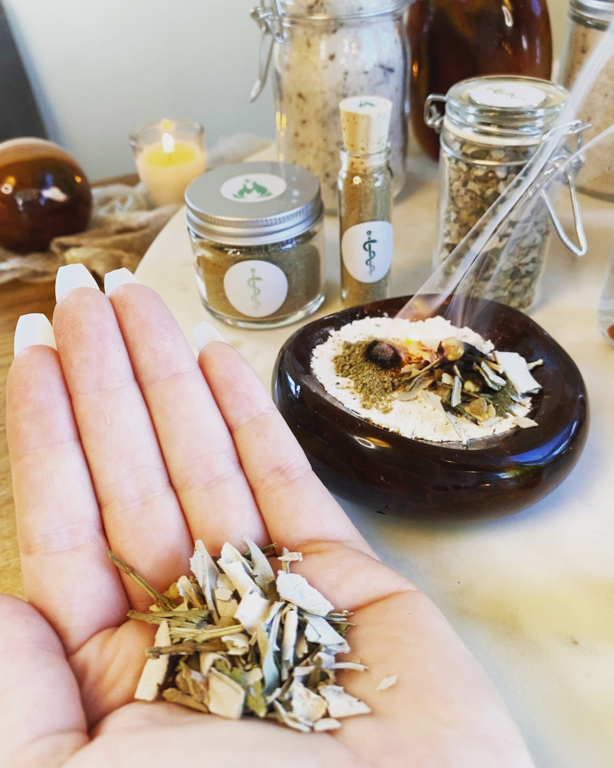 Home-grown white sage native to Southern Oregon and incense cedar, each harvested in the day and hour of Sol following a recitation of The Harvesting Prayer of Thessalos as the Sun exalted in Aries, Rose of Jericho, and frankincense resin.