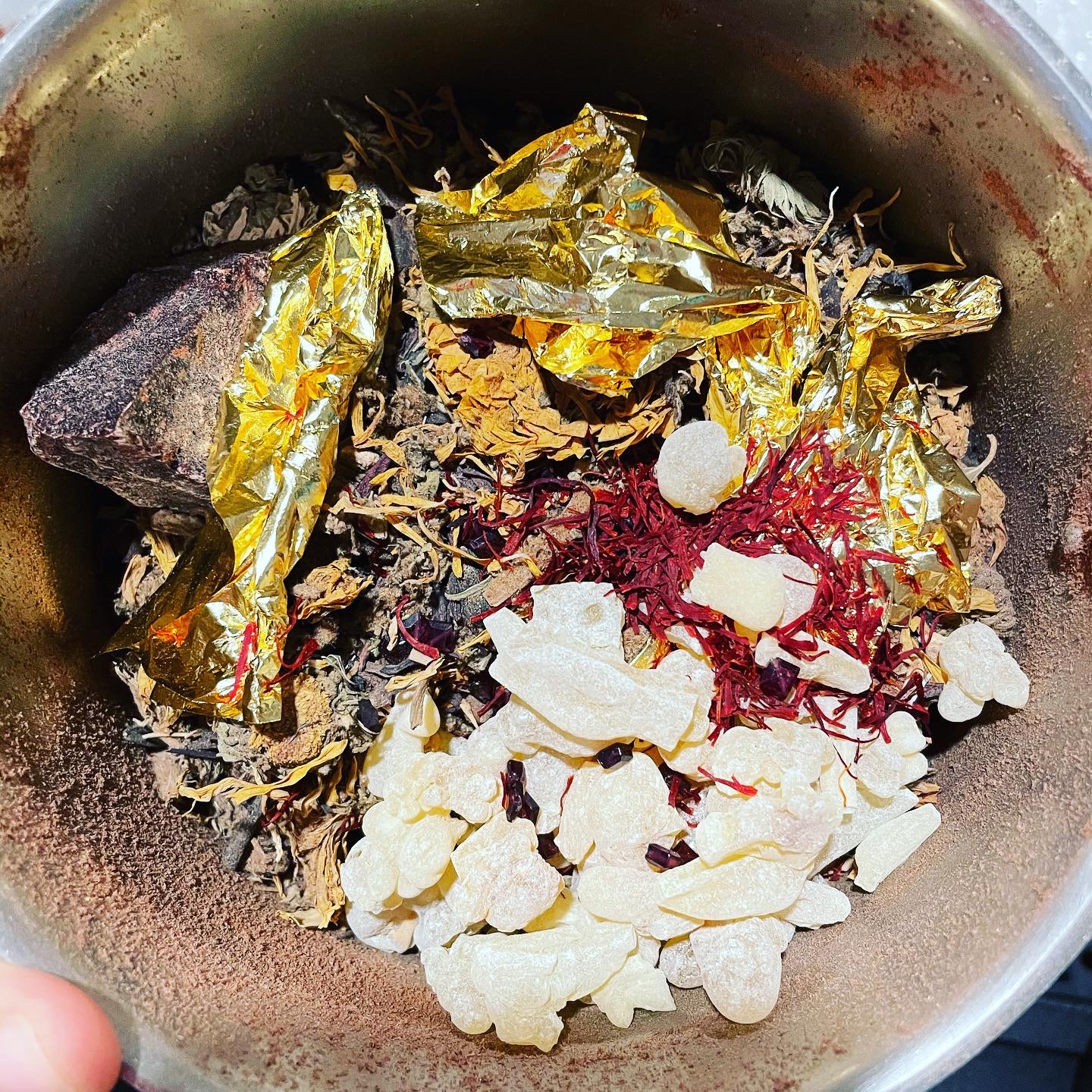 Ground to a fine powder with copious amounts of Hojari frankincense, a touch of dragon’s blood, saffron, garnet, red coral, and genuine 24k gold. Form a small peaked mound or trace a sigil on a bed of ash or fireproof surface before igniting.