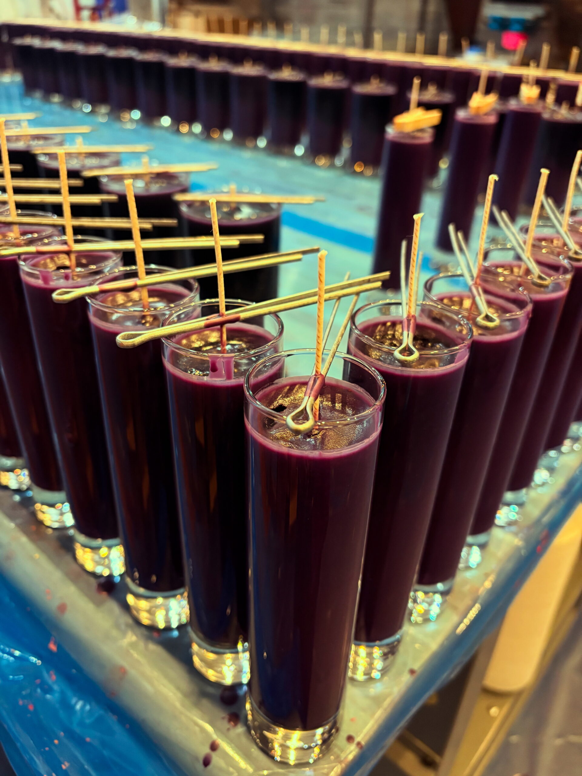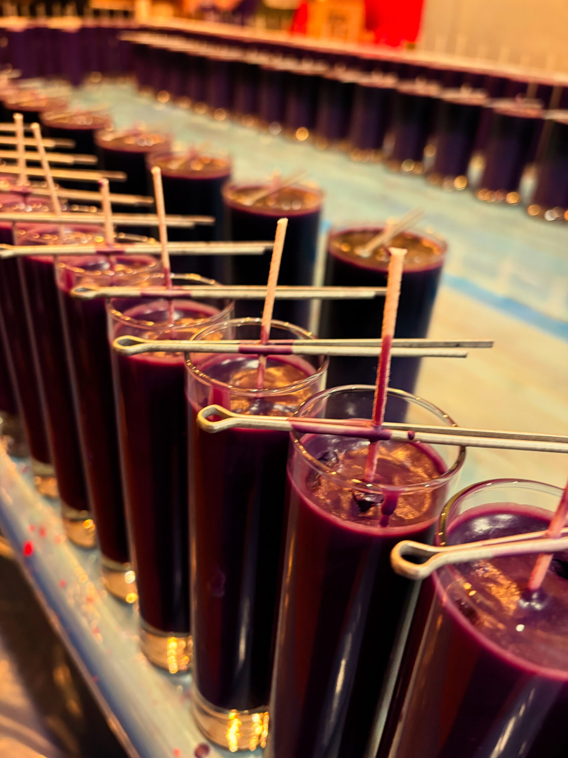 Royal purple candles poured over consecrated, powdered Jupiter in Cancer: Sublime Dynamo herbal base with royal hojari frankincense, myrrh resin, and 24k gold.
