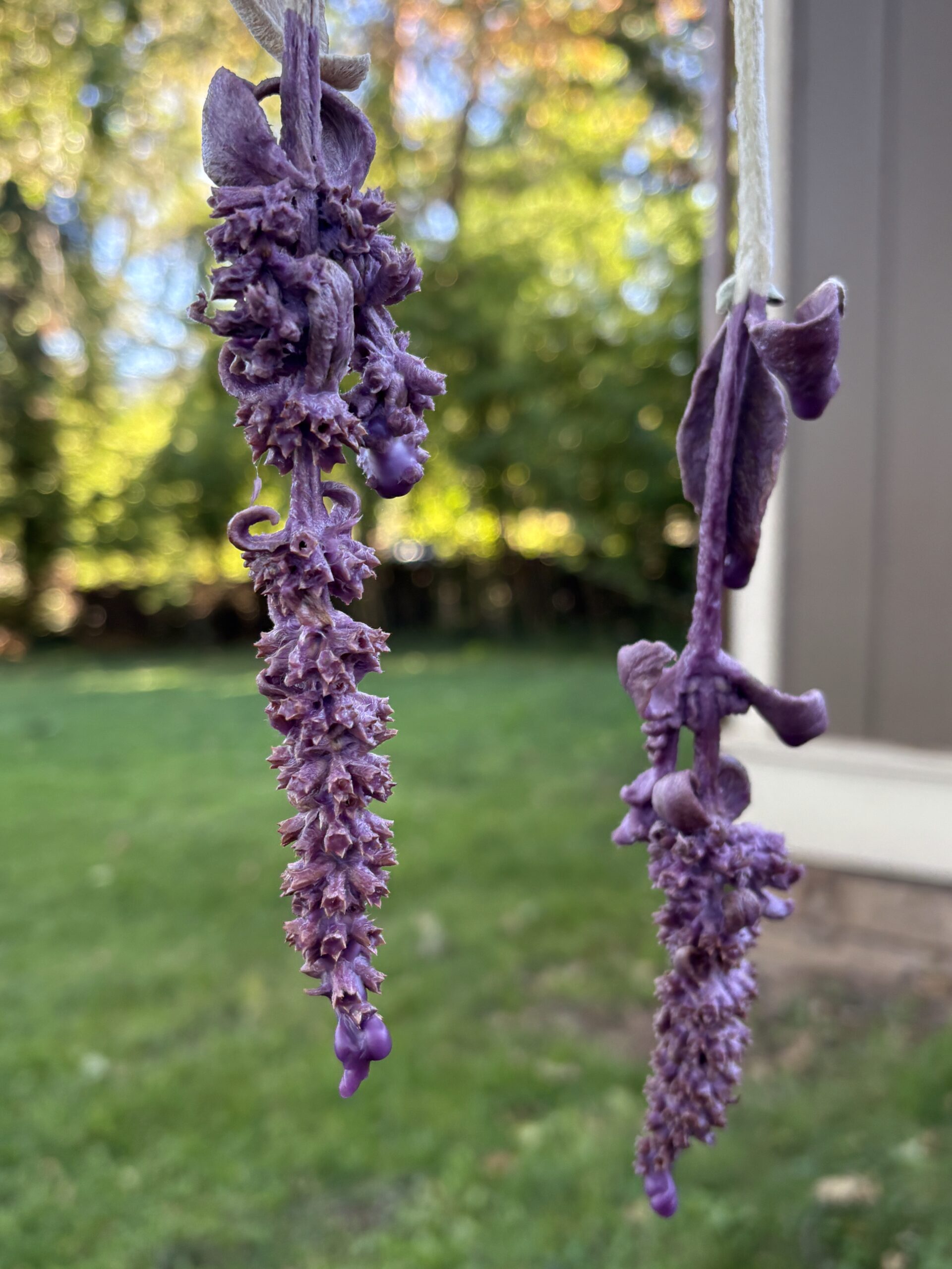 Home-grown lamb’s ear stalks, harvested during Jupiter’s hour and dried. Dipped in royal purple beeswax and sprinkled with powdered, consecrated Exalted Jupiter materia at the height of our Sublime Dynamo election. Dipped 4 times total to thicken the coating.