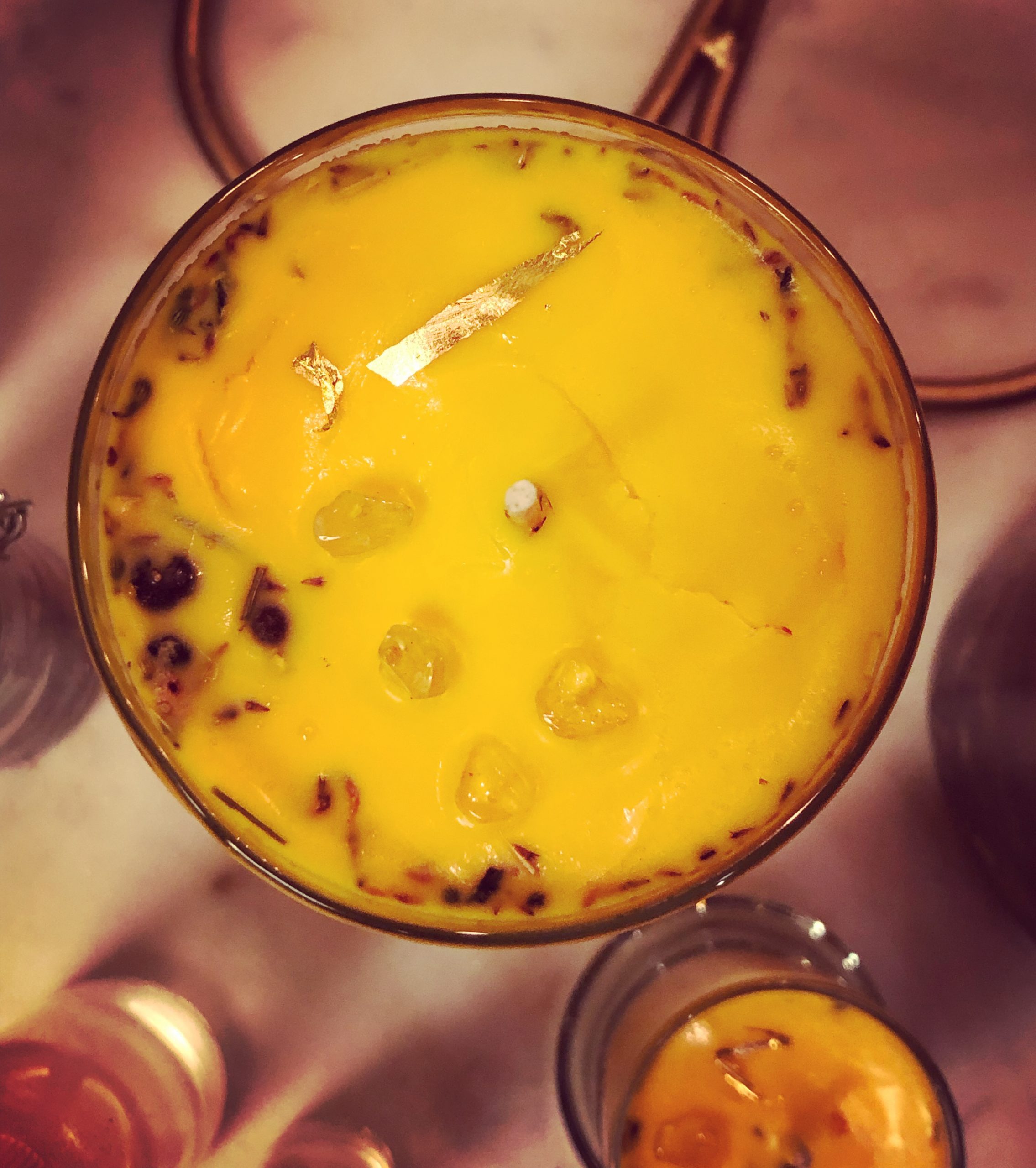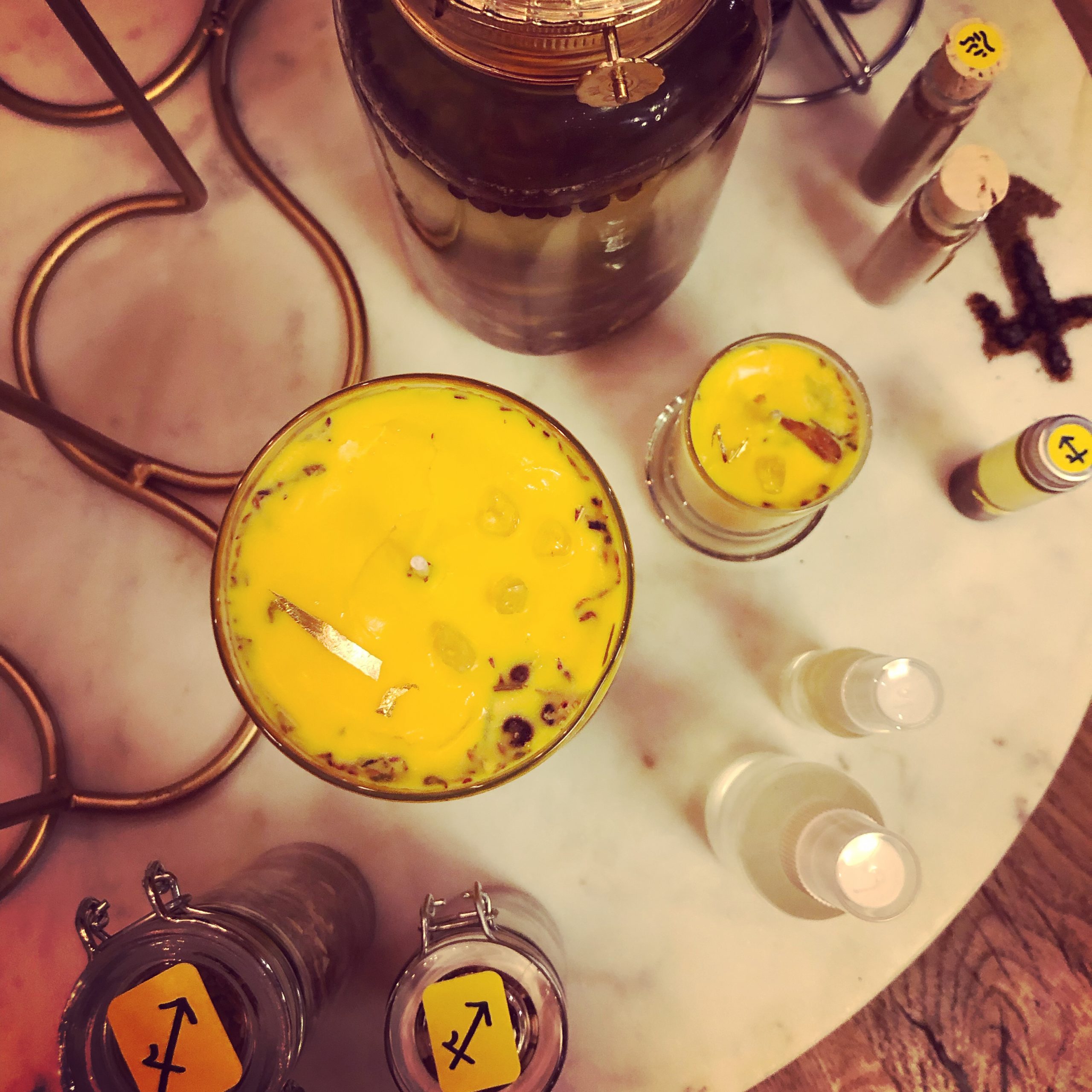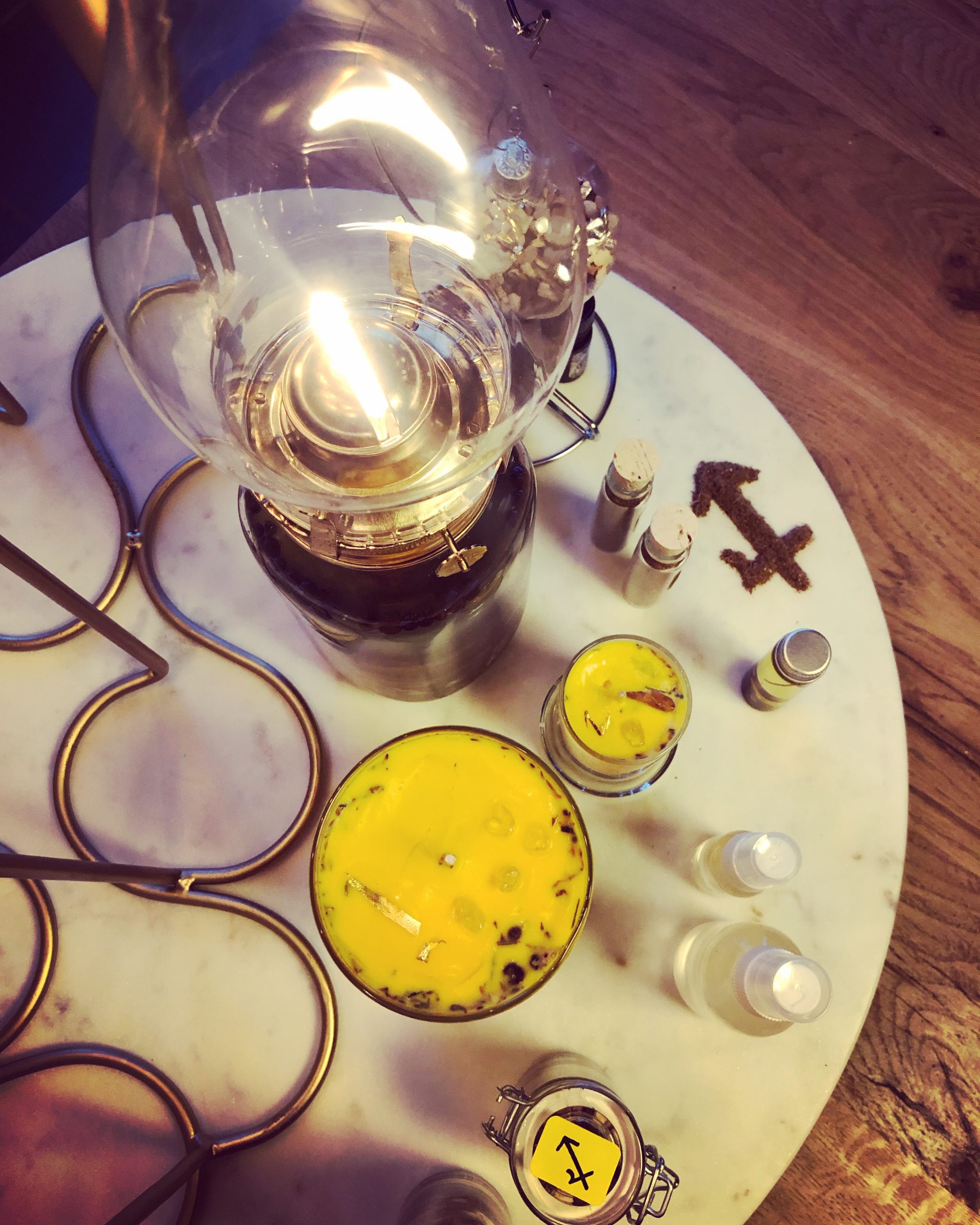 Non-GMO soy wax, dyed bright yellow and poured over consecrated Jupiter in Sagittarius herbal mix during the height of the series election with a small amount of frankincense essential oil. Crowned with citrine and gold leaf, as a nod to Regulus’ background influence and Jupiter’s incorruptible spirit.