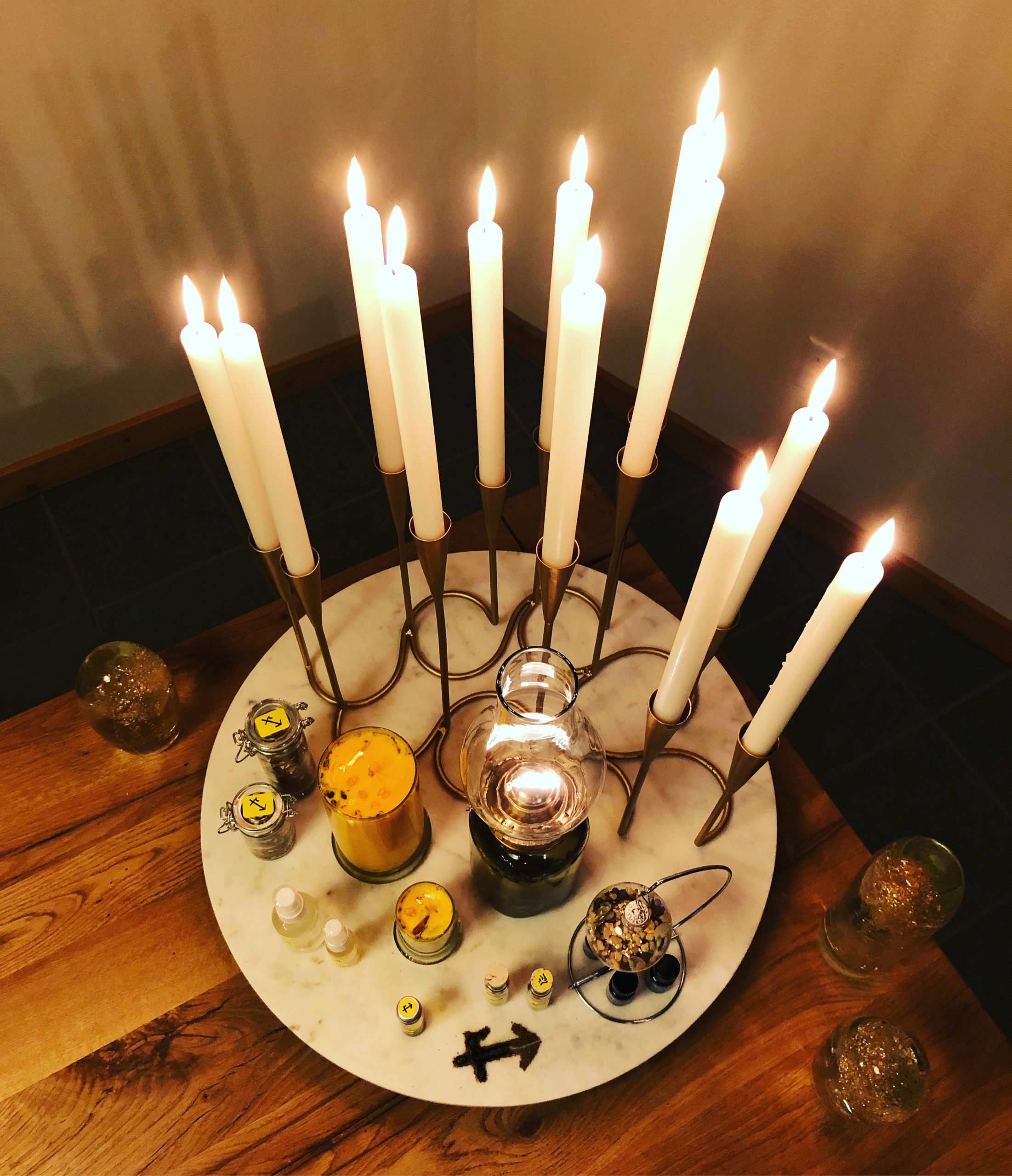 Arrives in glass jars bearing the Jupiter in Sagittarius glyph on the bottom in 2 oz for $92. Two extra large 24 oz candles are also being offered to the public for $272