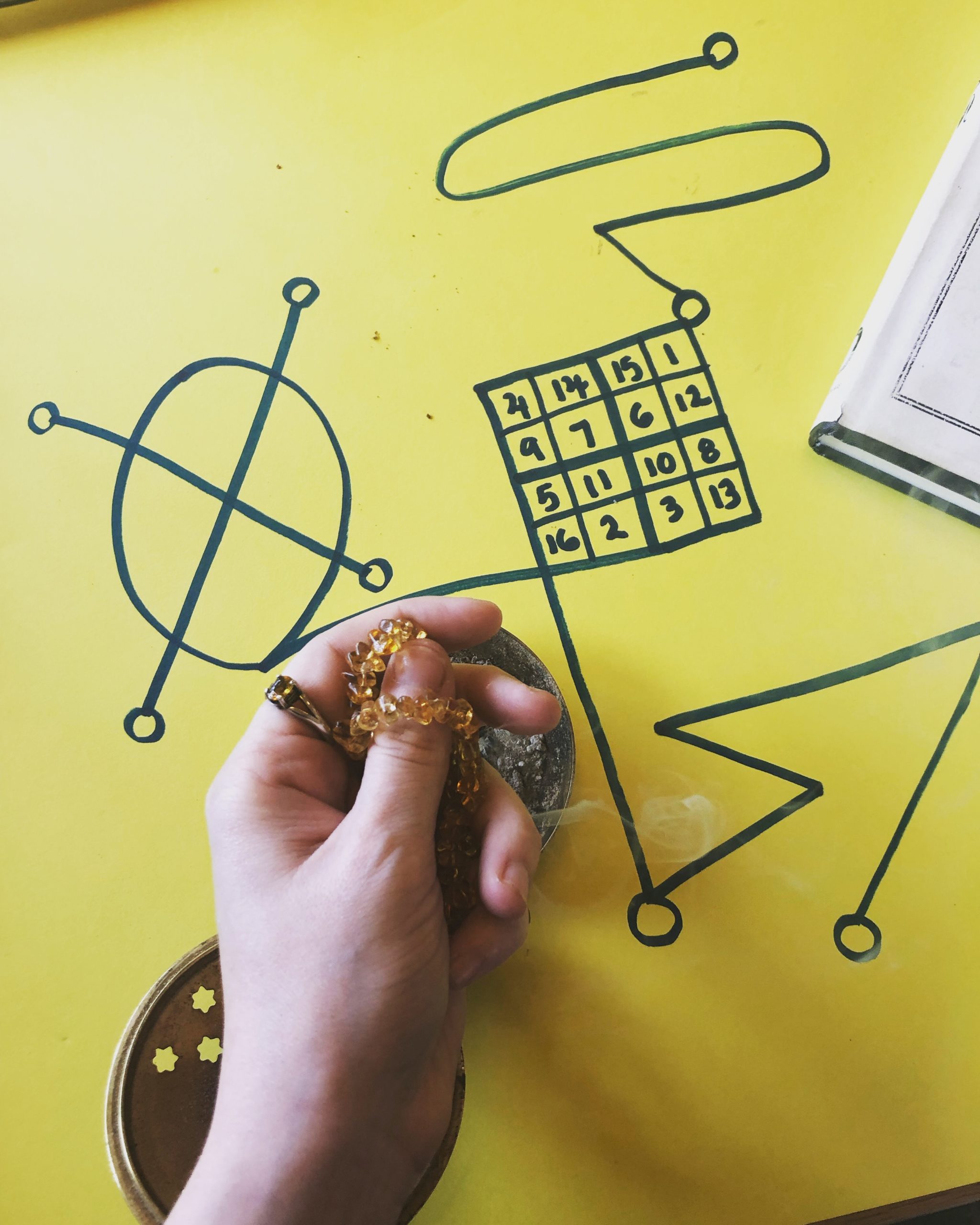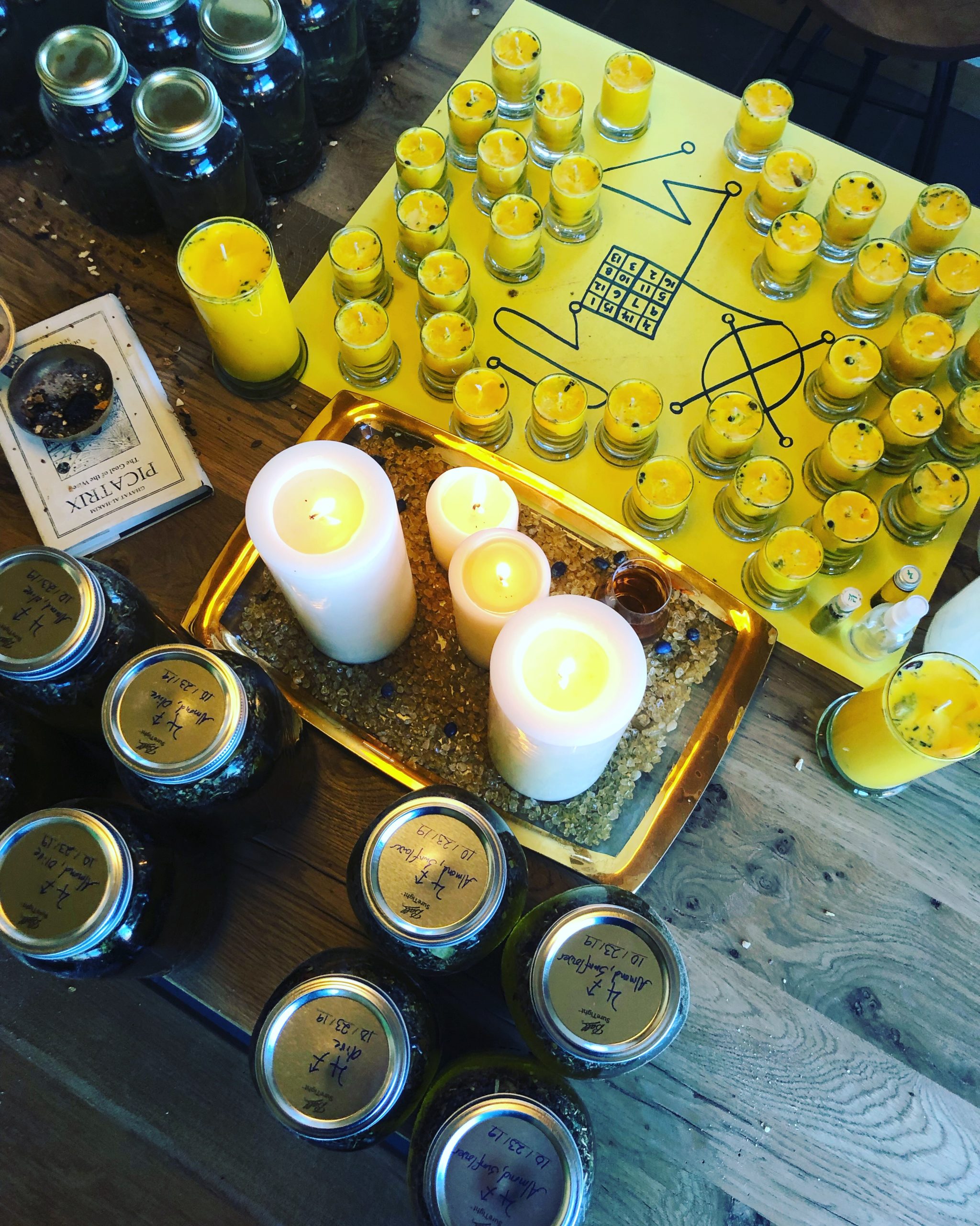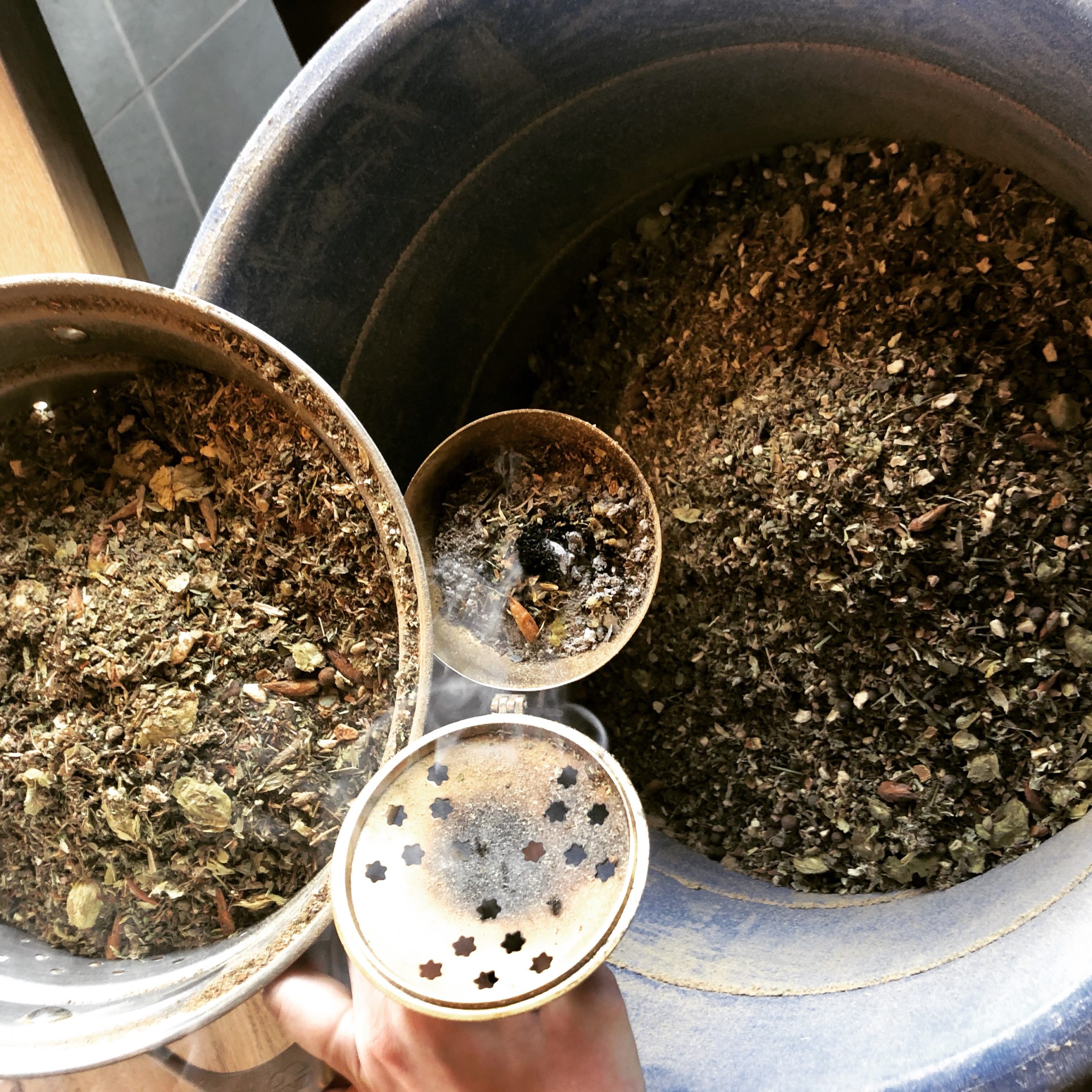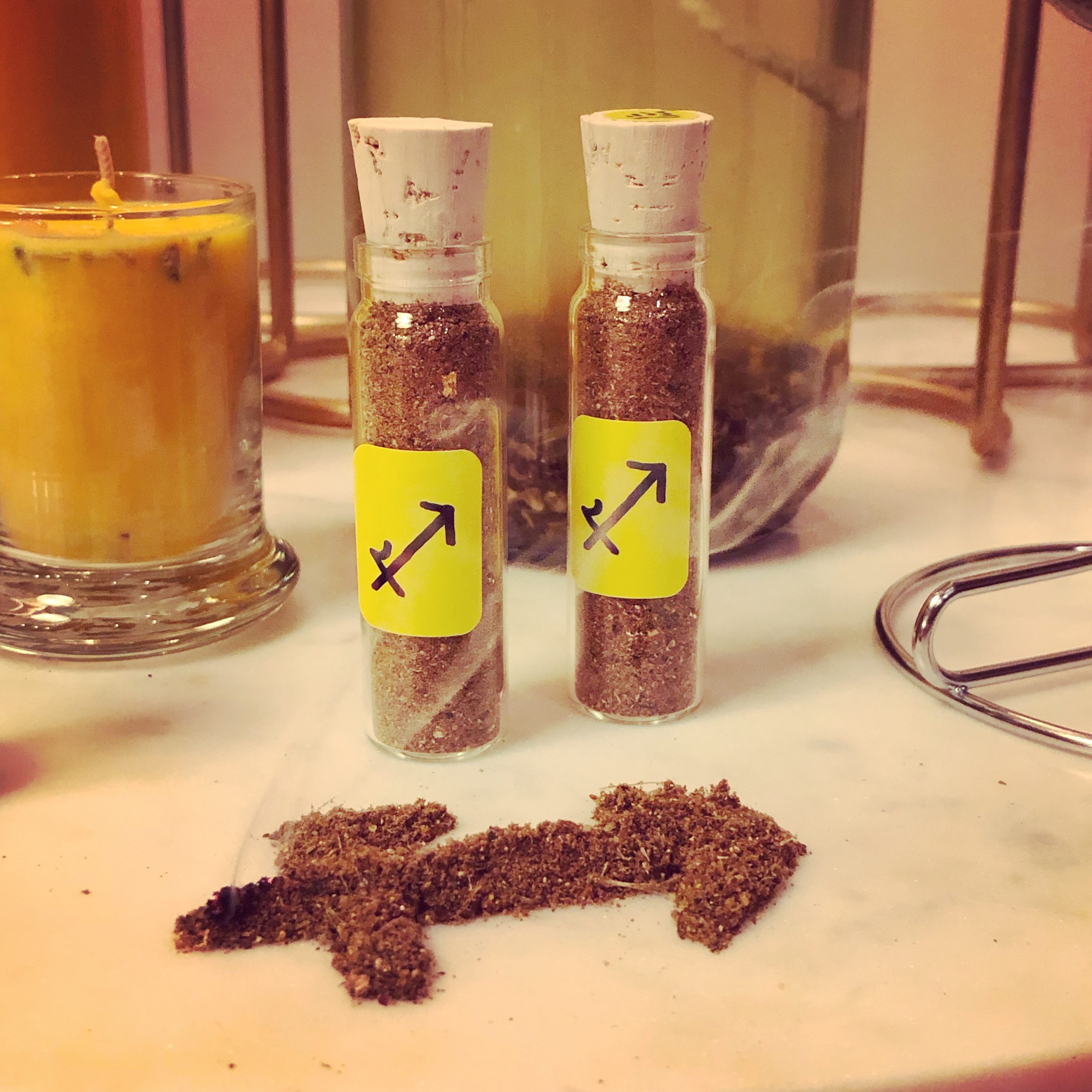 A blend of 100% organic warming spices, such as cinnamon bark, clove, allspice, and orange peel as an uplifting, brightening nod to Regulus, with other ingredients of a Jupiterian virtue, including hops, ritually harvested home grown lamb’s ear, frankincense resin, genuine gold and silver leaf, citrine, and more, ritually combined and suffumigated in dedication to Jupiter after issuing the full call from The Picatrix.