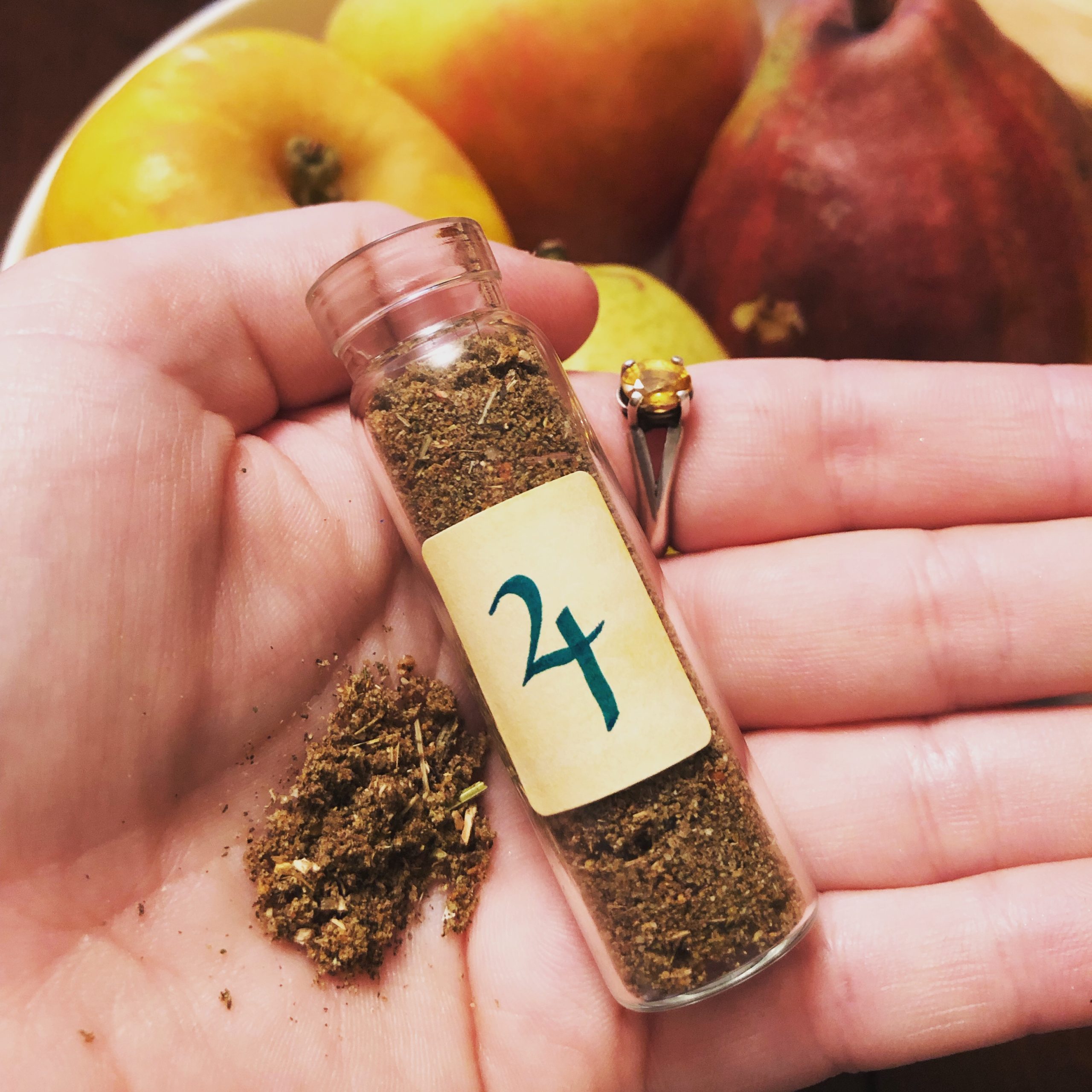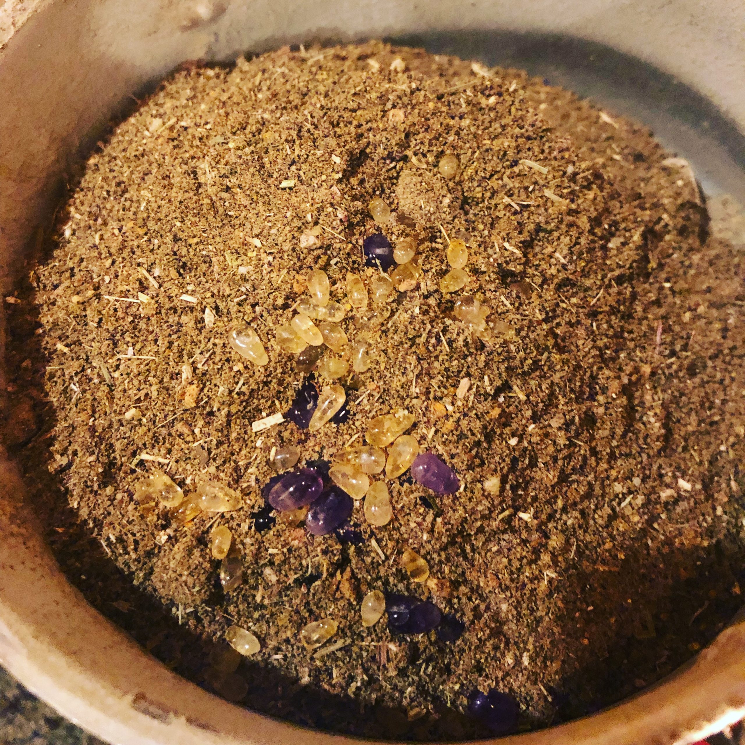 Organic dried and freeze-dried fruits, mixed nuts, holy basil, red clover, dandelion root, wormwood, pie spice, other Jupitarian herbs, citrine, and amethyst, ritually combined and suffumigated after an offering feast to Jupiter on a prime astrological election.