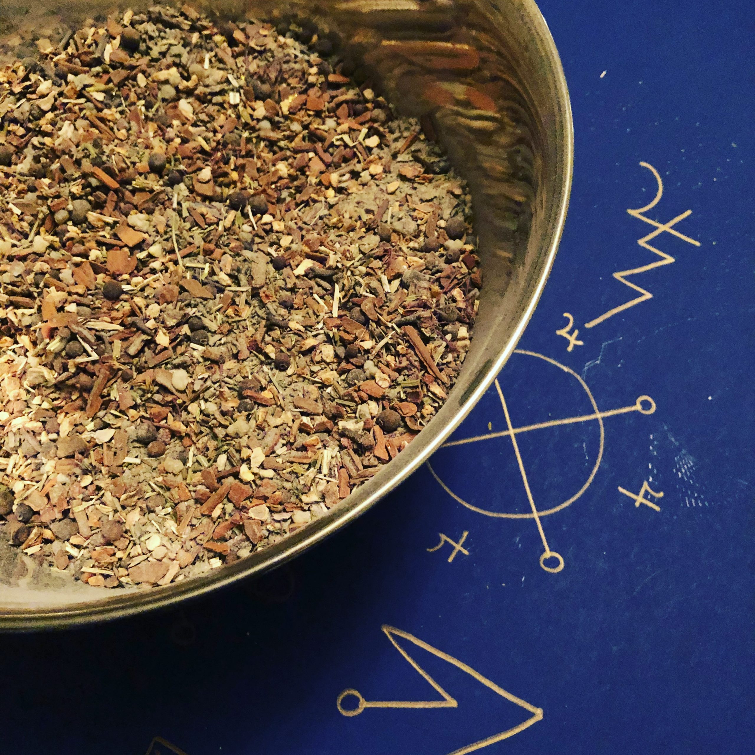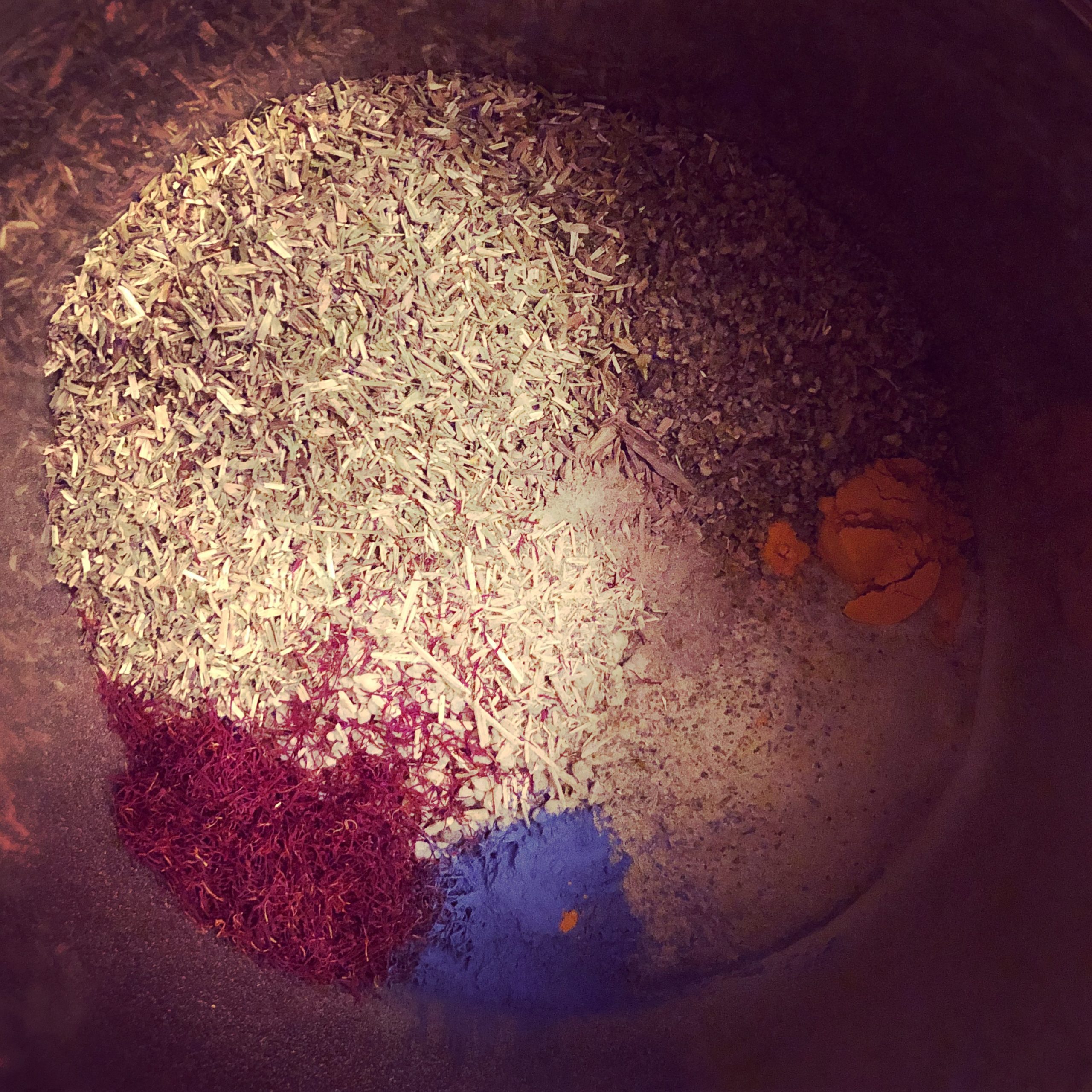 Saffron, lightning struck peach wood, fulgurite, lapis lazuli, 24k gold leaf, frankincense resin, cinnamon, allspice, clove, orange peel, mullein, and other Jupitarian herbs were ritually suffumigated and combined with organic sunflower and walnut oils, along with ghee.