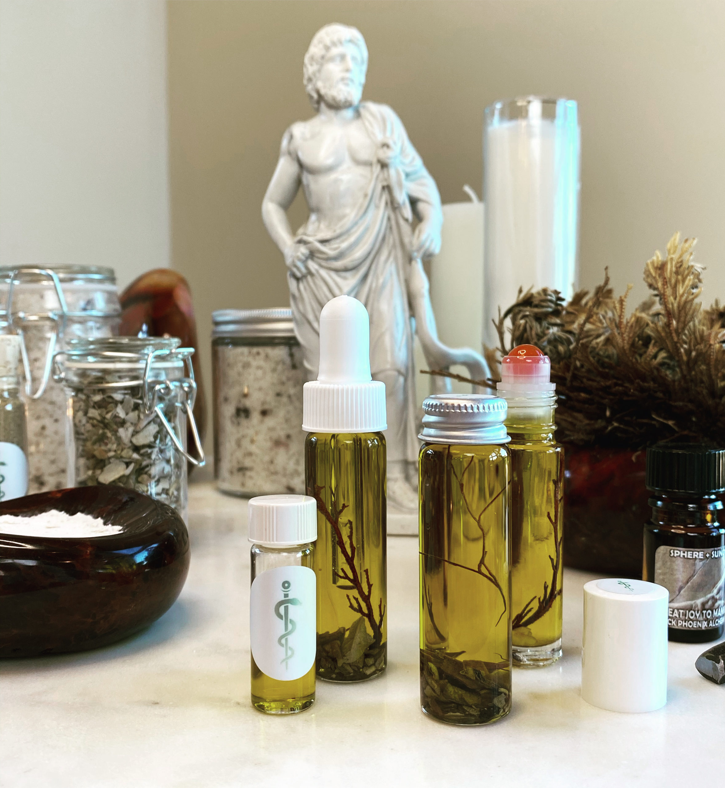 Sphere + Sundry’s classic Asclepius oil, ritually infused on an election featuring the Moon conjunct the Divine Physician’s patron star, Ras Alhague, in trinal application to the exalted Aries Sun conjunct the IC of the chart.