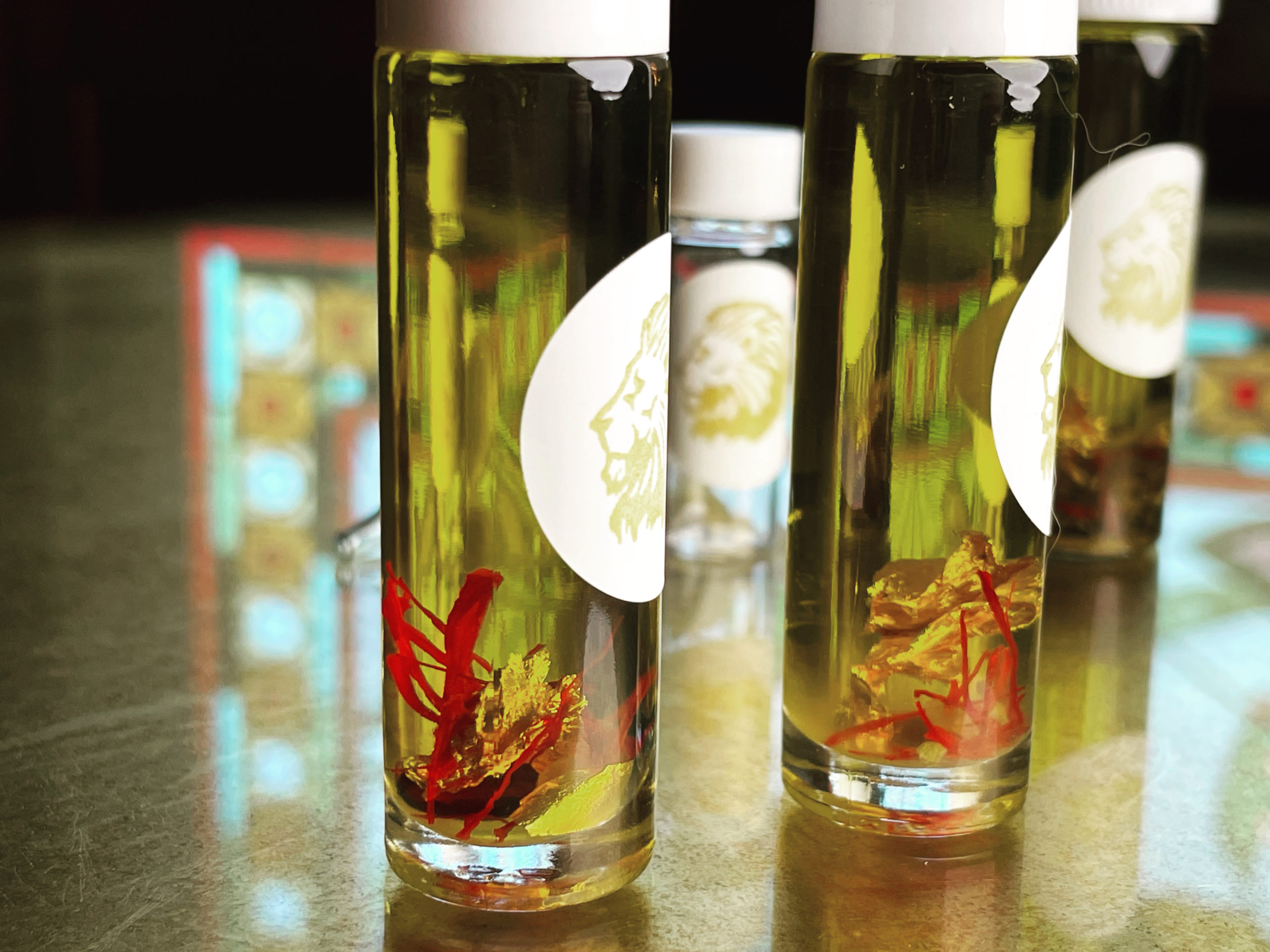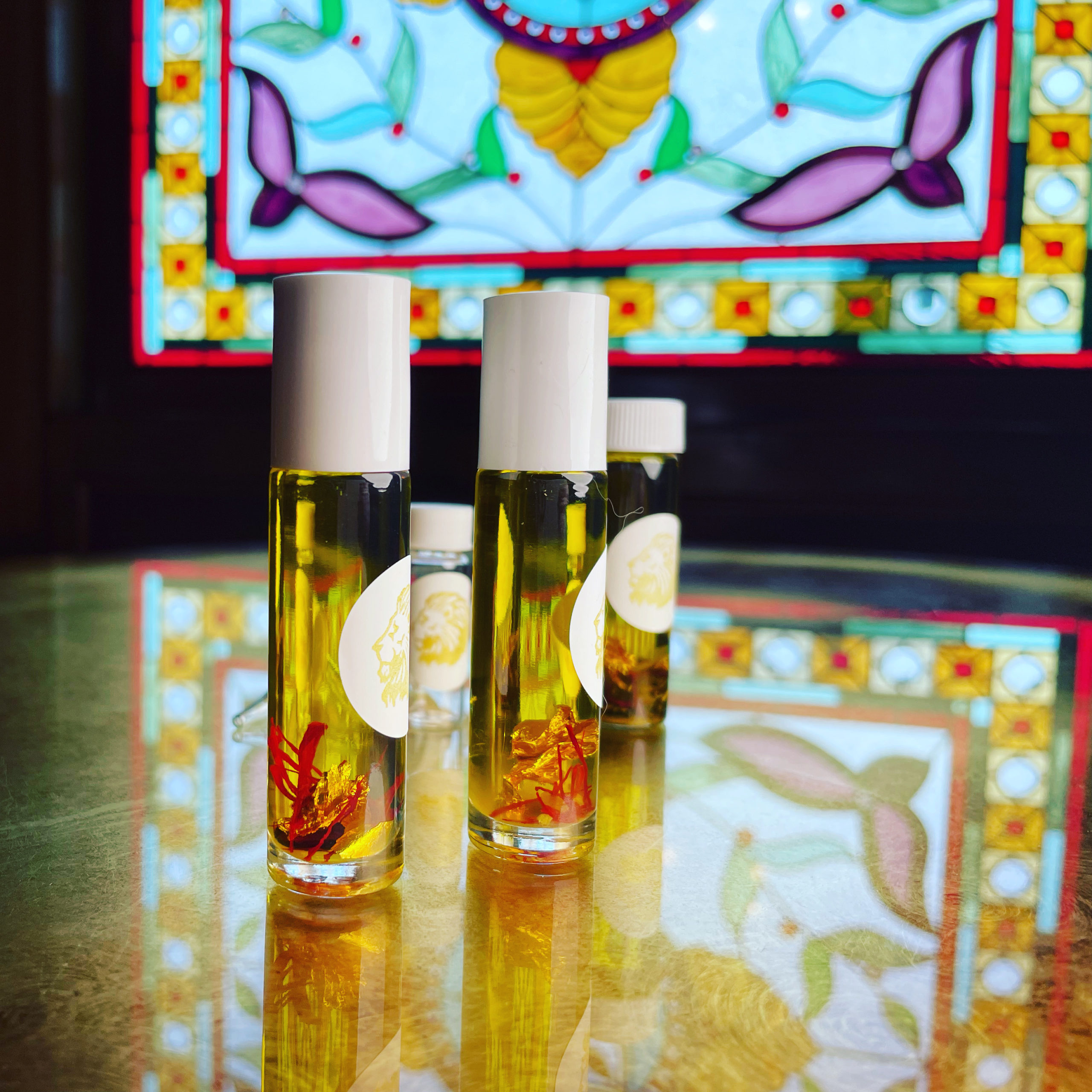 24k gold, saffron, frankincense, bee pollen, dandelion root, chrysanthemum, calendula, eyebright, red ginseng, goldenseal, orange peel, turmeric, wormwood, and St. John’s wort, helichrysum, and amber, married to 100% organic golden jojoba oil (truly a liquid wax) following prayers and propitiations for All the Regulus Things.