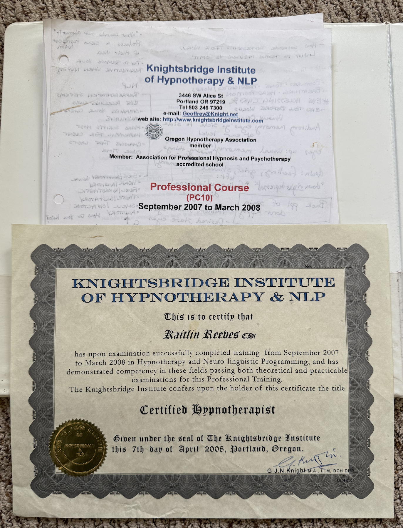 In April of 2008 following 175-hours of in-person training with additional field-work, I graduated the Knightsbridge Institute of Hypnotherapy and NLP, becoming a Certified Hypnotherapist (CHt) in the state of Oregon.