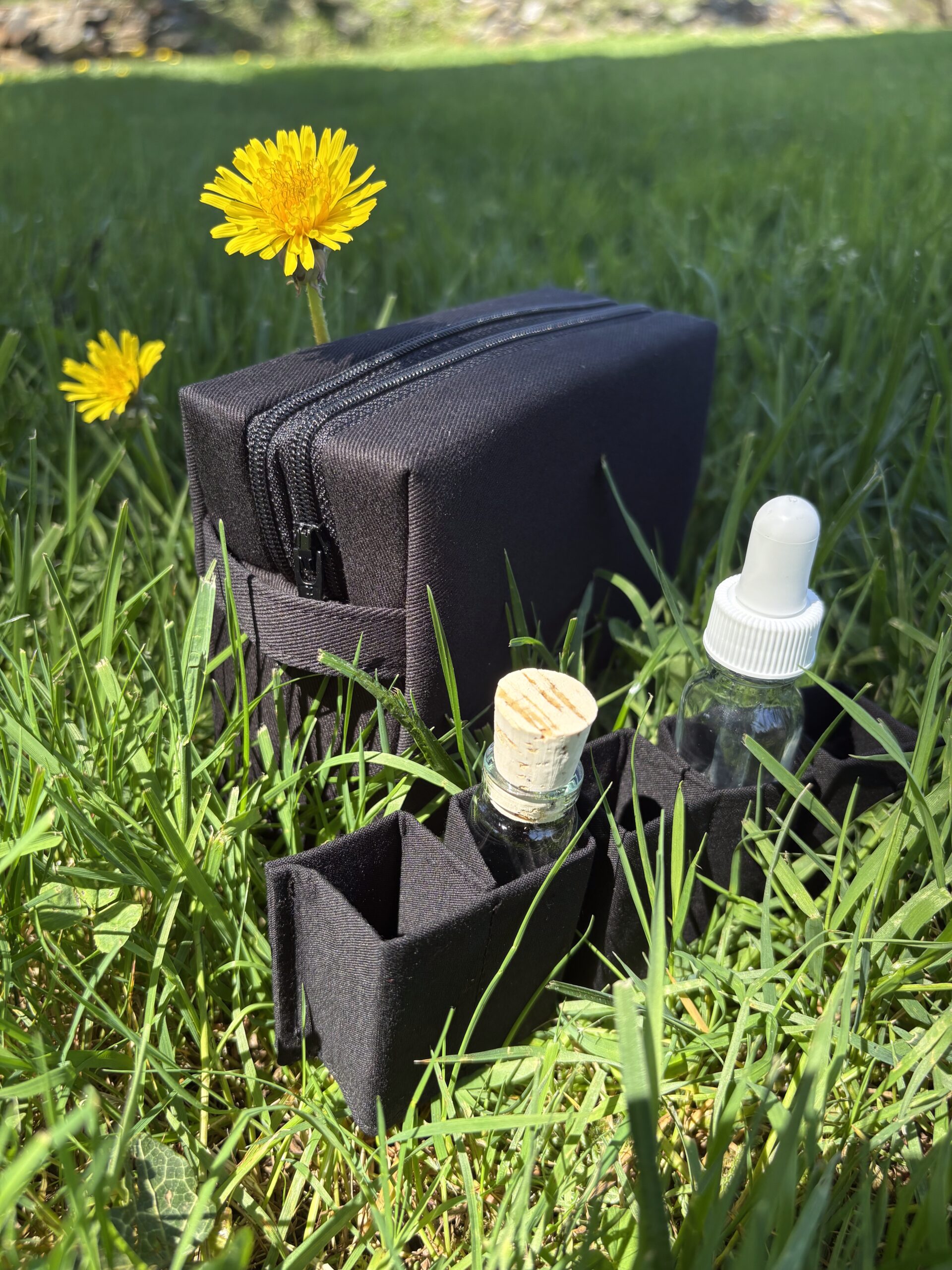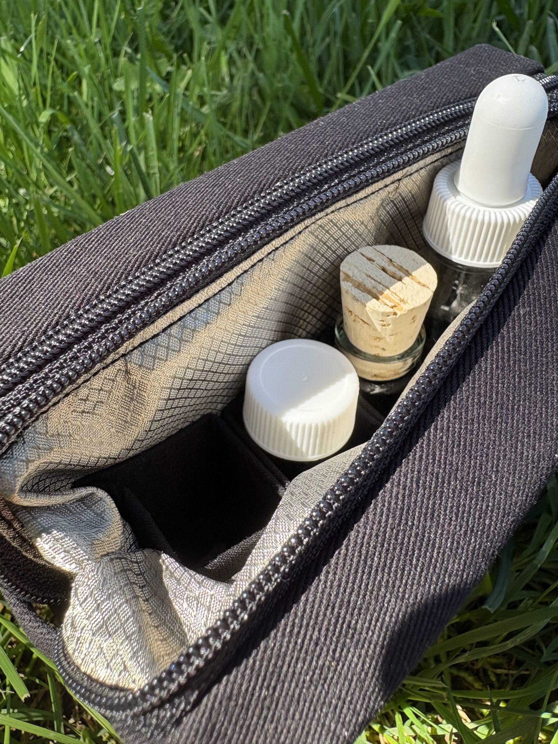 This bag with the dividers is an excellent solution for storage and travel. The 1/2 oz powders, oils, tinctures, sprays, BPALs all fit perfectly. Beautifully and thoughtfully constructed.