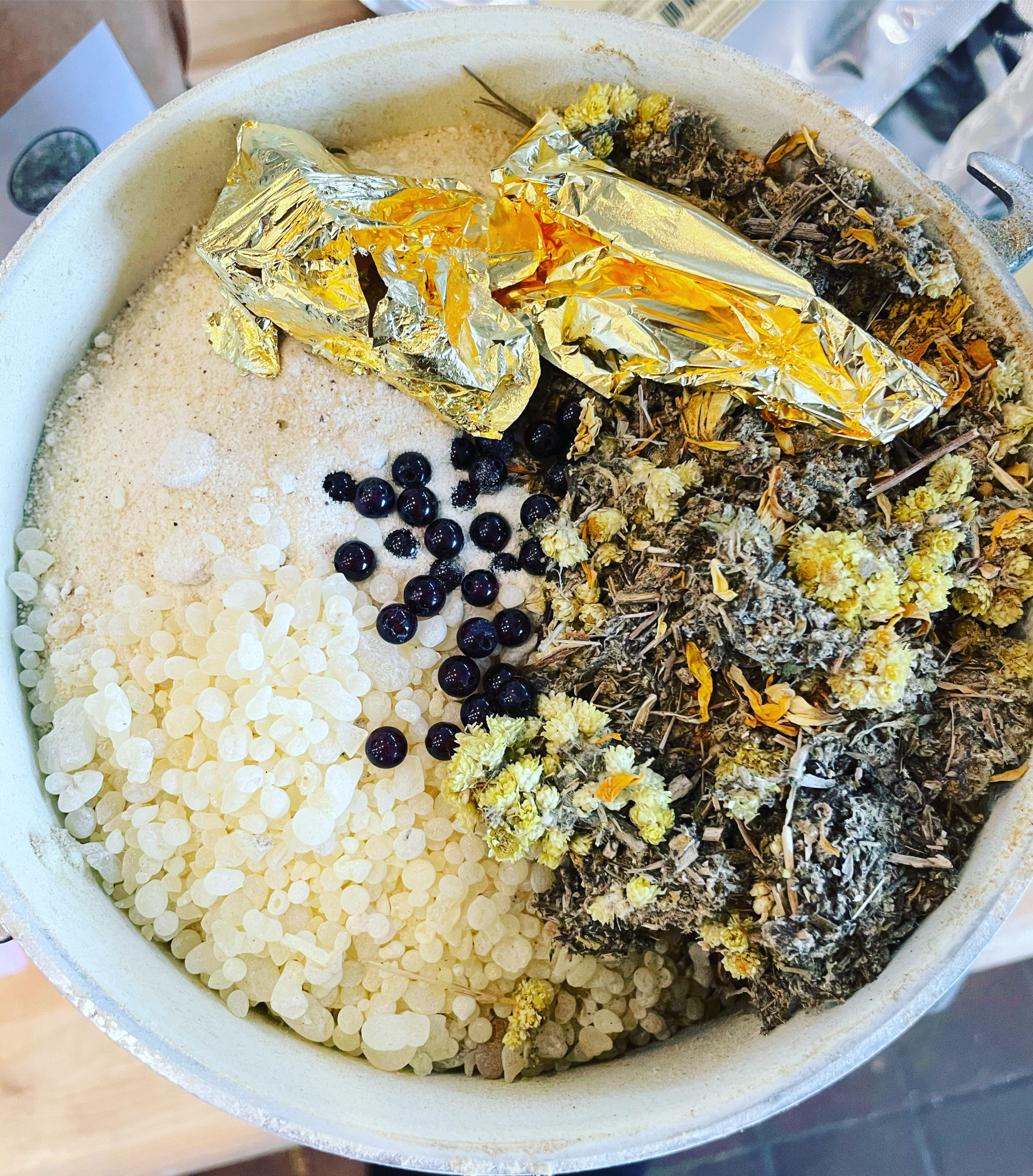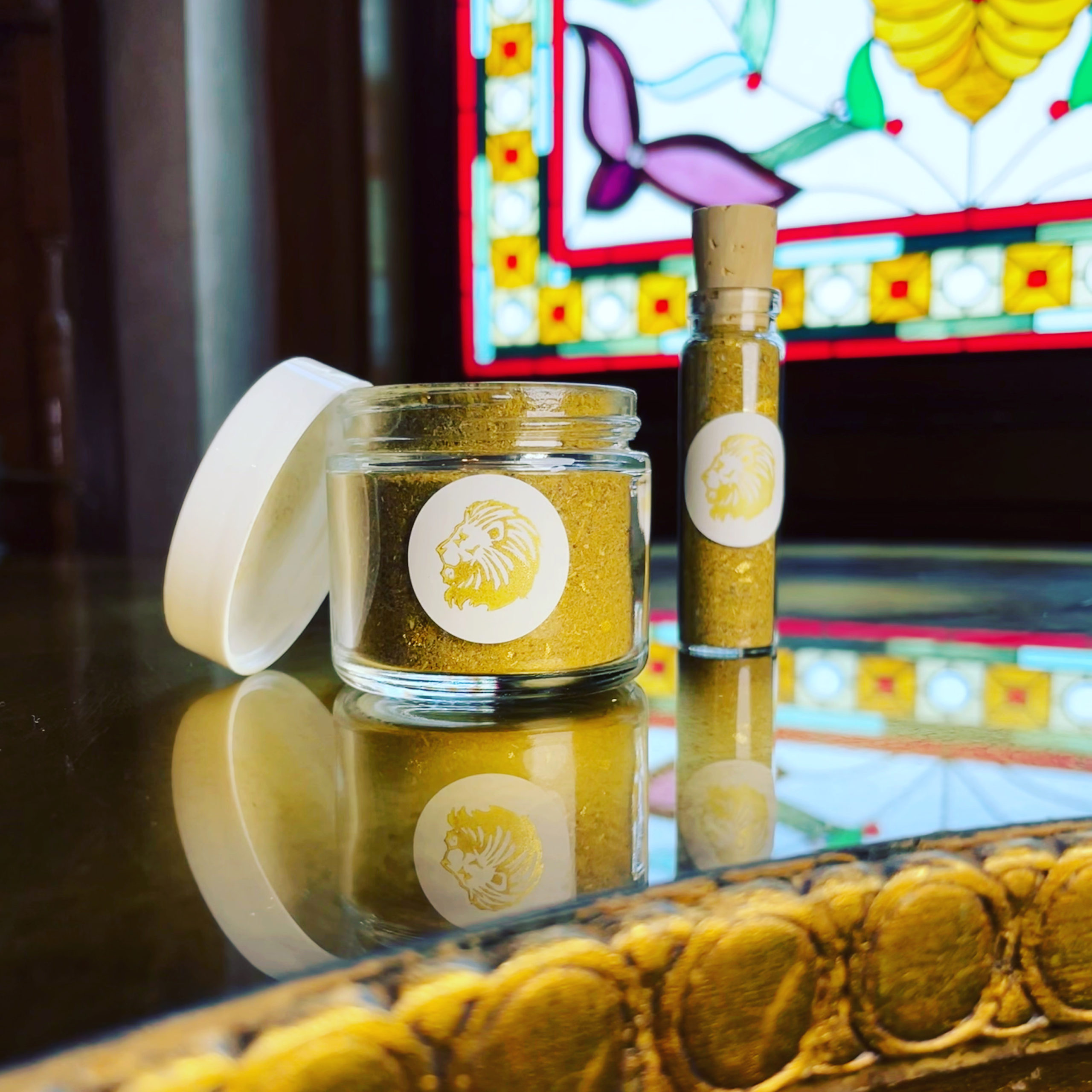 These, along with frankincense, 24k gold, saffron, chrysanthemum, calendula, dandelion root, orange peel, red ginseng, and other plants allied to the powers of empowerment, light, and leadership, were ritually combined, fumigated, and consecrated, during an election featuring the freshly ingressed, waxing Virgo Moon conjunct Regulus, applying to an aspect with Jupiter in Pisces (forming a strong and fortuitous Gaja Kesari yoga).