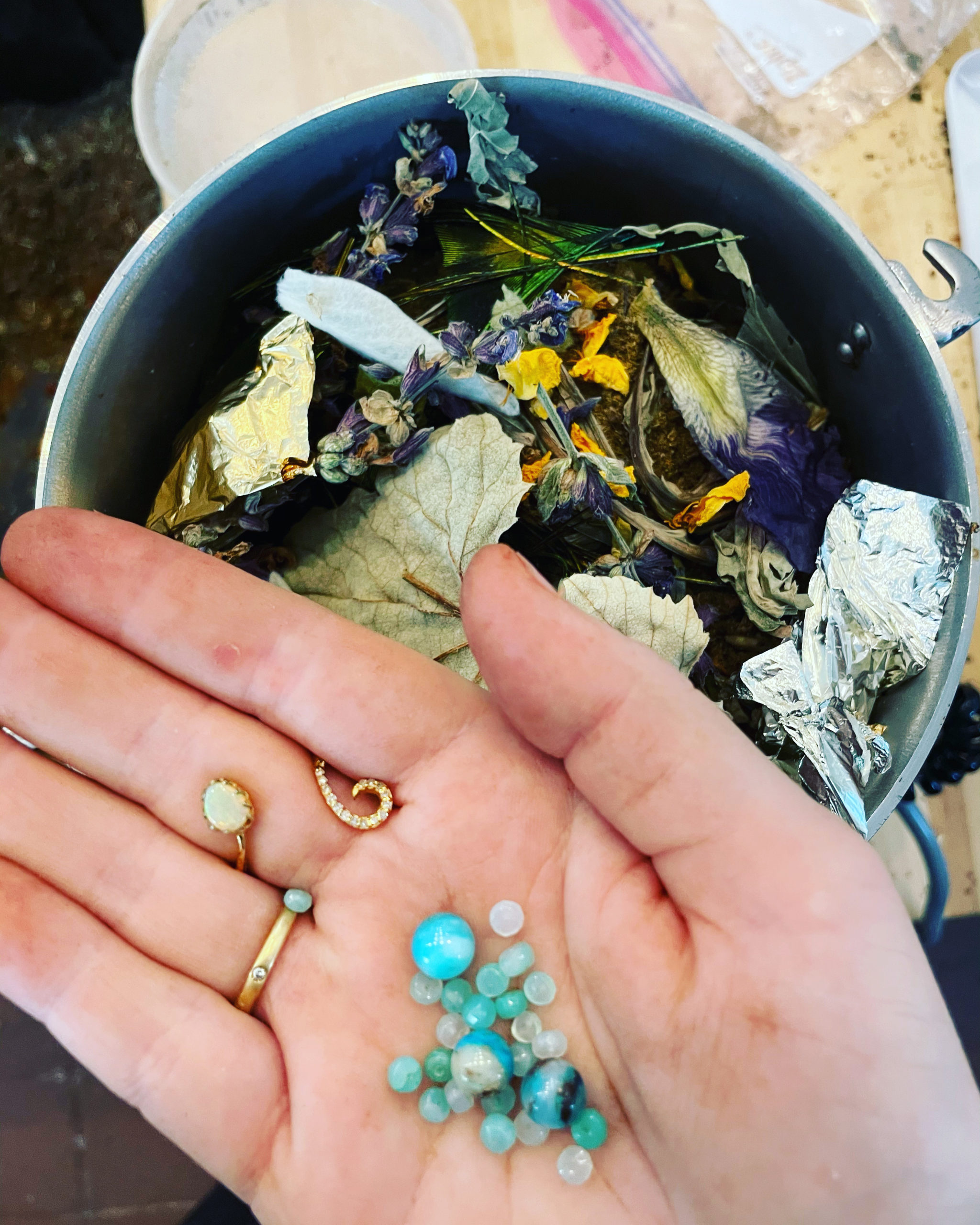 Quicksilver Tongue herbal mix, consecrated via fumigation and prayers during Sphere + Sundry’s election, later ground alongside vanilla bean, sandalwood, myriad resins, essential oils, and opal. Flecks of precious metal alloys: silver + gold (white gold), gold + copper (red gold).