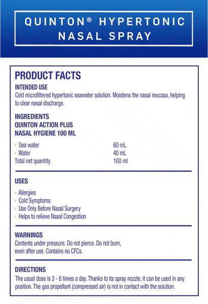 Quinton® Action Plus Nasal Spray provides a hydrating nasal mist derived from mineral-rich cold microfiltered seawater, designed to support nasal and sinus passage wellness and healthy breathing. Action Plus is designed for acute use, recommended for pre-operative nasal surgery, occasional cold symptoms, and seasonal discomforts to support passages.