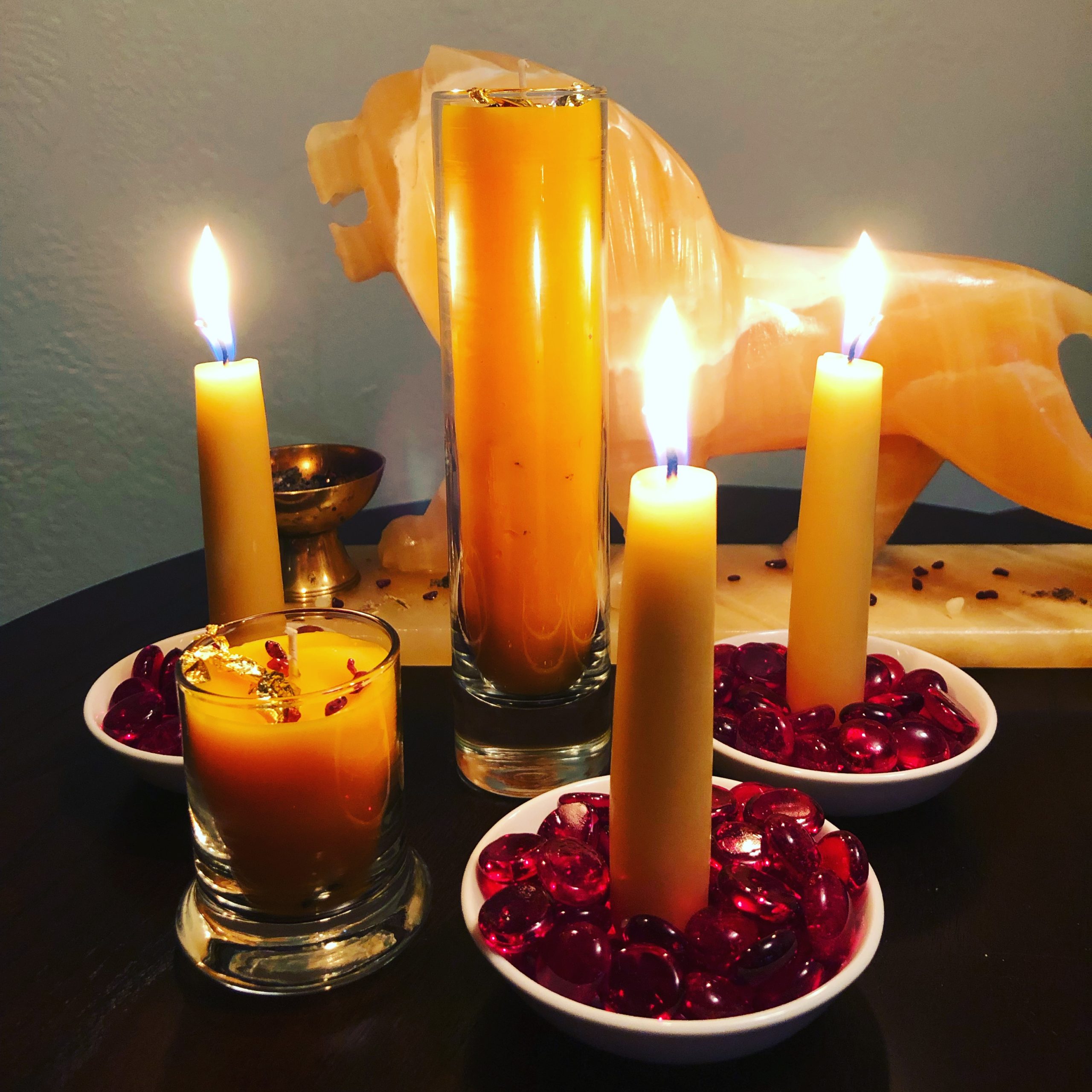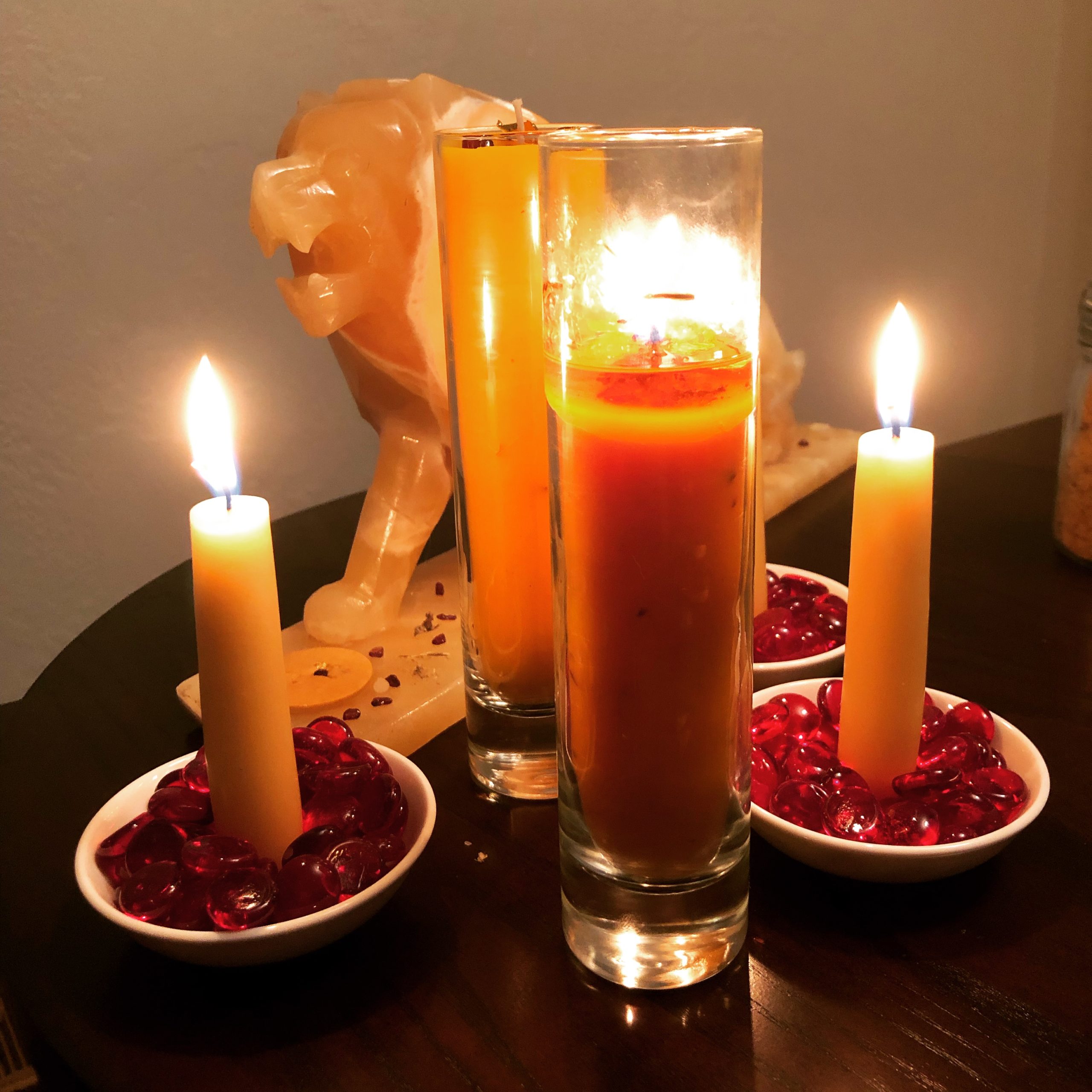 Available in glass jars marked on the bottom with hand drawn golden Regulus glyph. Prayer candle style for $168, or 2 oz for $90