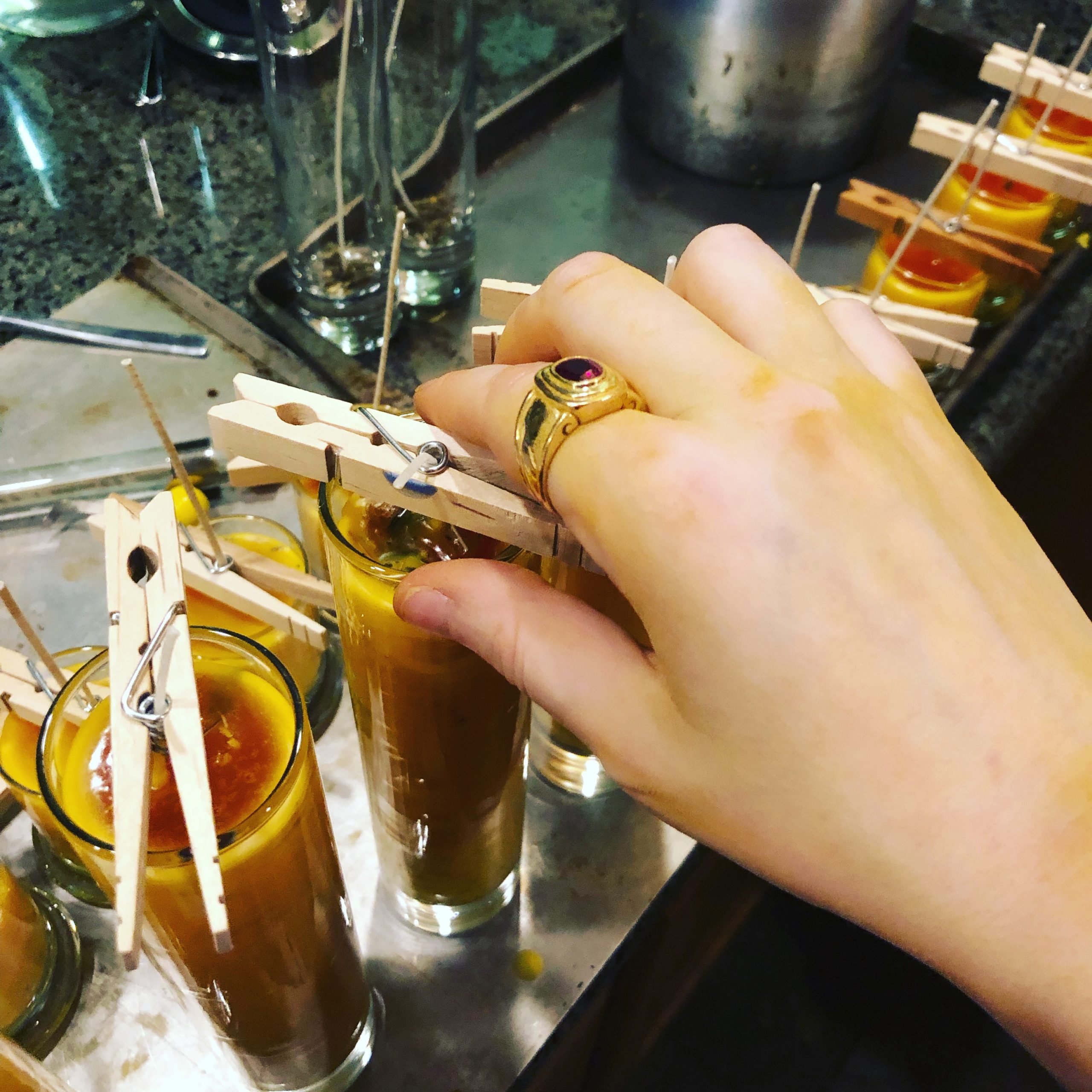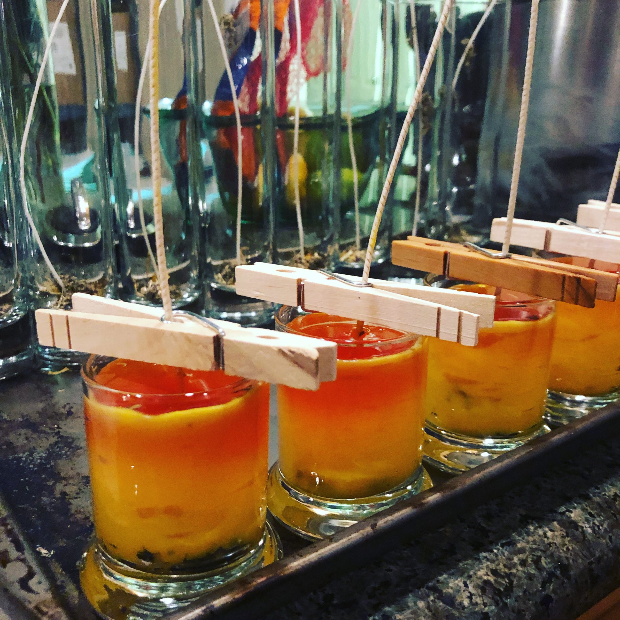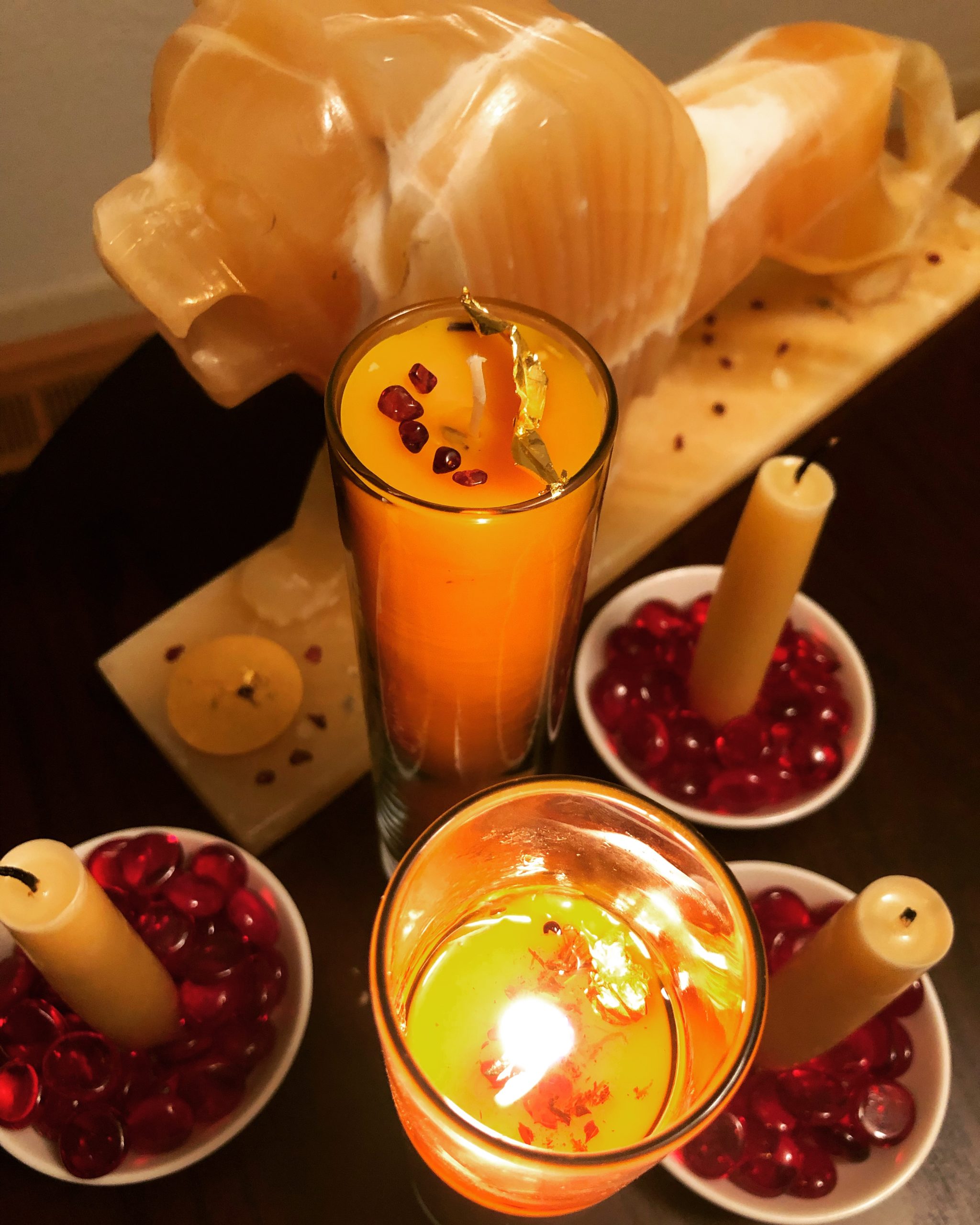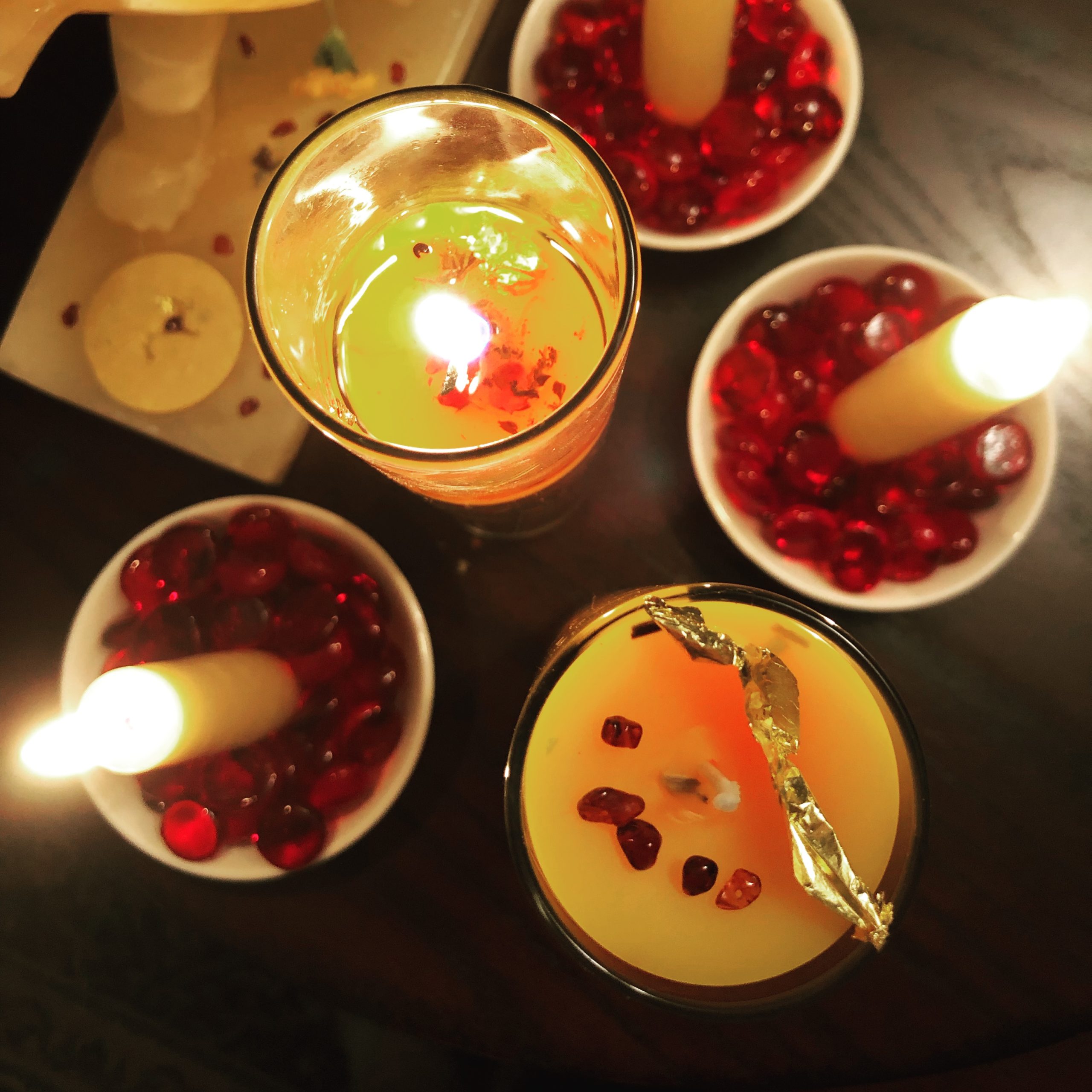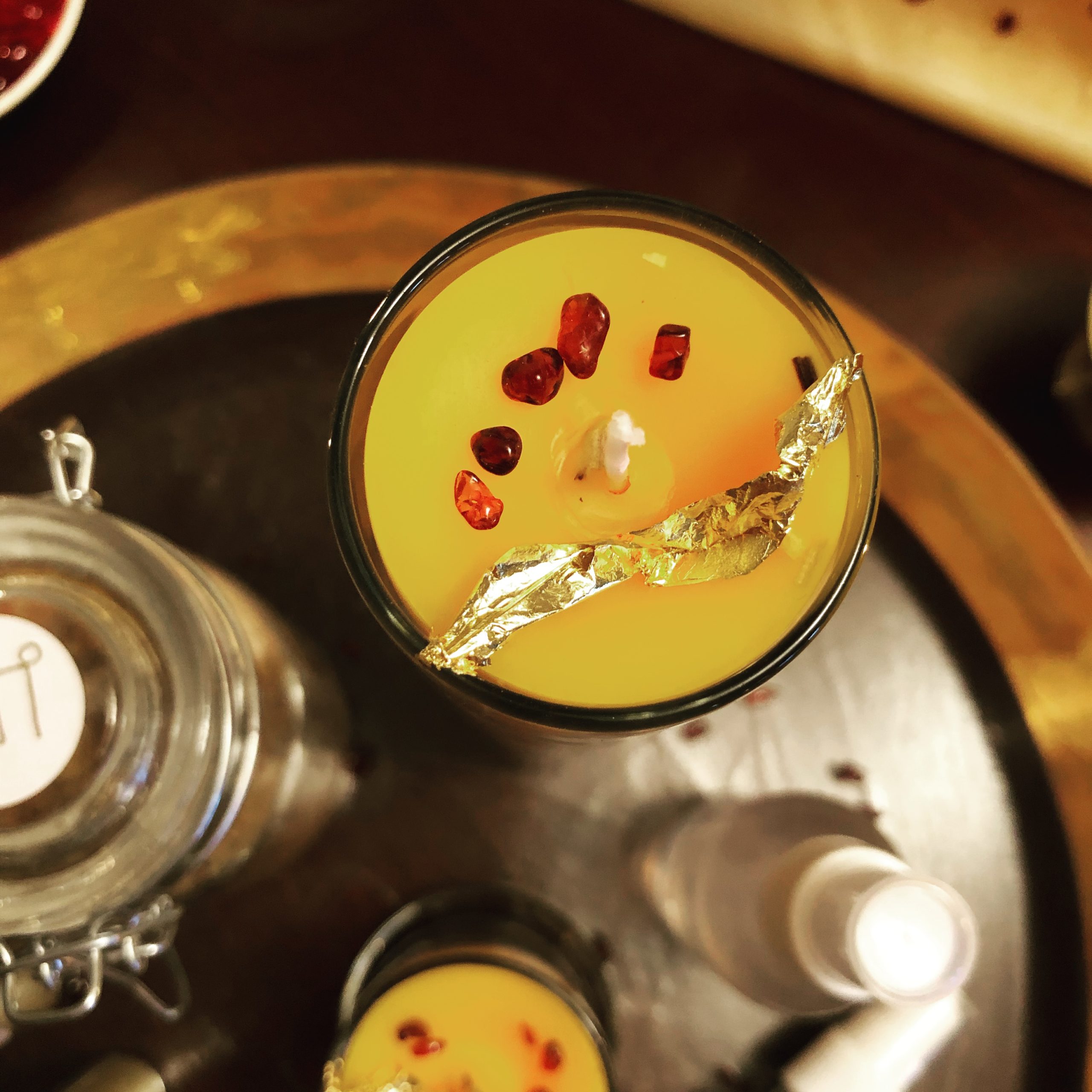 Virgin beeswax dyed rich yellow, poured over mugwort, wormwood, and mastic, topped with 24k gold and six garnets, in a similar style to the Regulus candles from the maiden series.