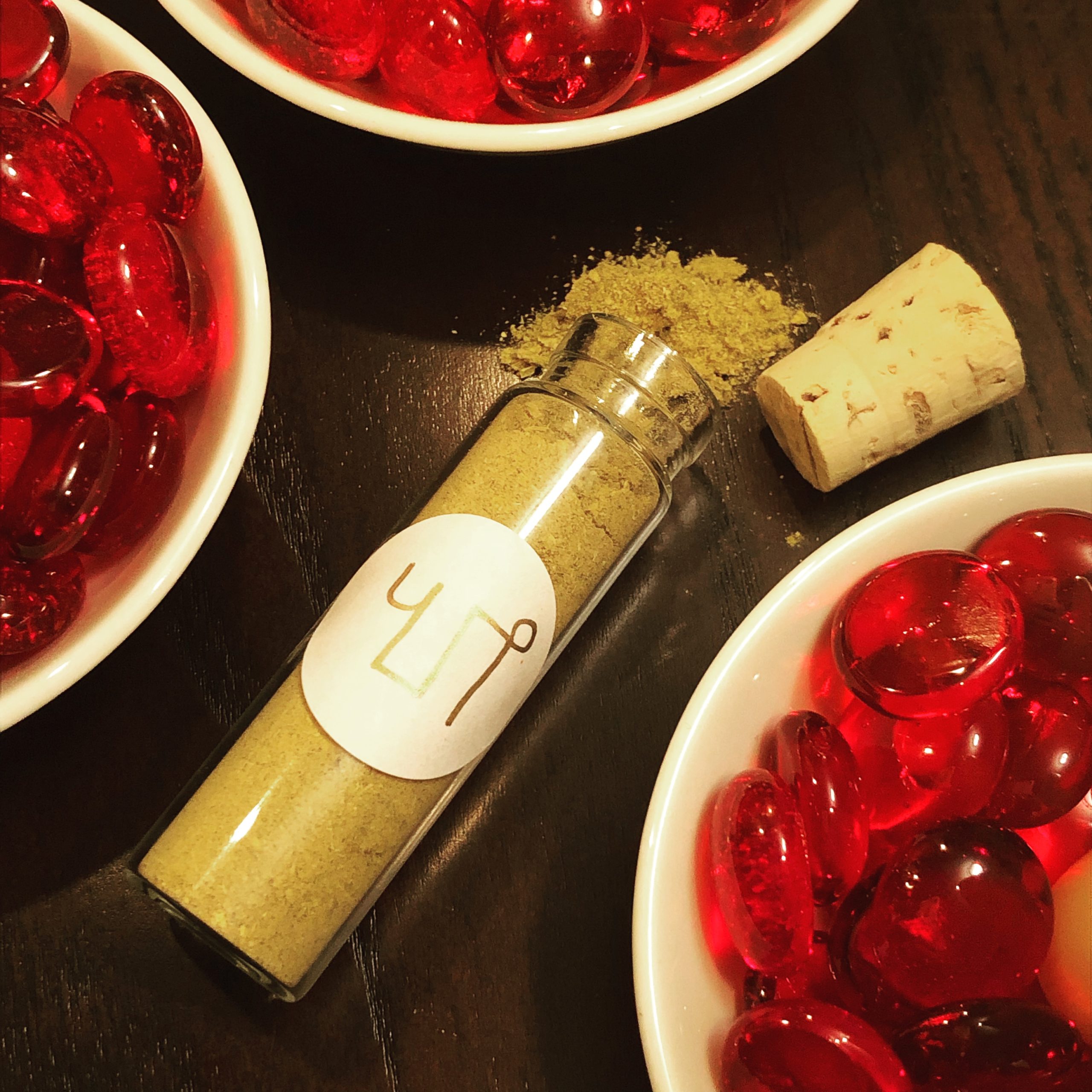 Customary material and herbs associated with Regulus include mugwort, mastic, garnet, wormwood, and celandine. These, along with frankincense, 24k gold, saffron, chrysanthemum, yellow trumpet flower, calendula, dandelion root, orange peel, red ginseng, and other plants allied to the powers of empowerment, light, and leadership, were ritually suffumigated, consecrated, and mixed as the Moon conjoined Regulus on the rising, in the hour of Jupiter.
