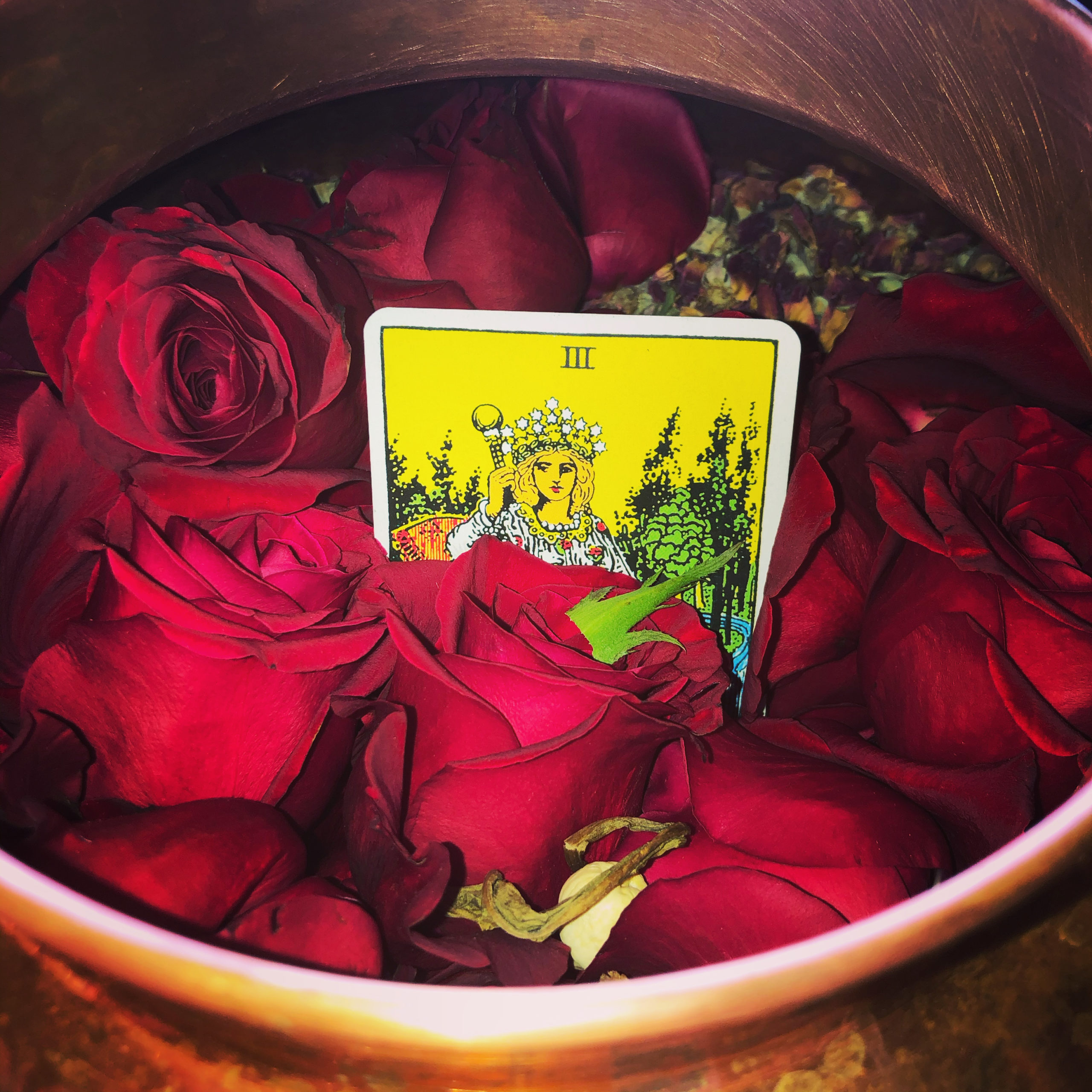 An Empress tarot card was distilled within the Rose pot, and freshly created malachite talismans, alongside sundry herbs and woods renowned in Hoodoo and Conjure for seduction, sweetening, and the promotion of desirability, the Water Lily.