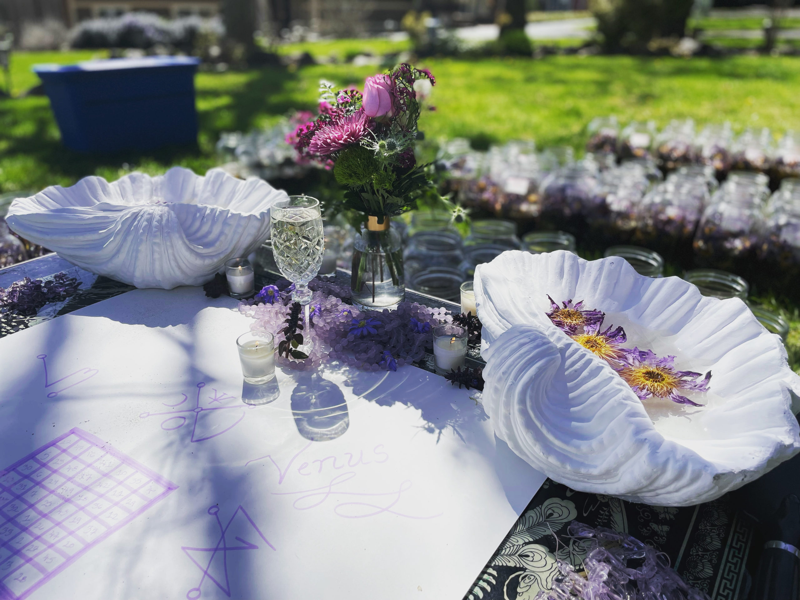 Organic ingredients, fumigated and combined during the Exalted Venus II election: jojoba oil, lavender flowers, blue lotus, valerian root, ashwagandha, fenugreek, chamomile, marjoram, meadowsweet, spearmint, yarrow, passionflower, lemon balm, red clover blossom, purple jade, and pink amethyst.