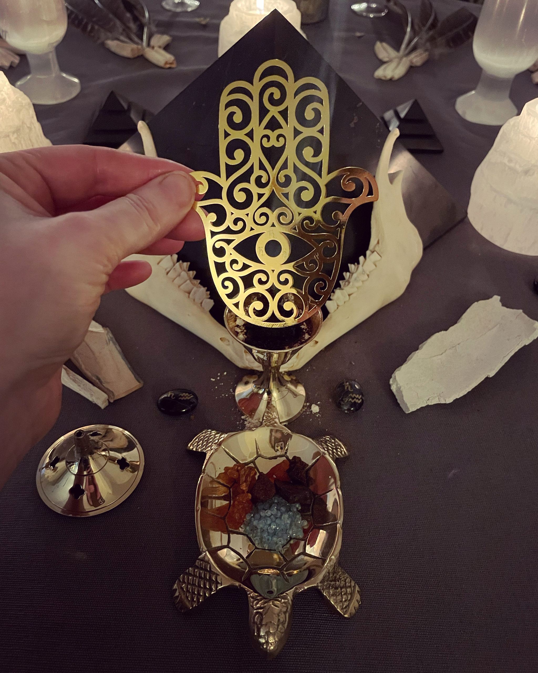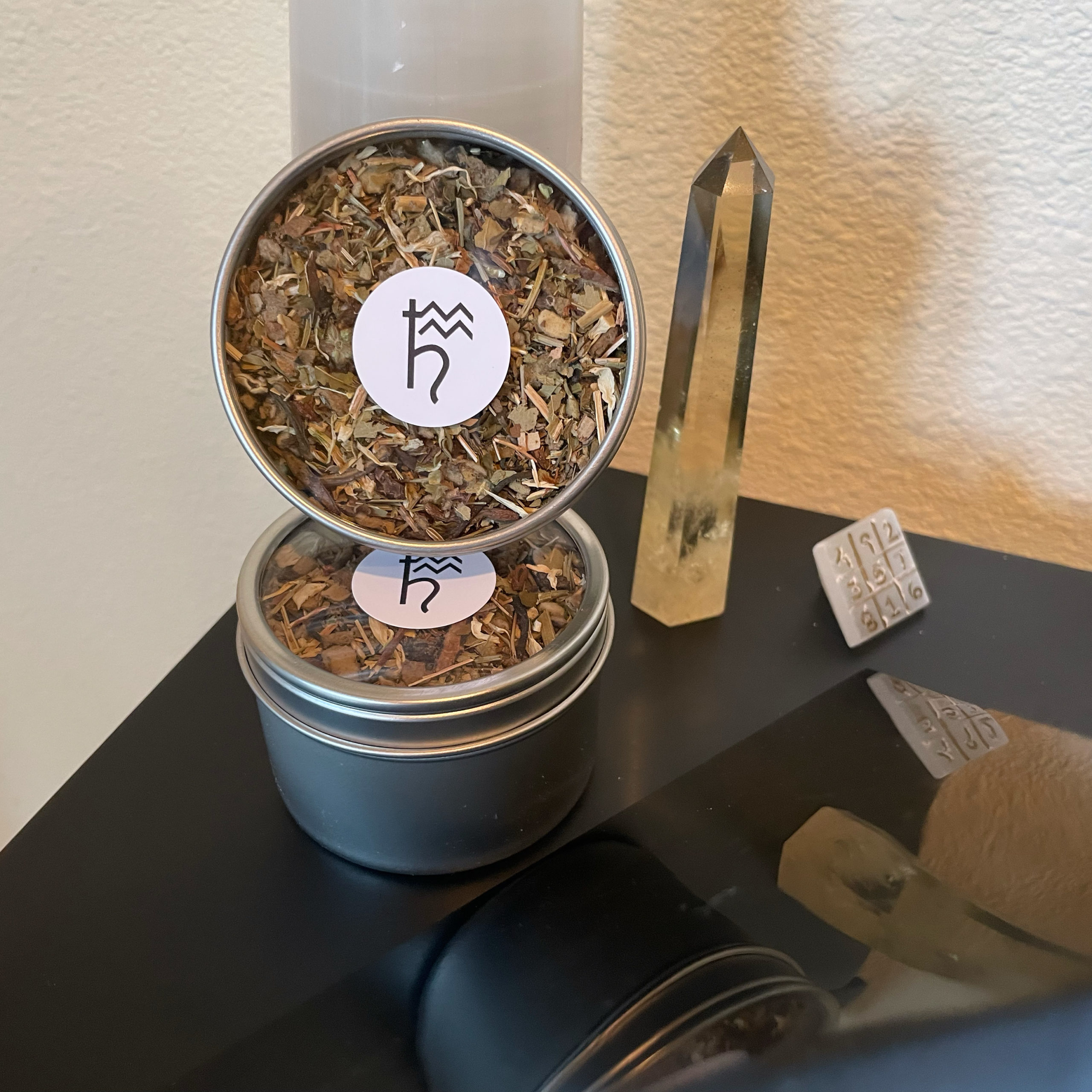 100% organic ingredients, fumigated with myrrh at the height of our Saturn in Aquarius election: solomon’s seal, caraway, dandelion root, mullein, eucalyptus, nettle leaf, St. John’s wort, bladderwrack, oregon grape root, horsetail, skullcap, thyme, white chrysanthemum, white pu’erh tea, shepherd’s purse, parsley